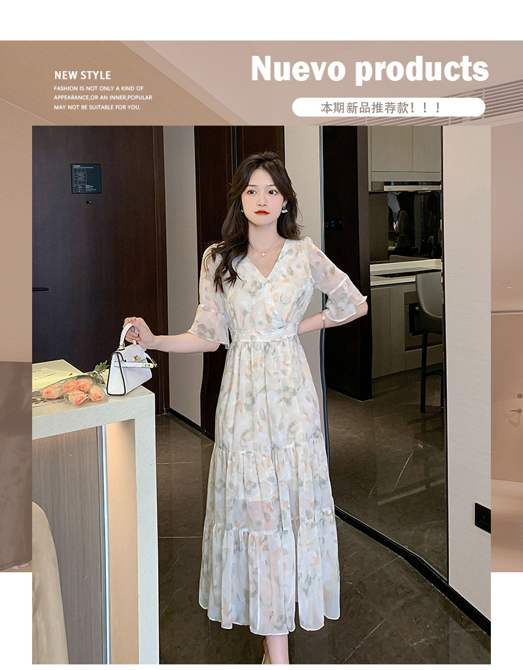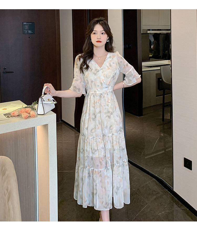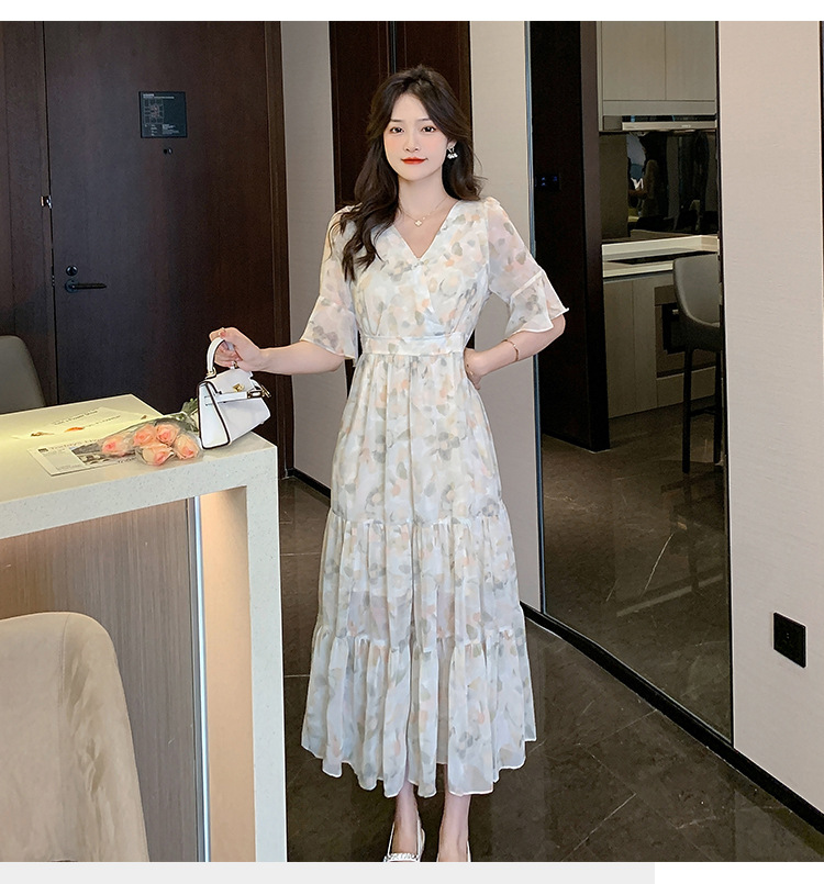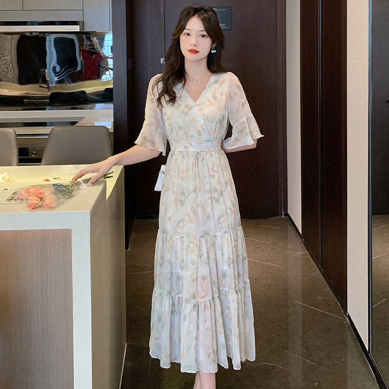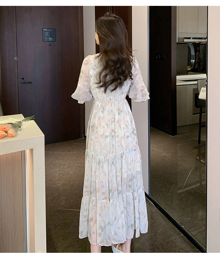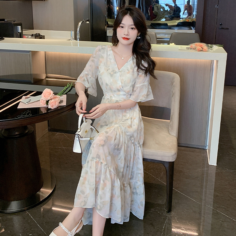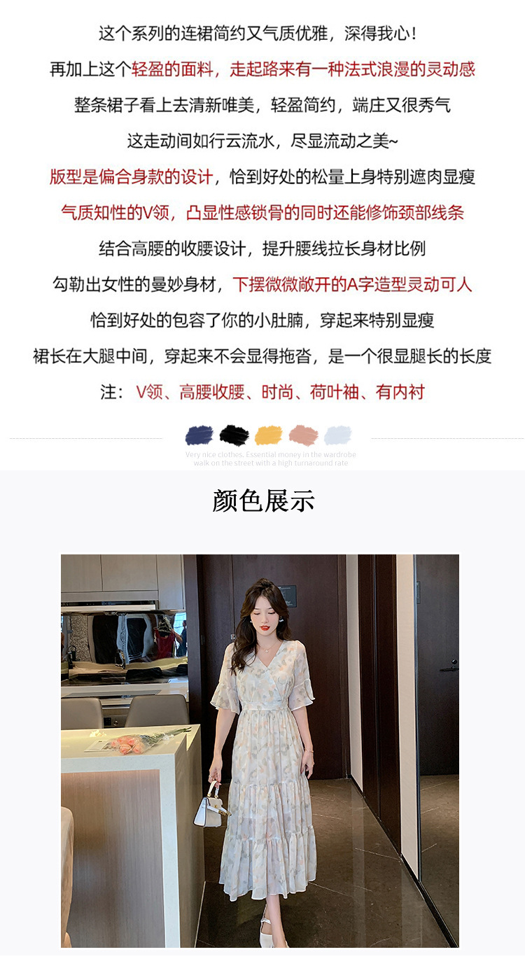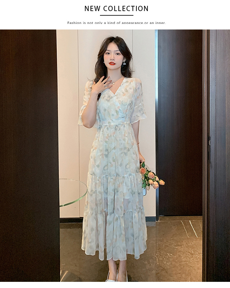 雪纺碎花短袖连衣裙夏装新款显瘦韩系法式高级感长裙过膝裙子女