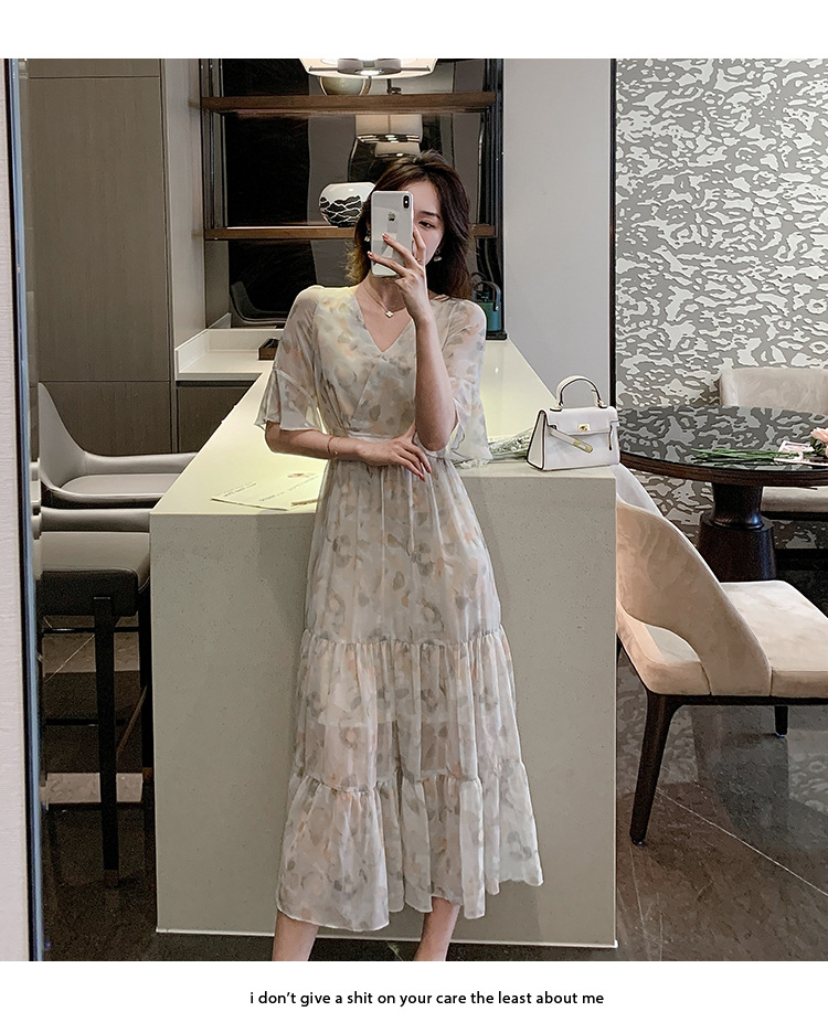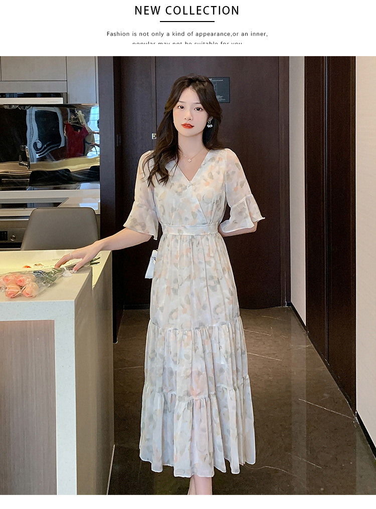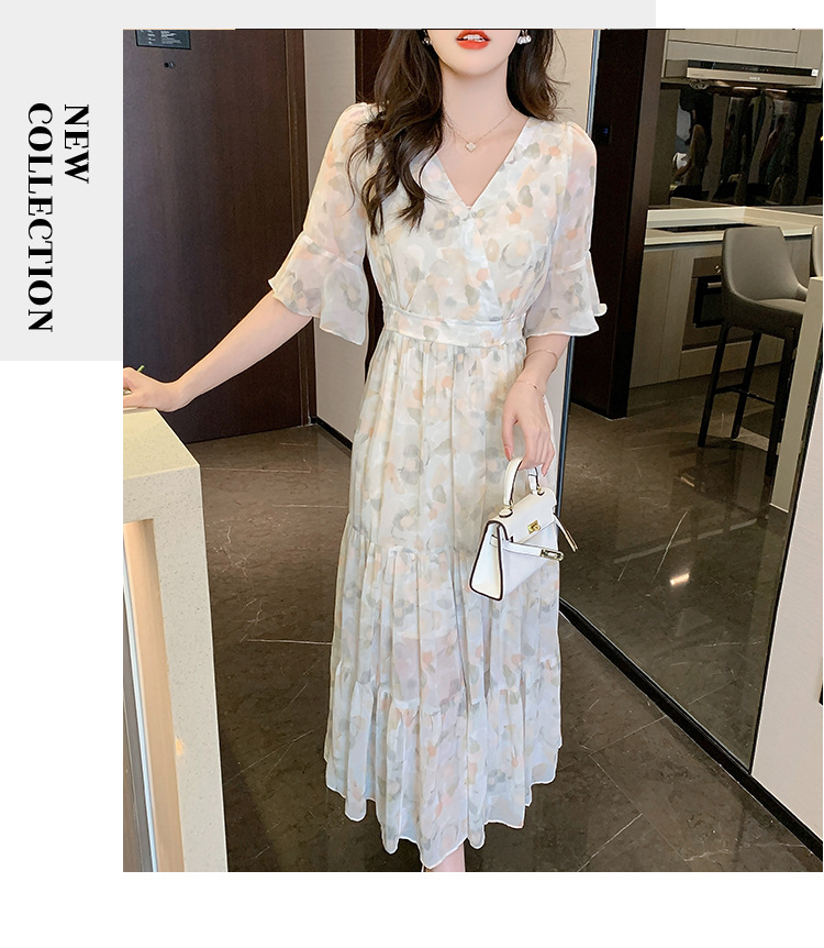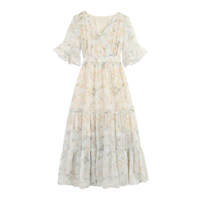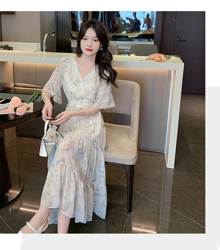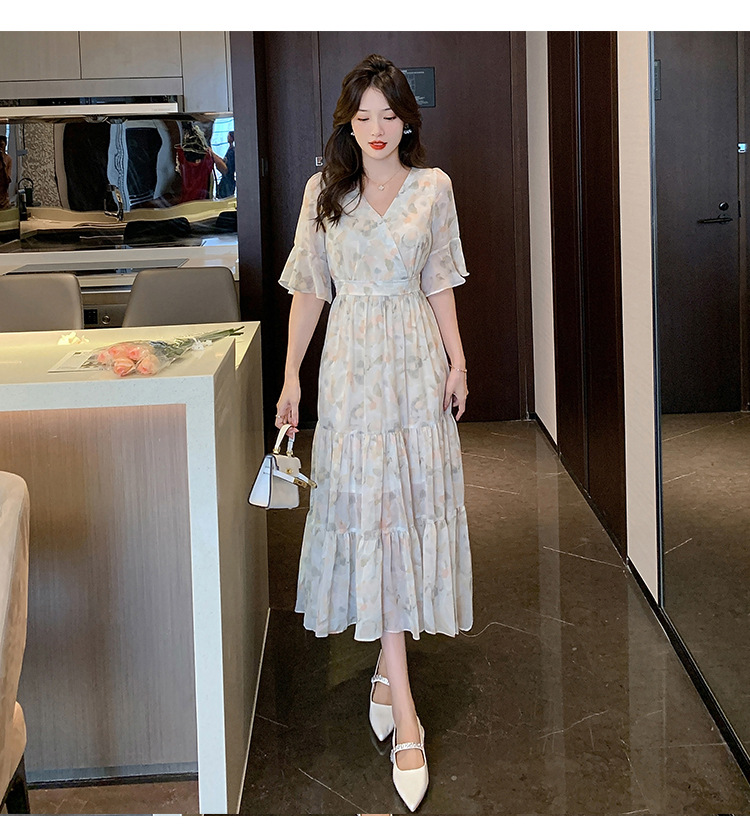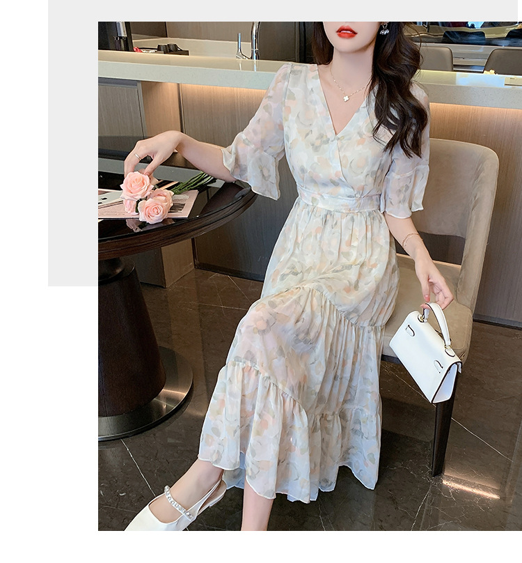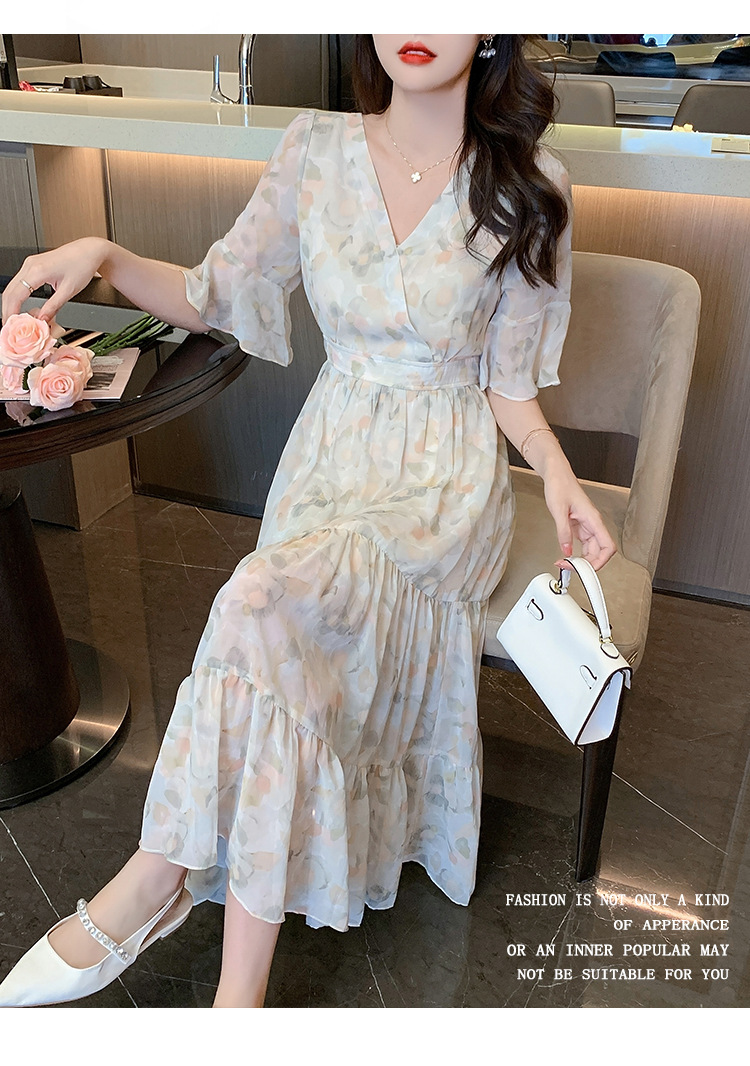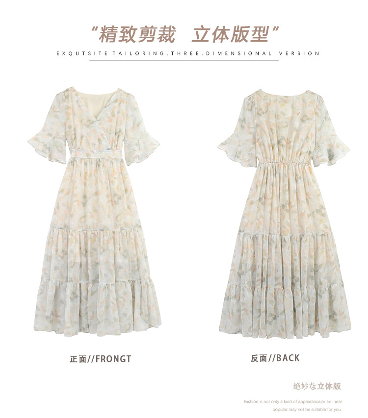 雪纺碎花短袖连衣裙夏装新款显瘦韩系法式高级感长裙过膝裙子女