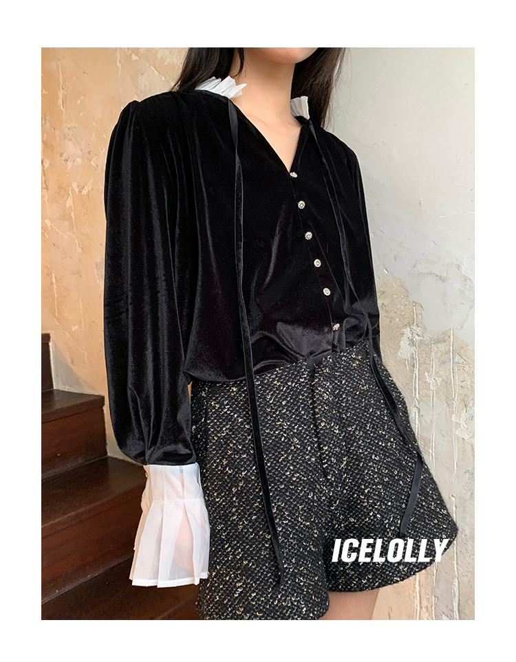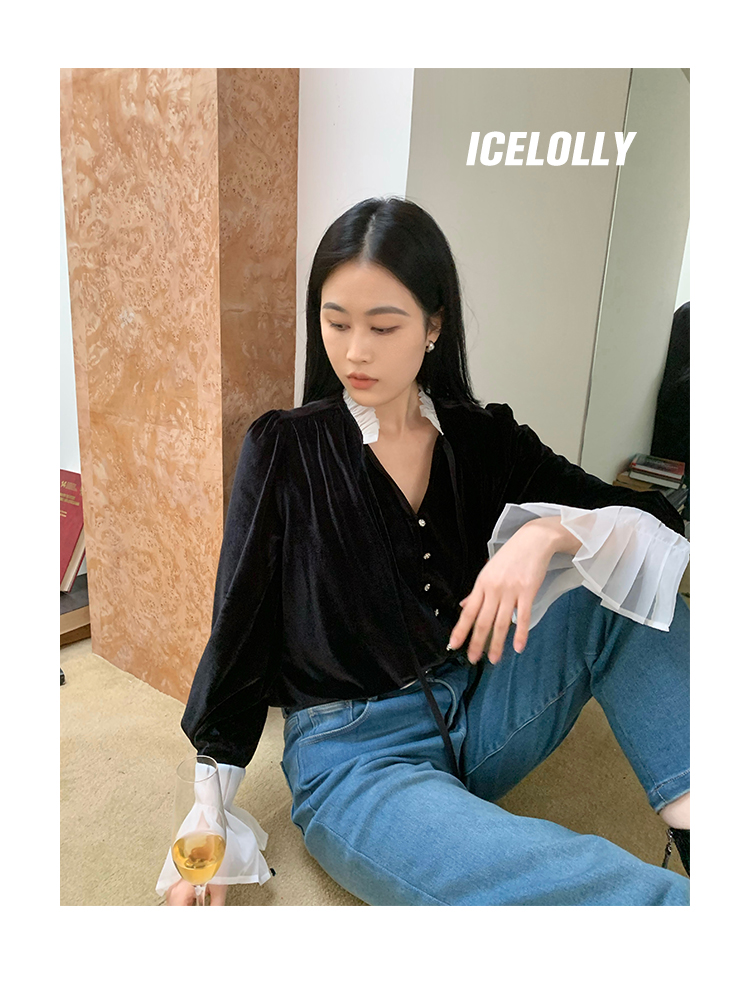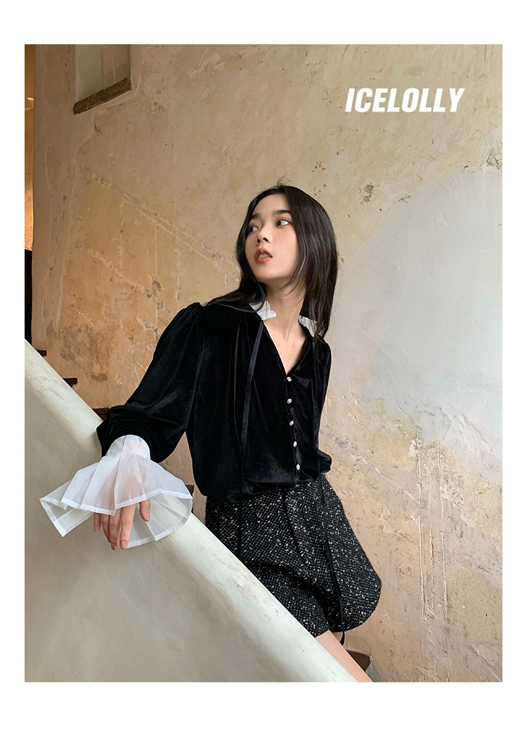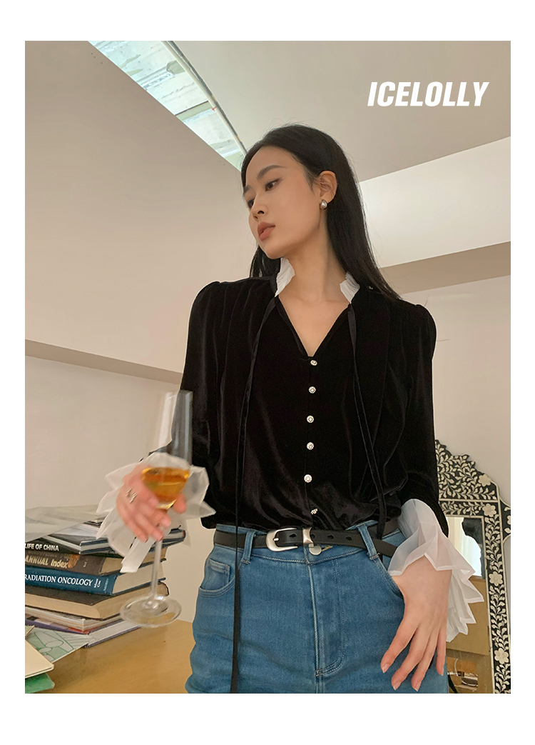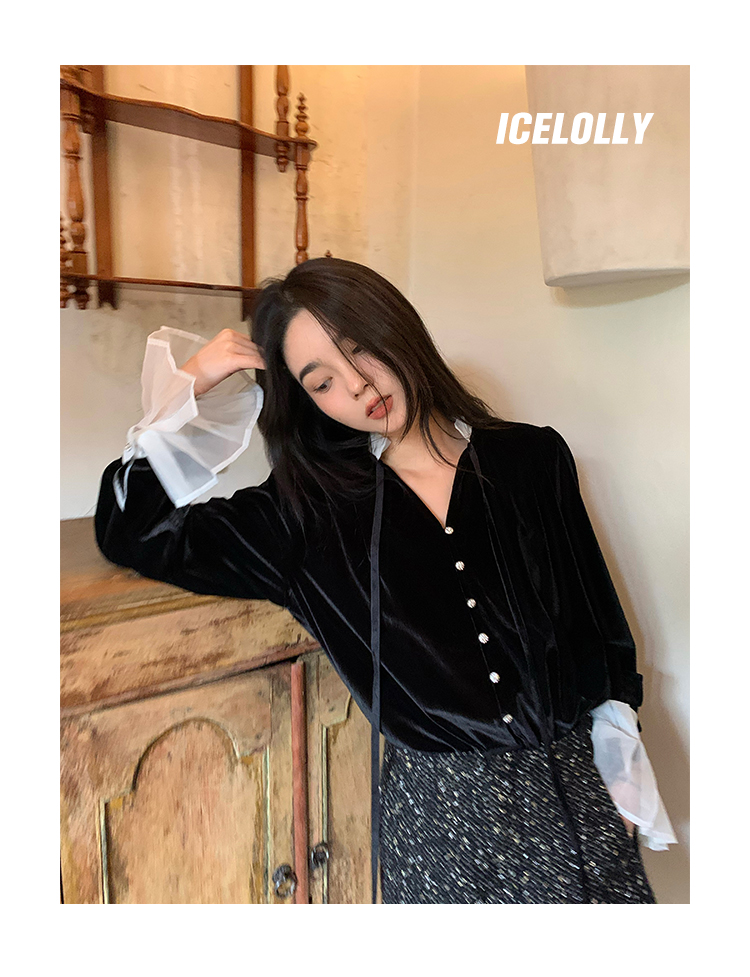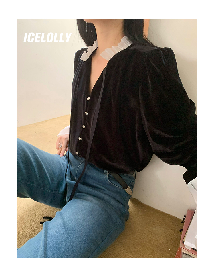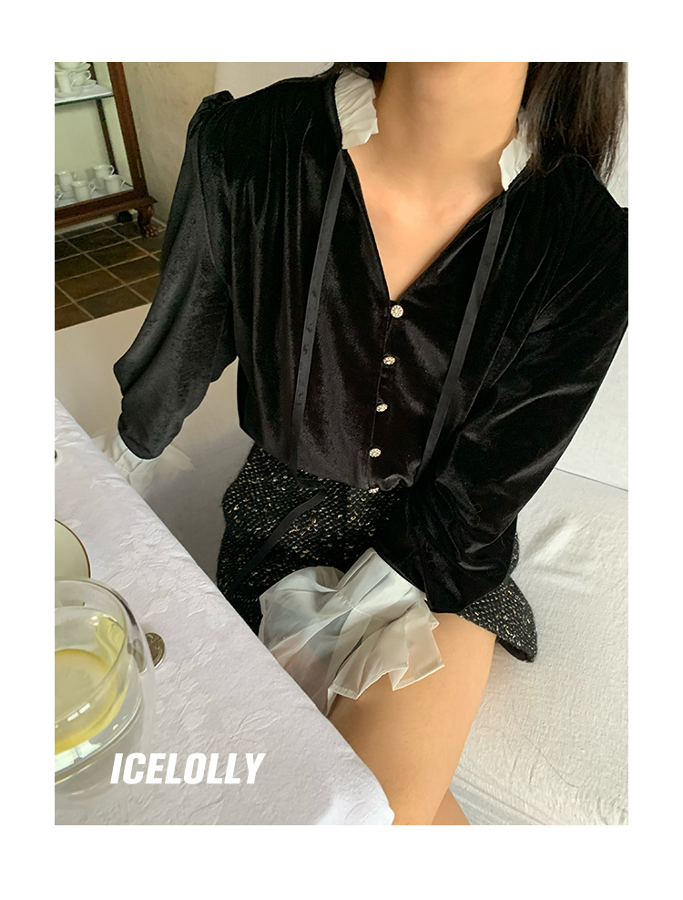 ICELOLLY法式黑色絲絨襯衫女早春季上衣V領內搭襯衫別致漂亮小衫