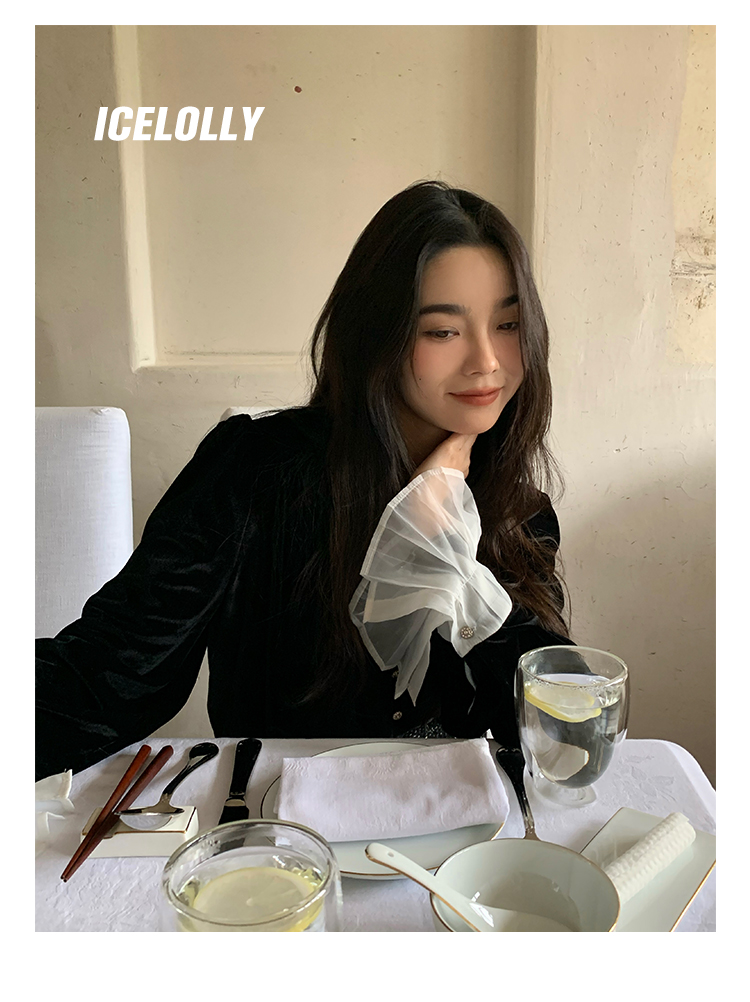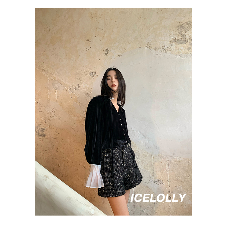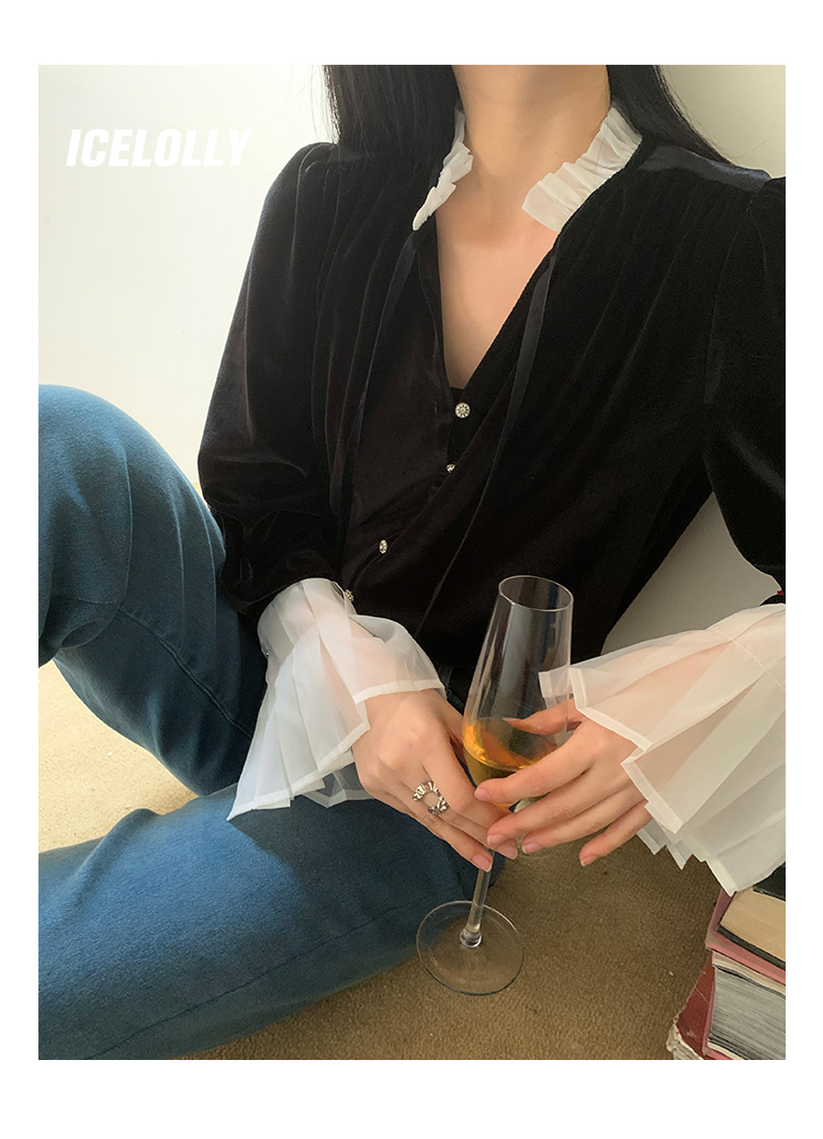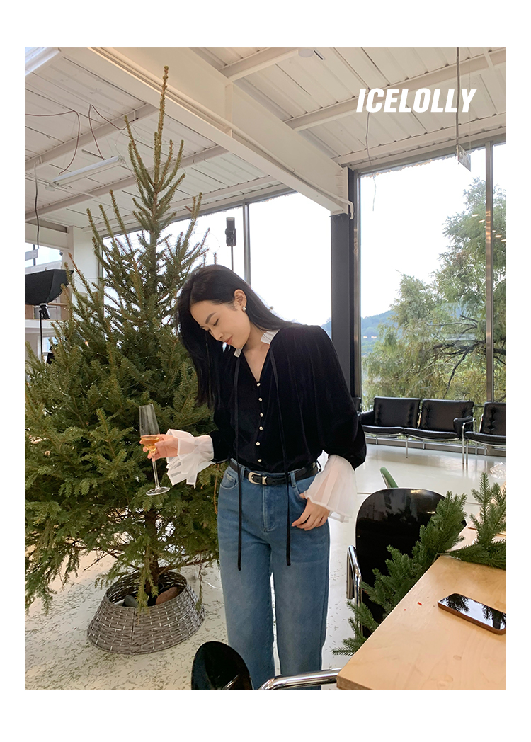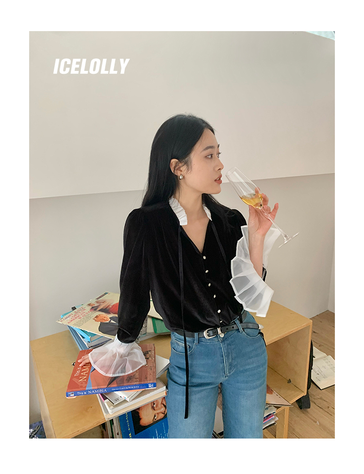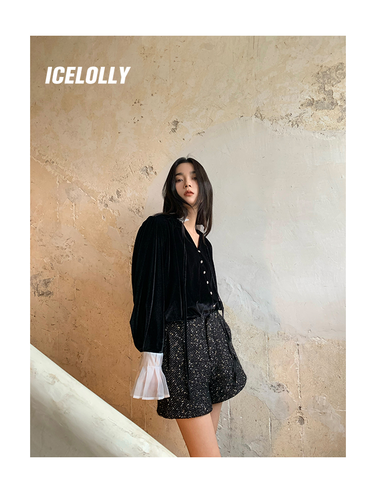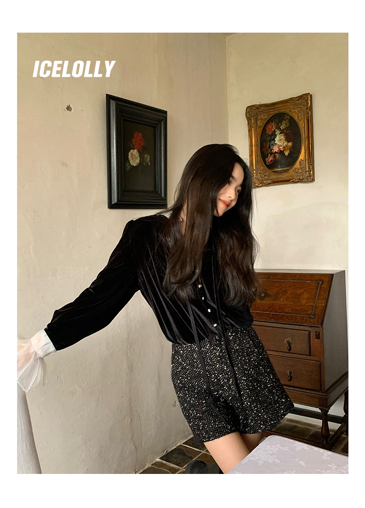 ICELOLLY法式黑色絲絨襯衫女早春季上衣V領內搭襯衫別致漂亮小衫