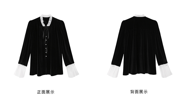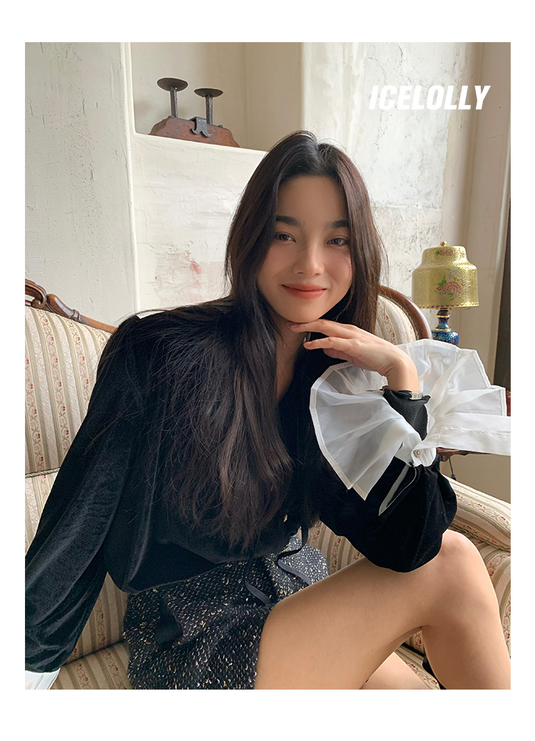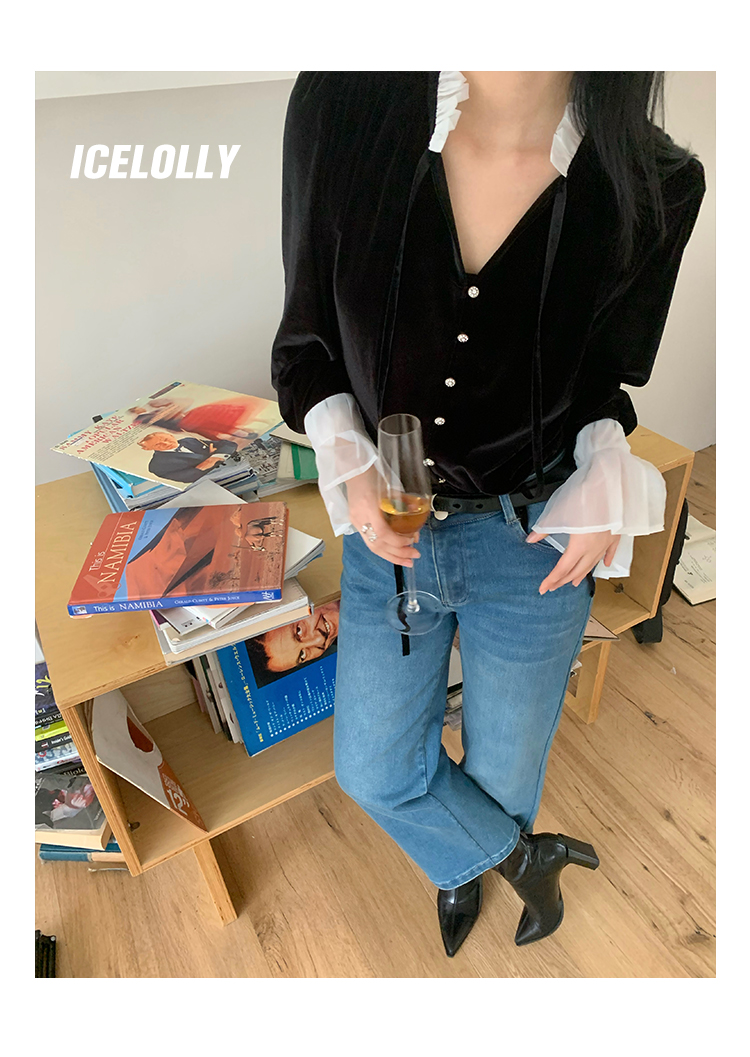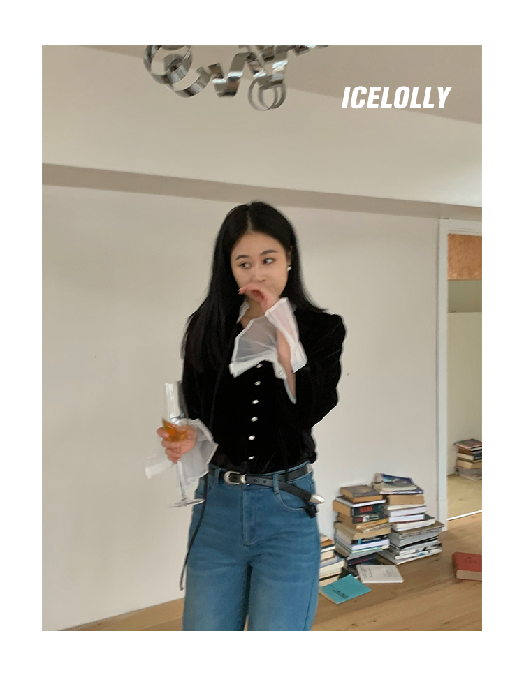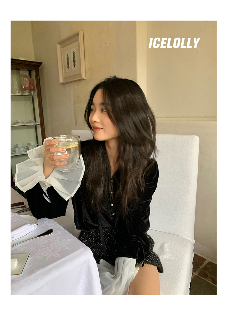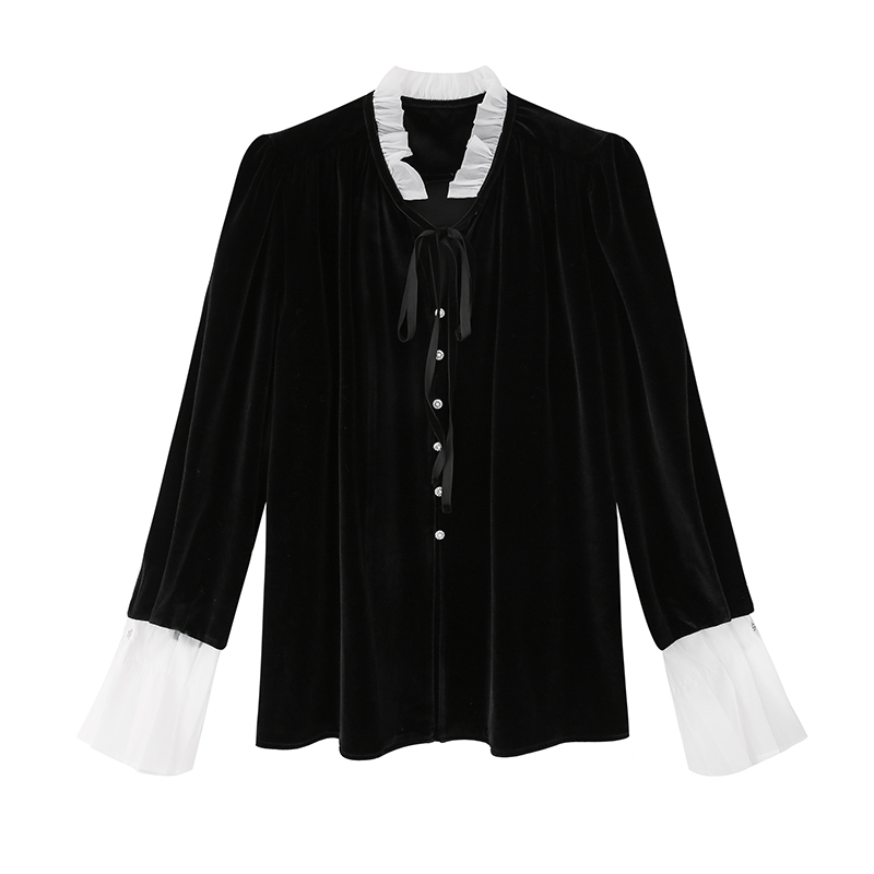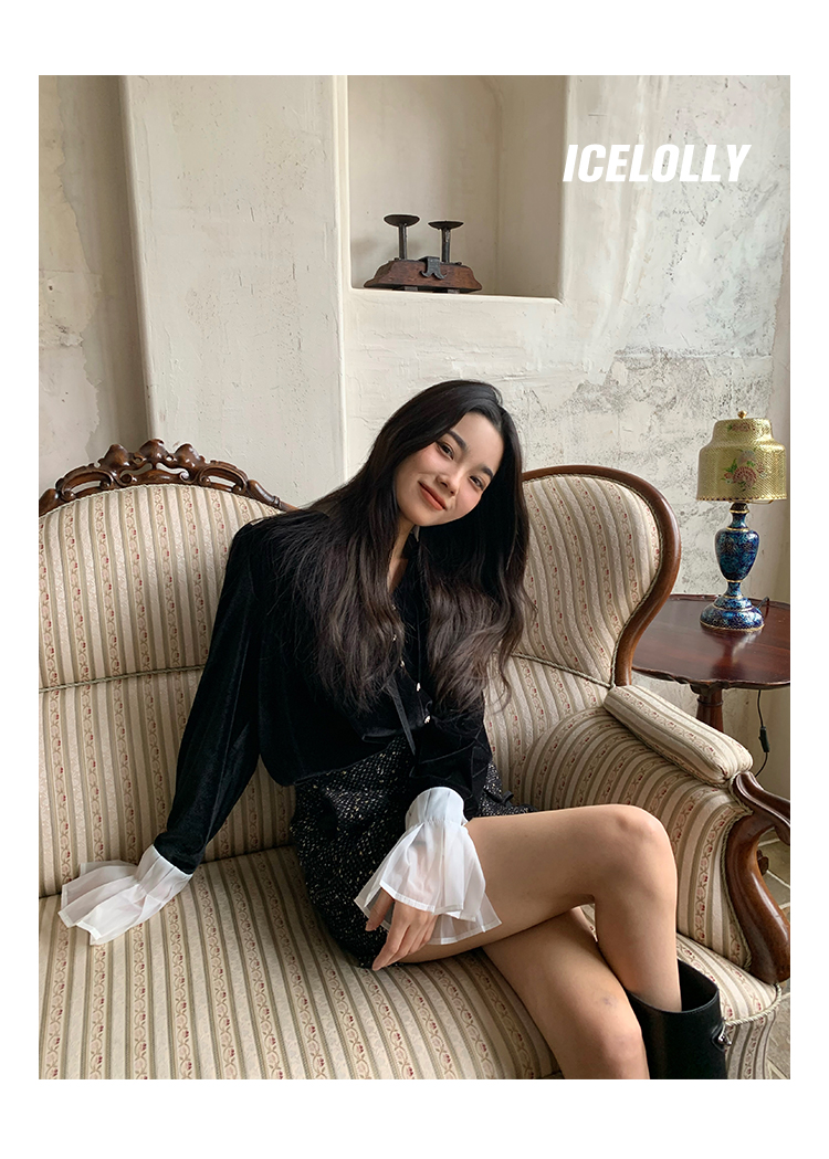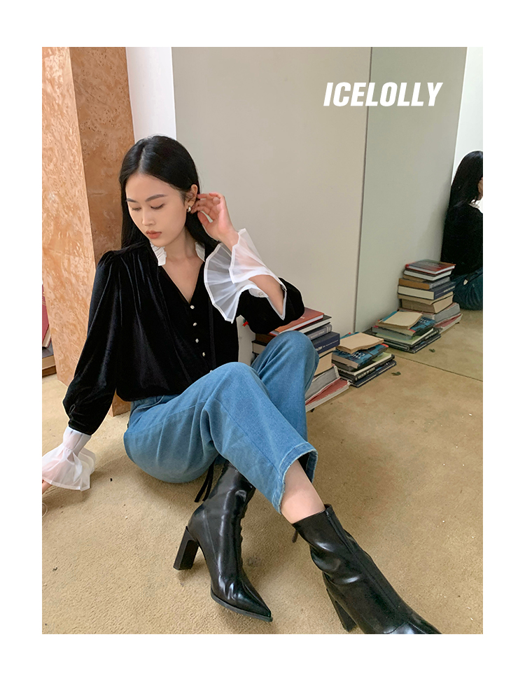 ICELOLLY法式黑色絲絨襯衫女早春季上衣V領內搭襯衫別致漂亮小衫