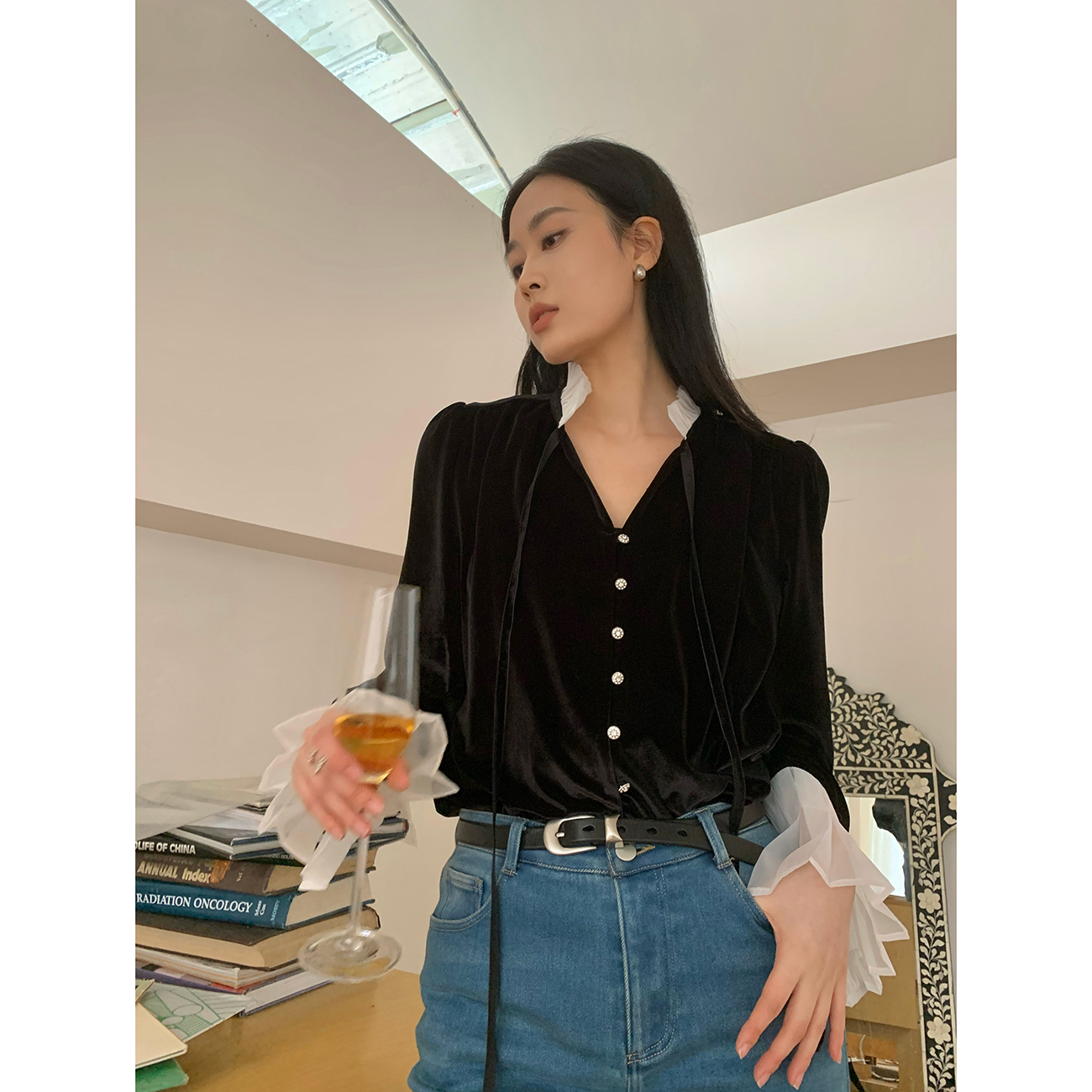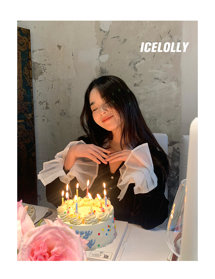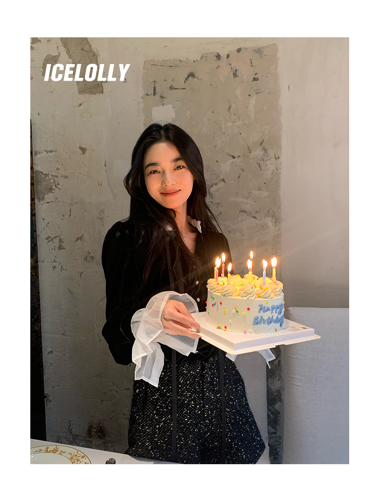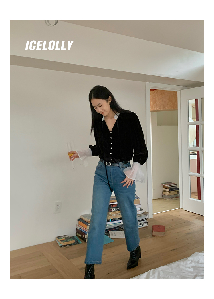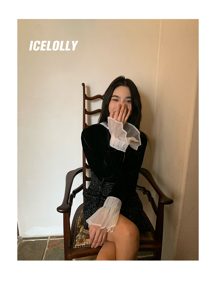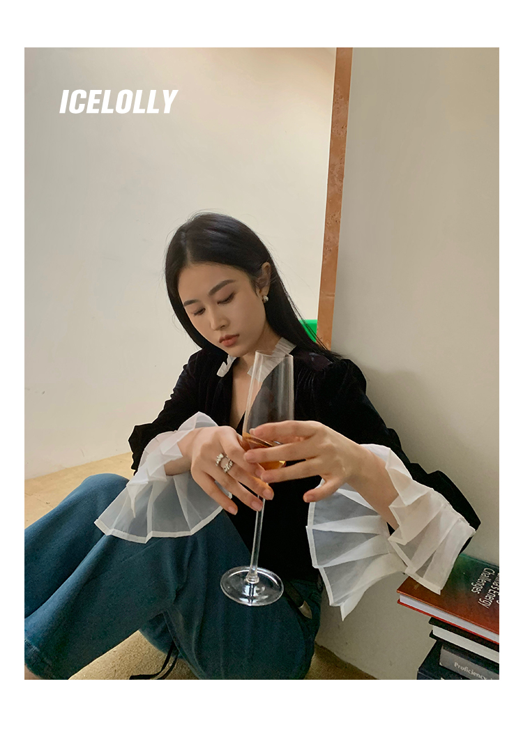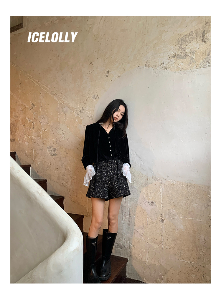 ICELOLLY法式黑色絲絨襯衫女早春季上衣V領內搭襯衫別致漂亮小衫