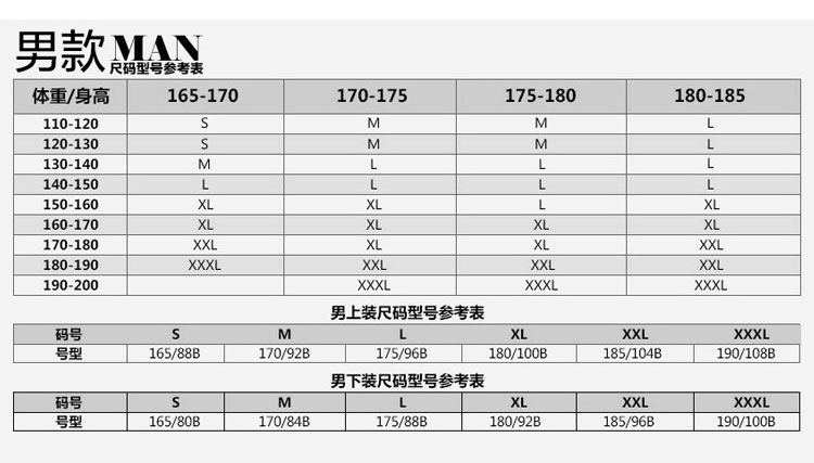 尺碼 S/165 M/170 L/175 XL/180 XXL/185 XXXL/190