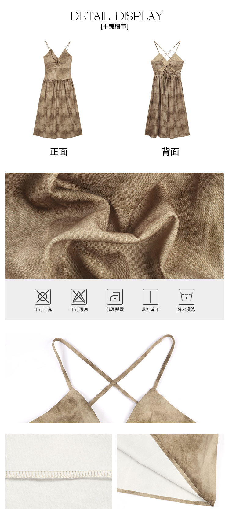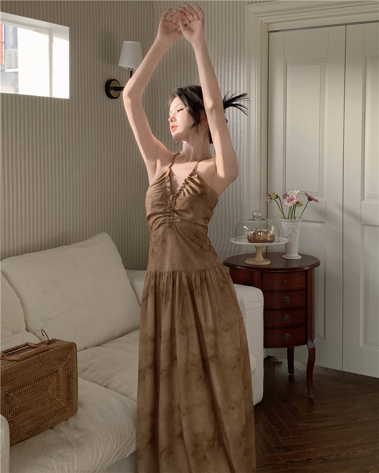 新中式掛頸吊帶V領洋裝女夏季露背收腰性感長裙純欲咖色a字裙子