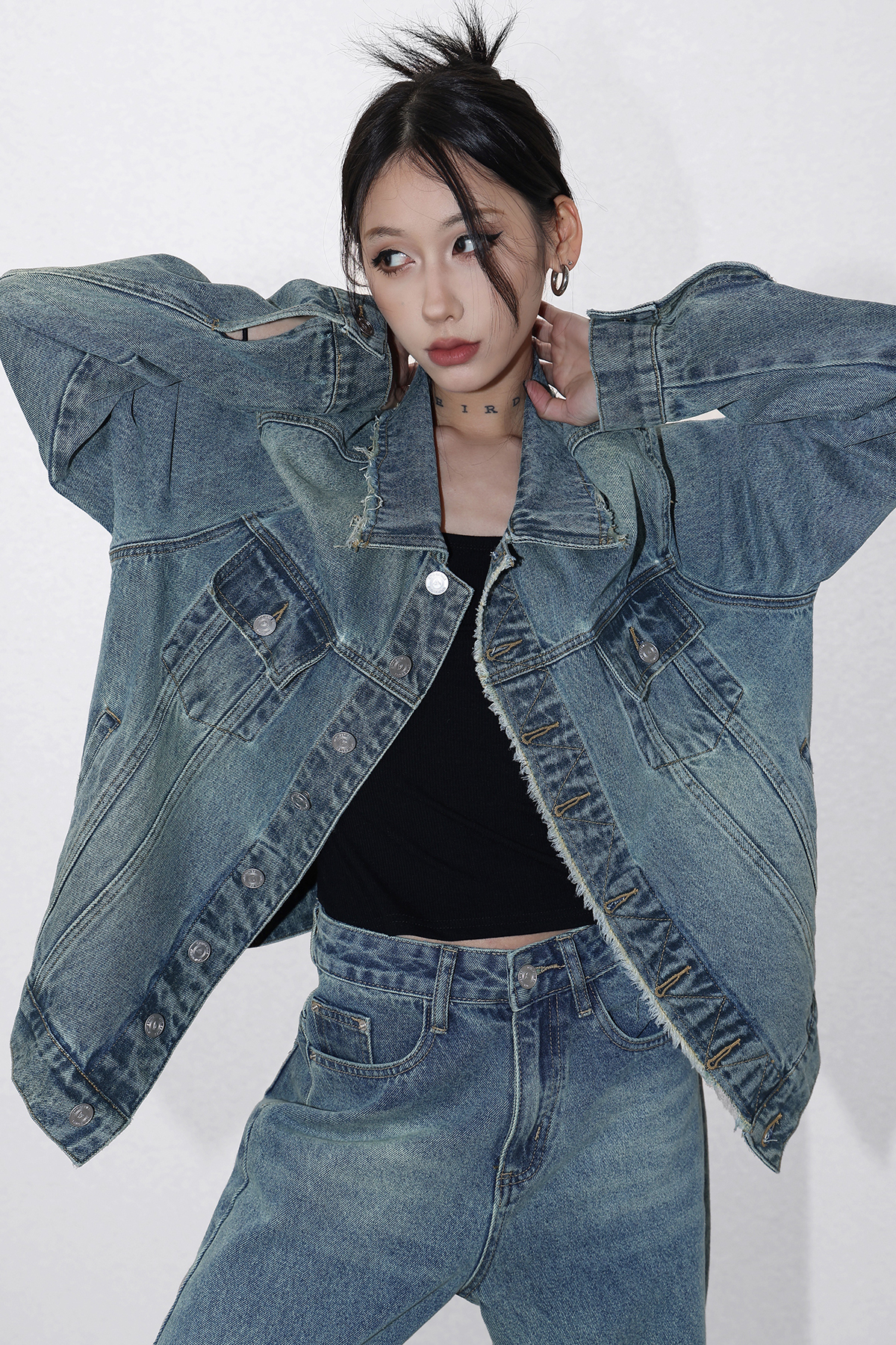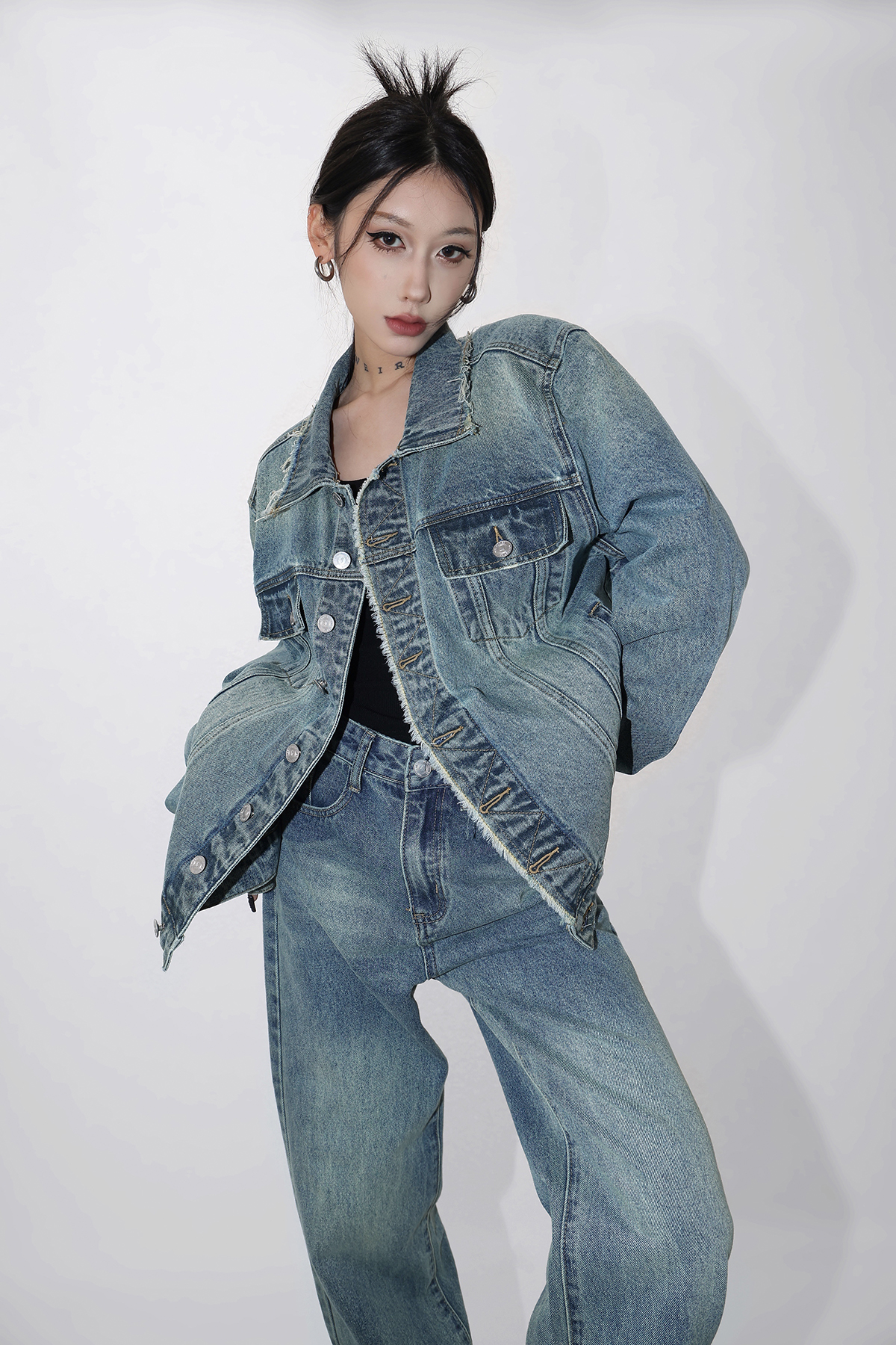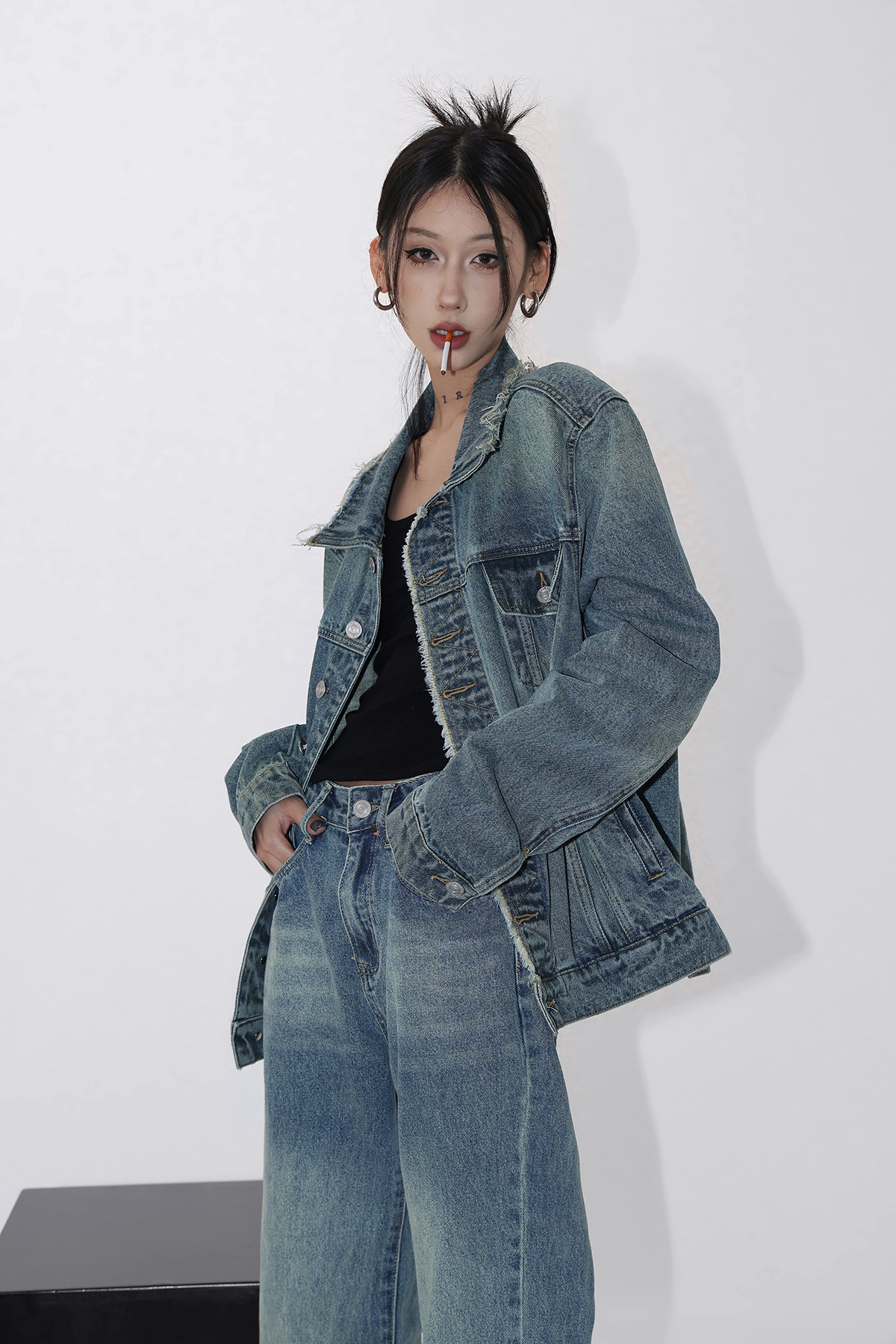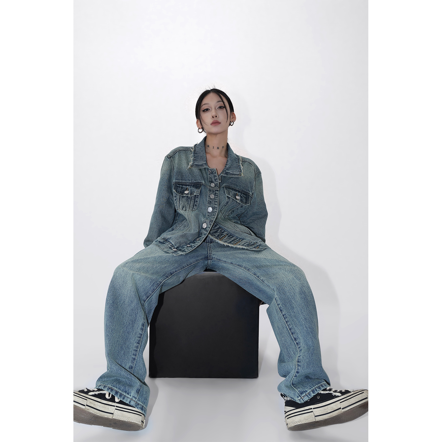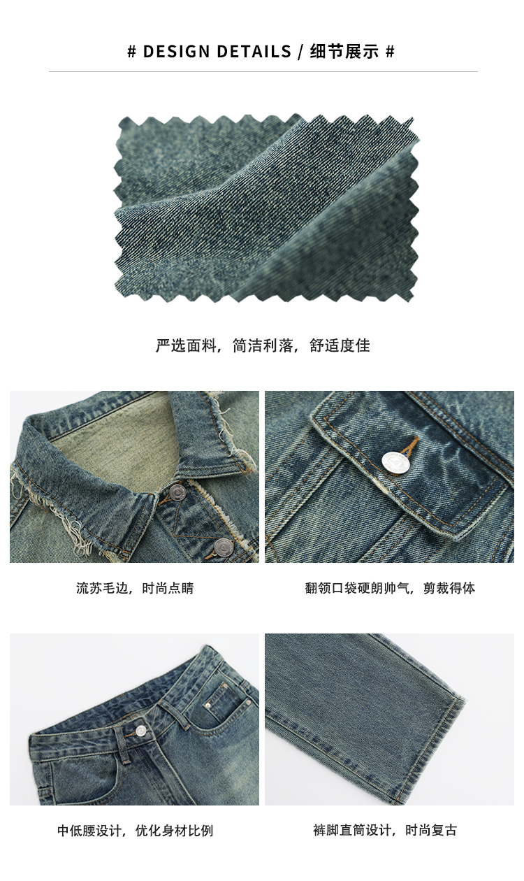 Acestudios 復古做舊牛仔衣+牛仔褲2件套女2023春秋新款牛仔外套