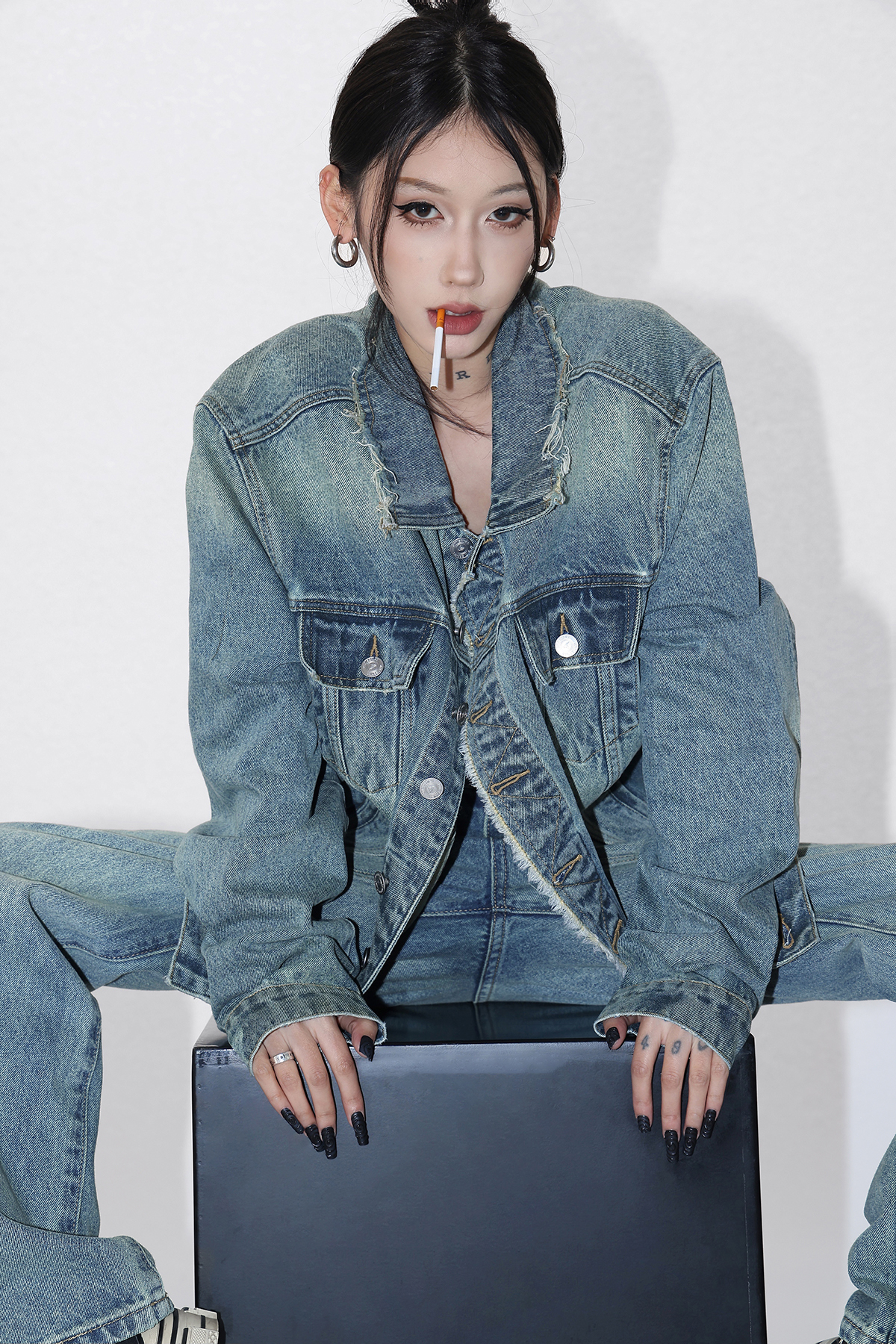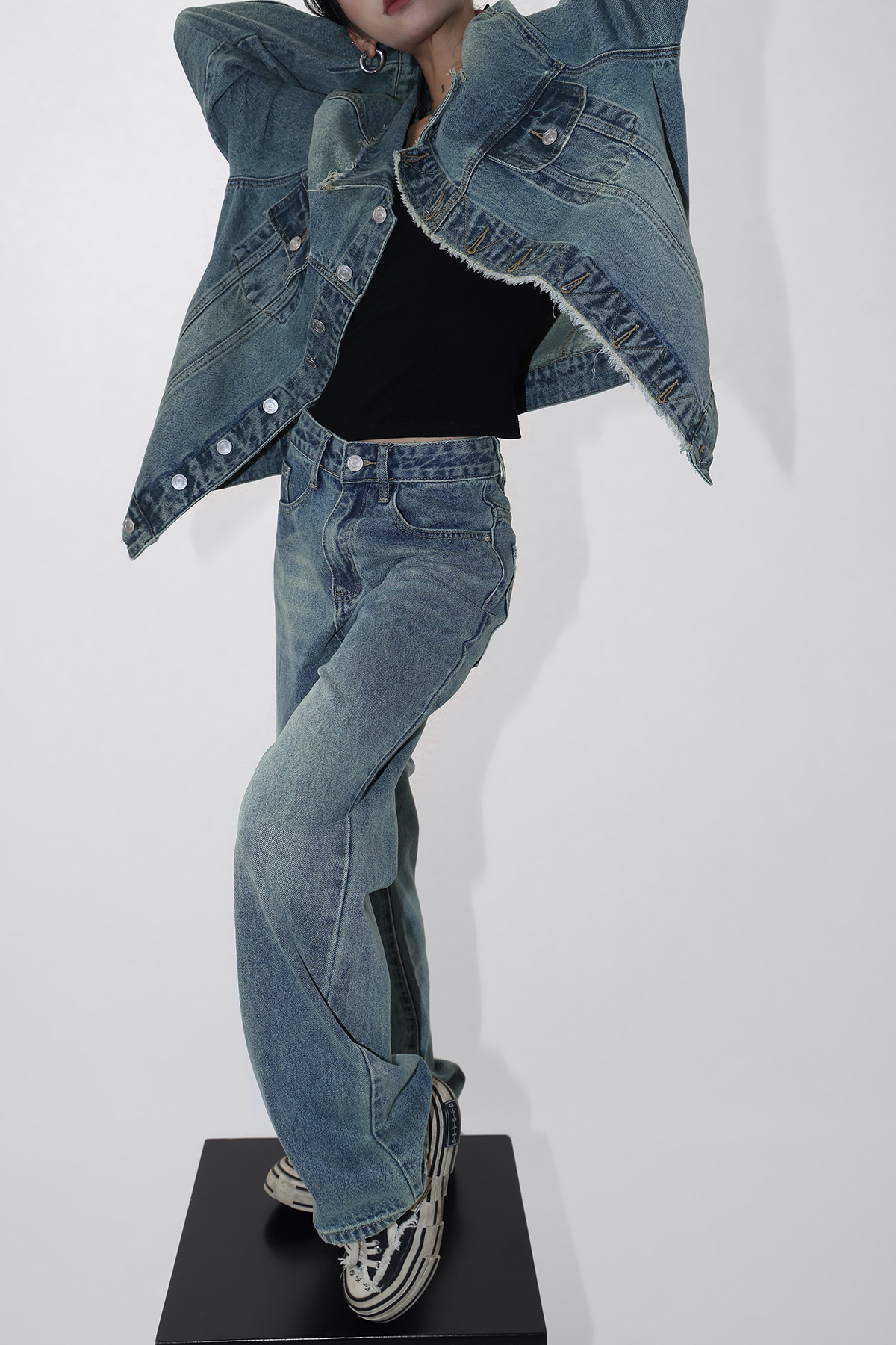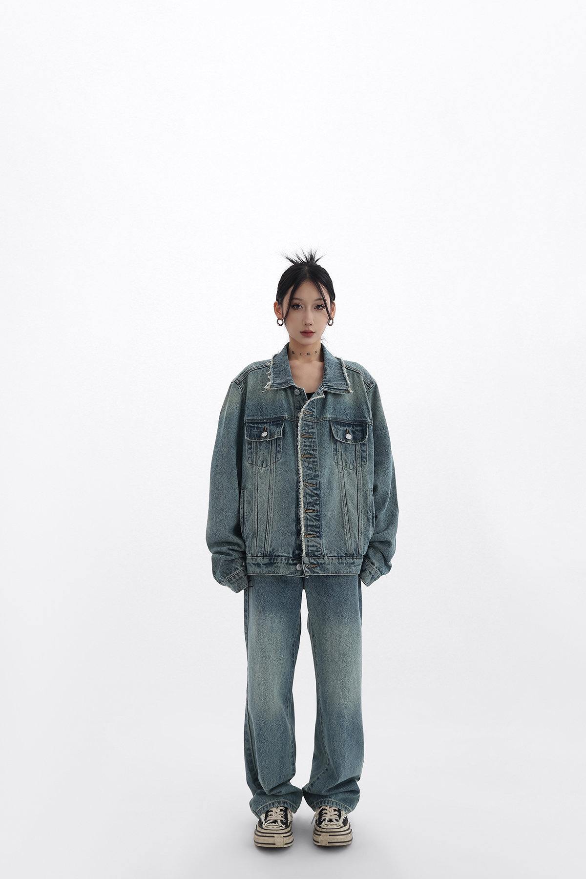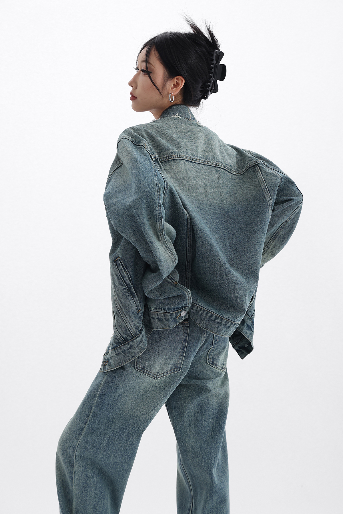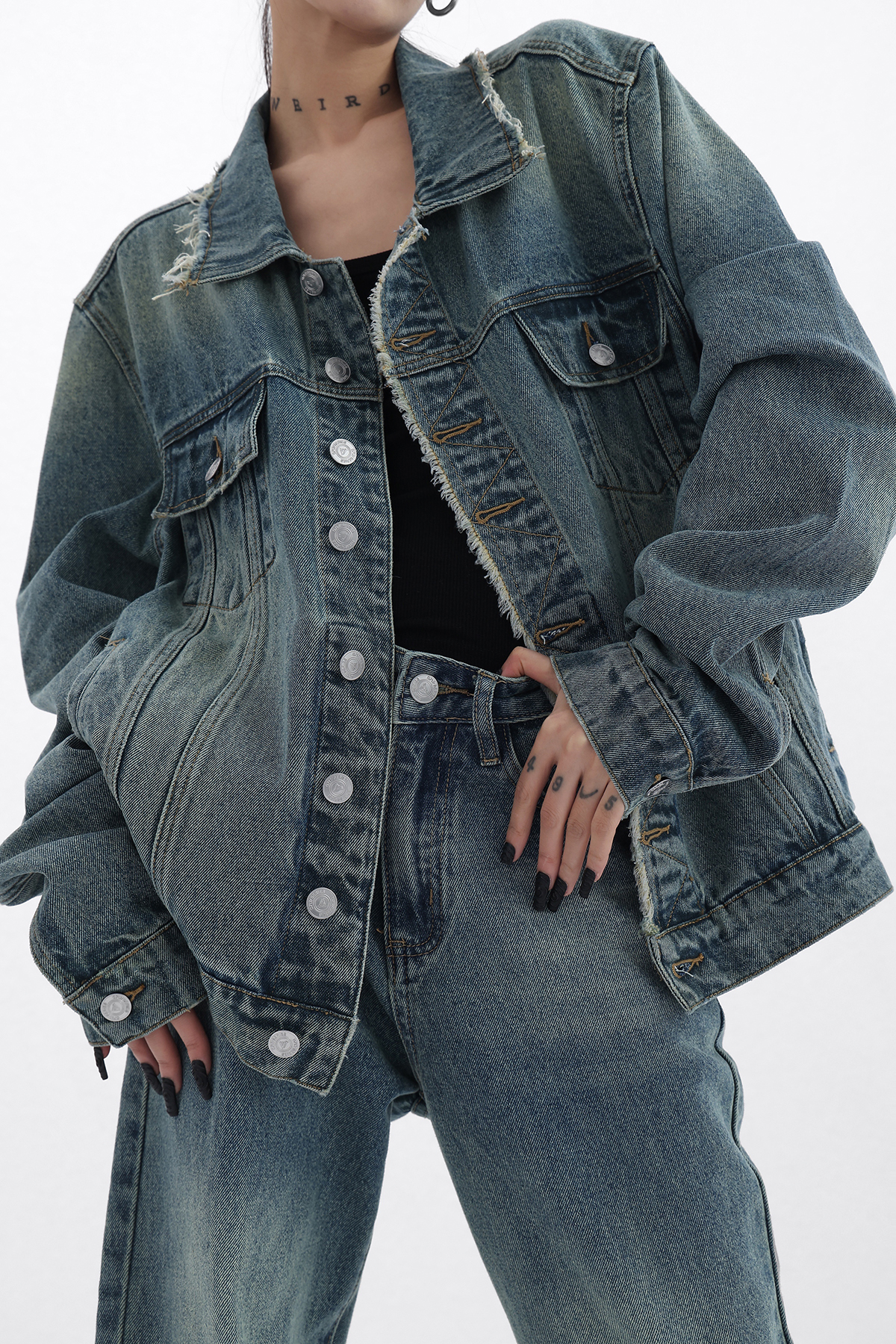 Acestudios 復古做舊牛仔衣+牛仔褲2件套女2023春秋新款牛仔外套