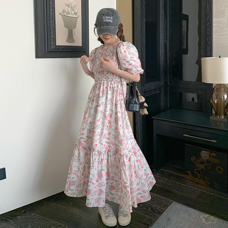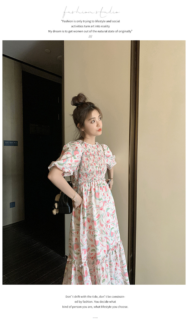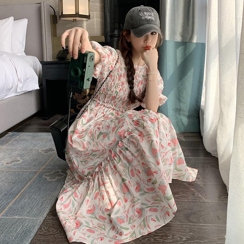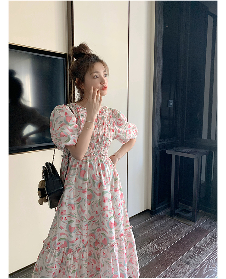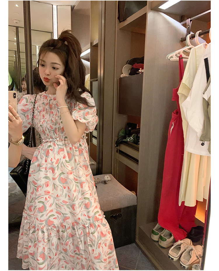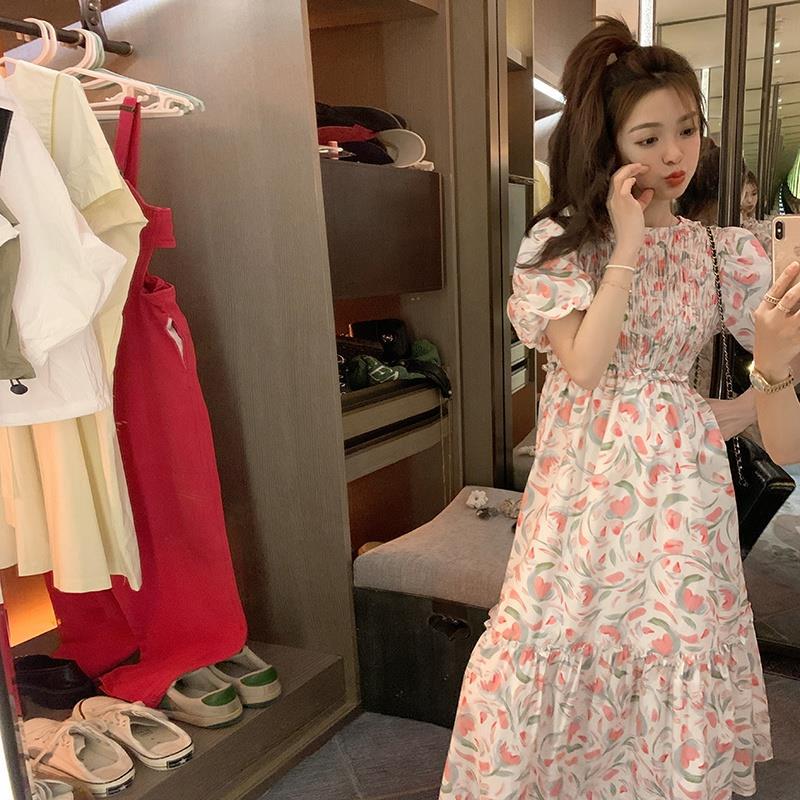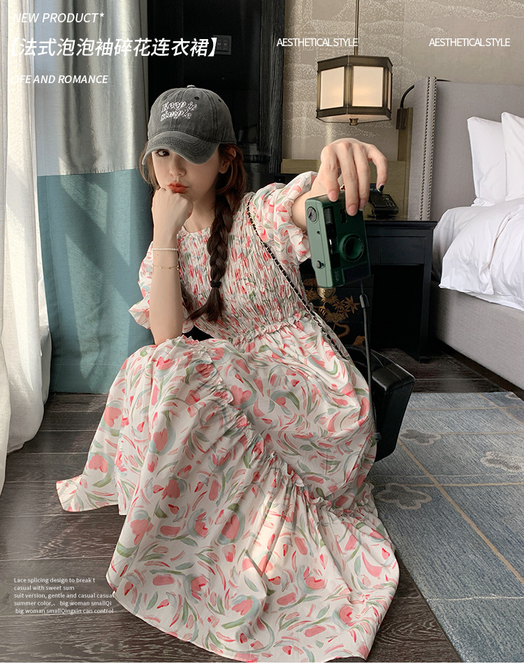 实拍泡泡袖粉色碎花连衣裙女夏季小众设计感甜美韩系温柔风长裙子