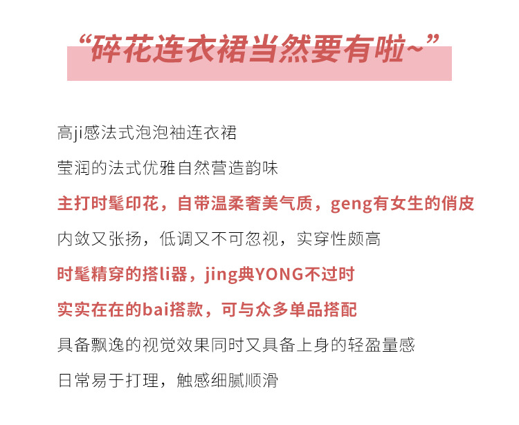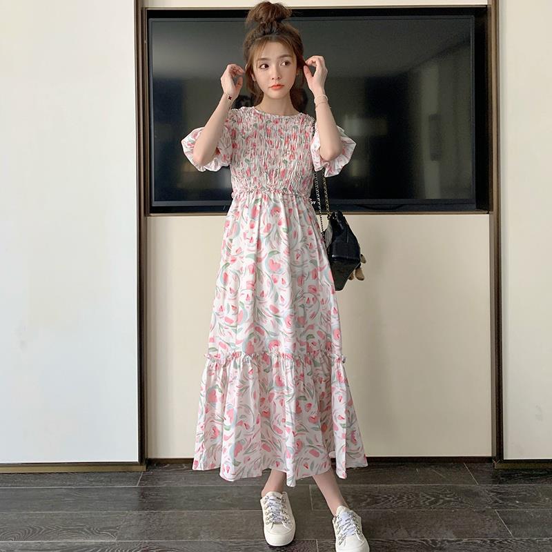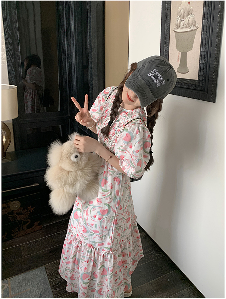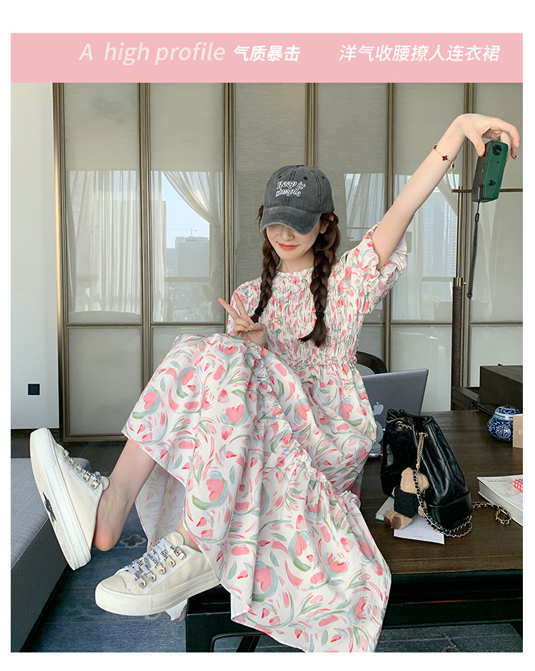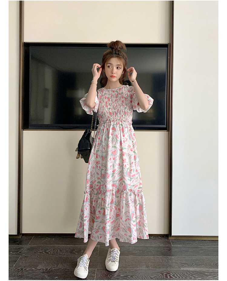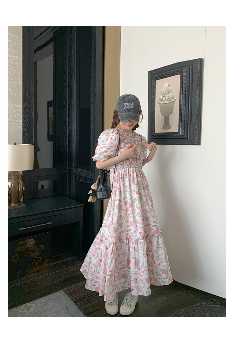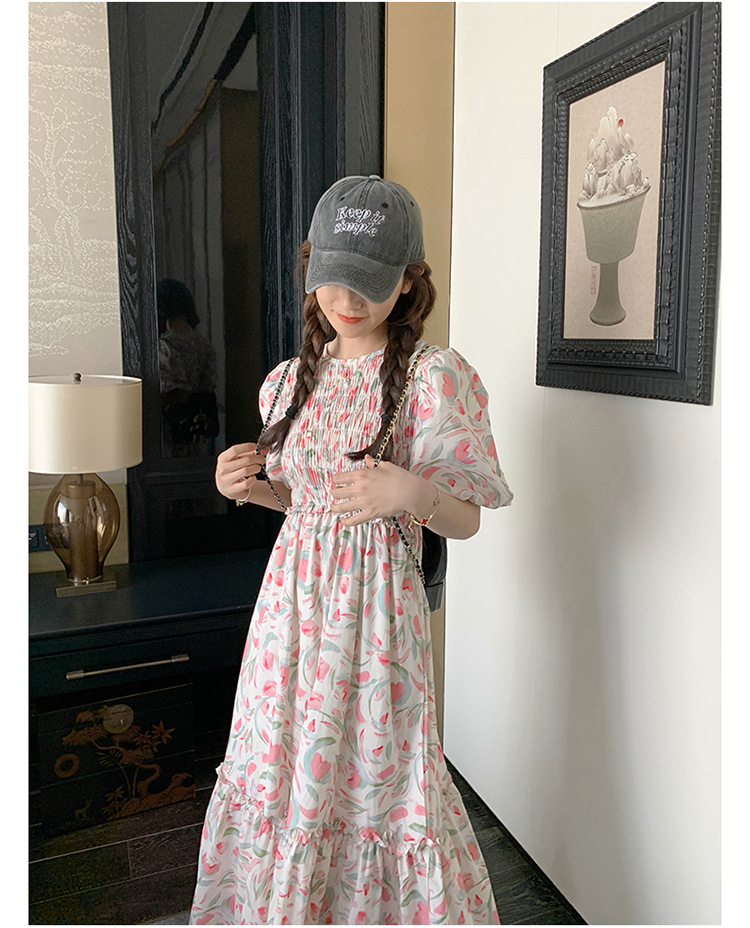 实拍泡泡袖粉色碎花连衣裙女夏季小众设计感甜美韩系温柔风长裙子