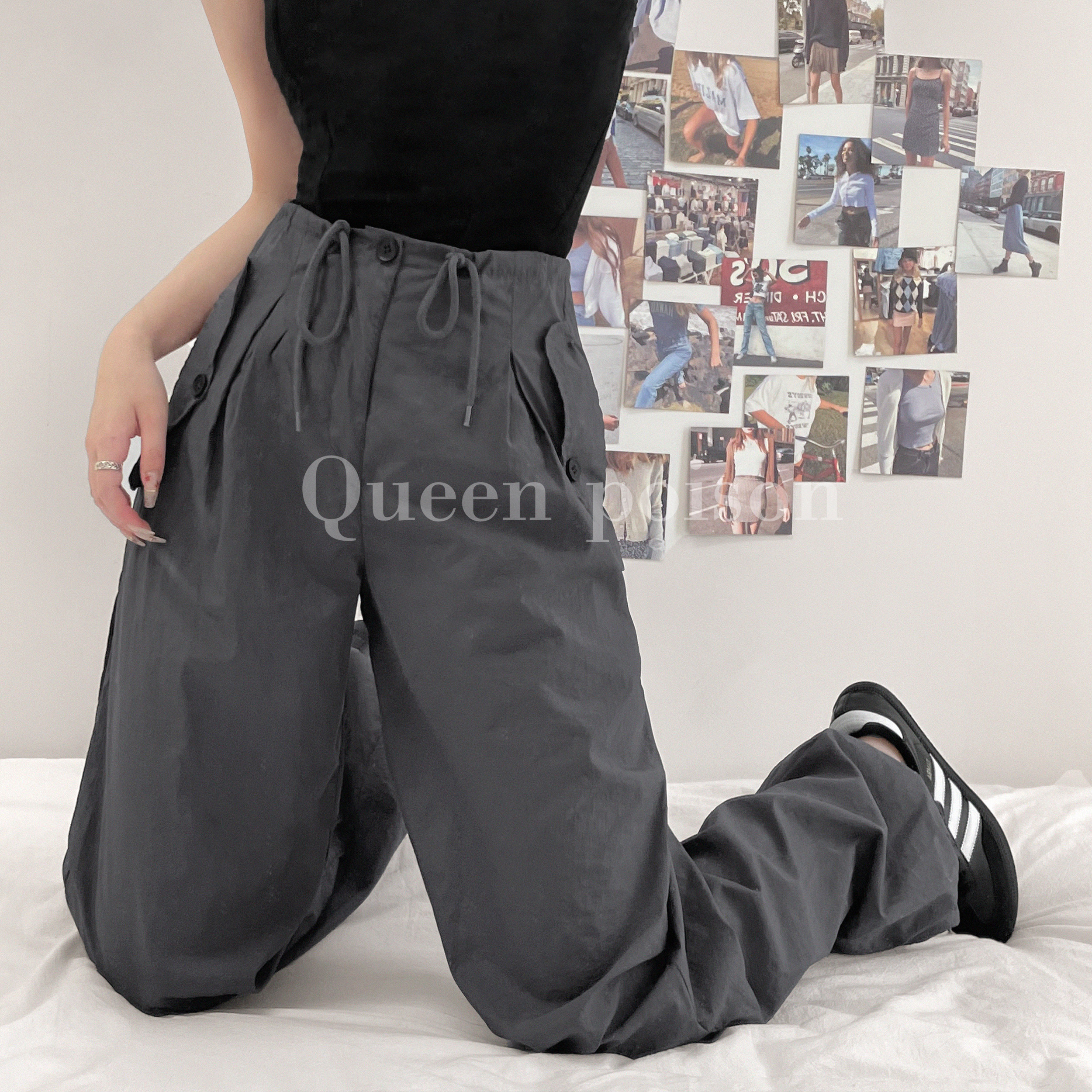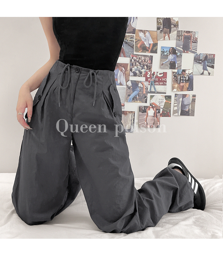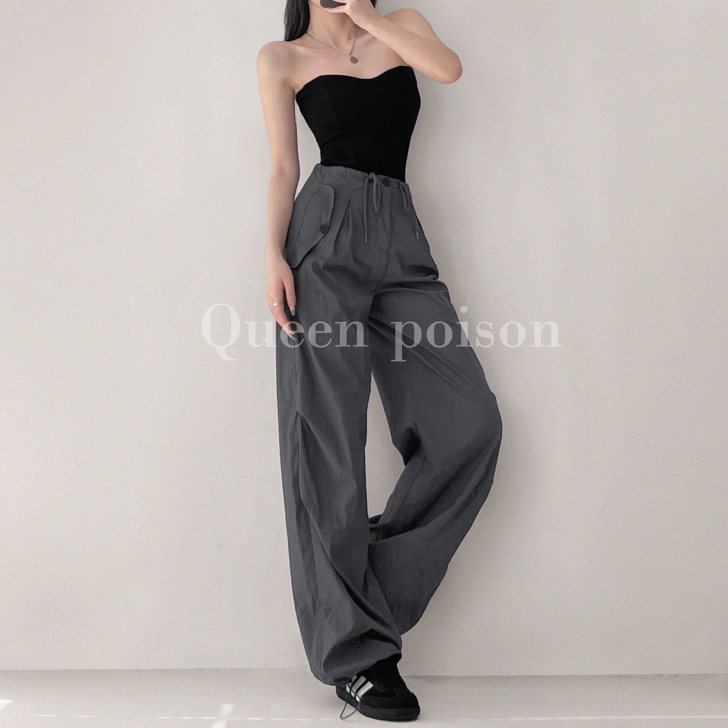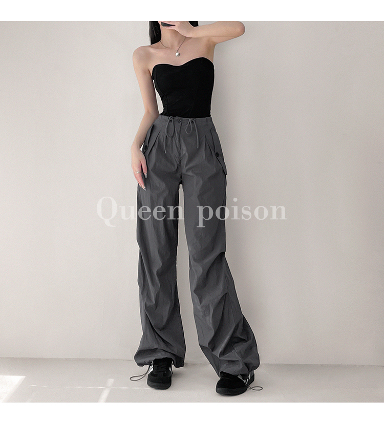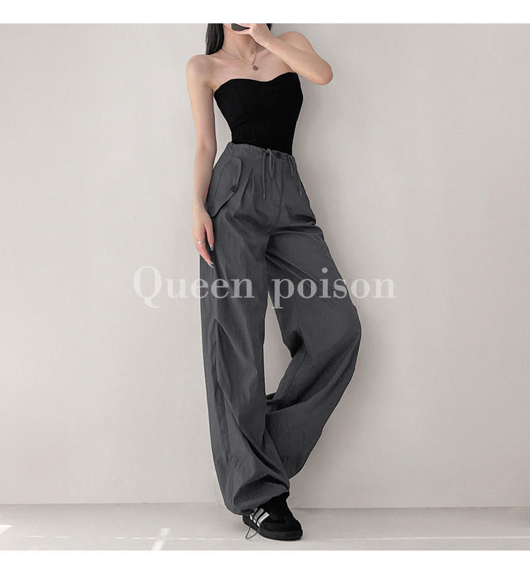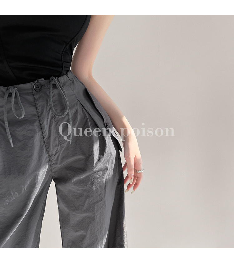 惡霸女主低腰抽繩褶皺速乾工裝褲女夏寬鬆休閒顯瘦直筒束腳闊腿褲