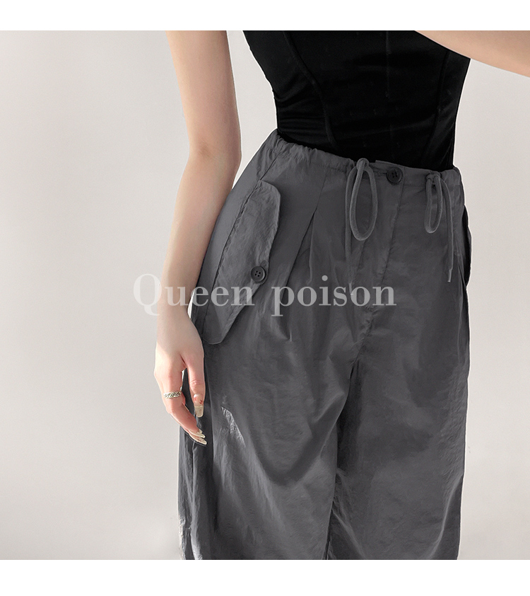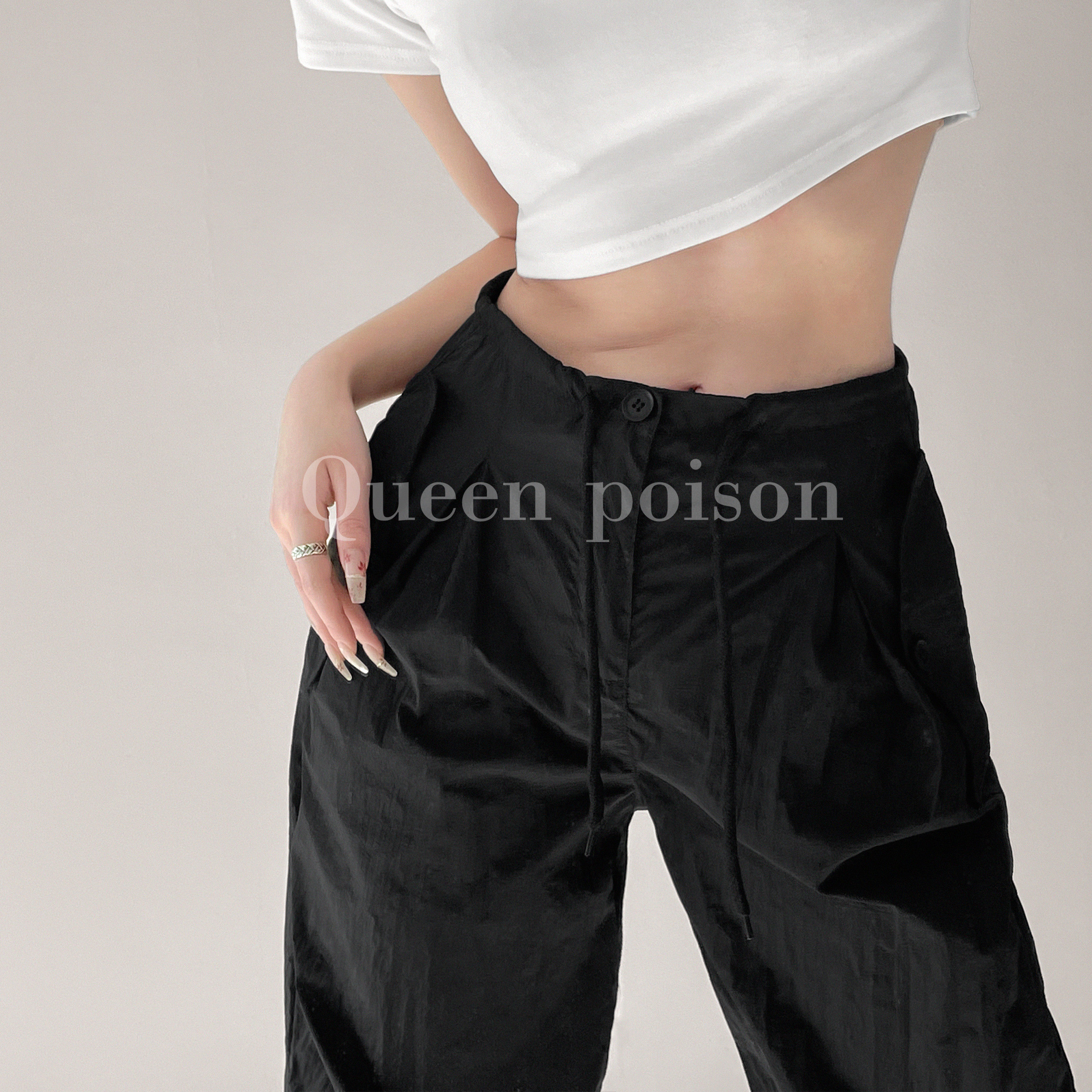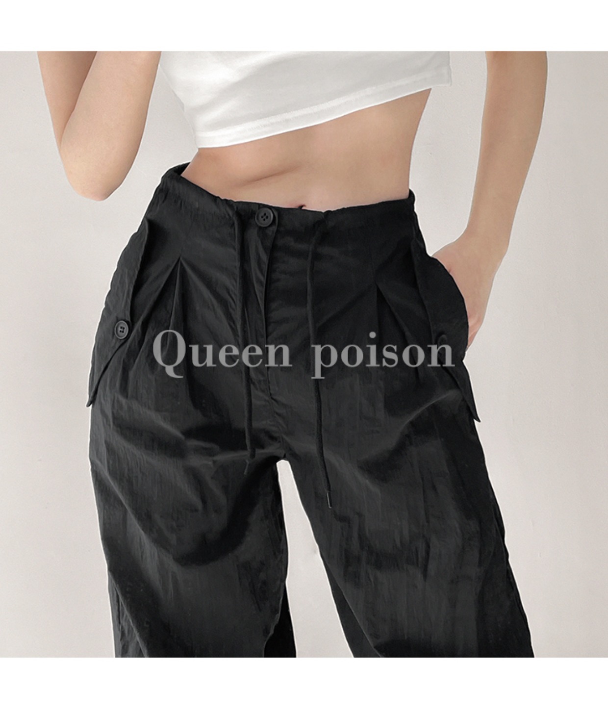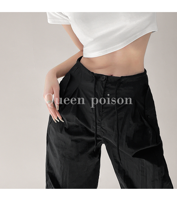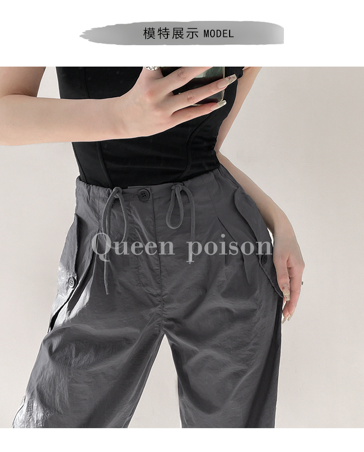 惡霸女主低腰抽繩褶皺速乾工裝褲女夏寬鬆休閒顯瘦直筒束腳闊腿褲