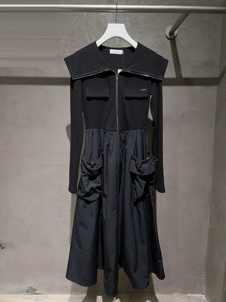 2023秋季新款休閒大翻領口袋抽繩拼接收腰顯瘦長袖洋裝中長裙女