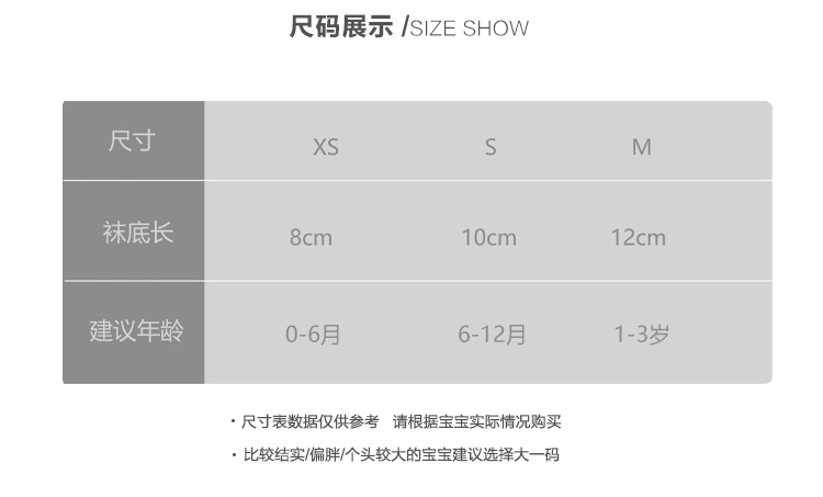 童袜尺码 XS 0-6个月,S 6-12个月,M 1-3岁