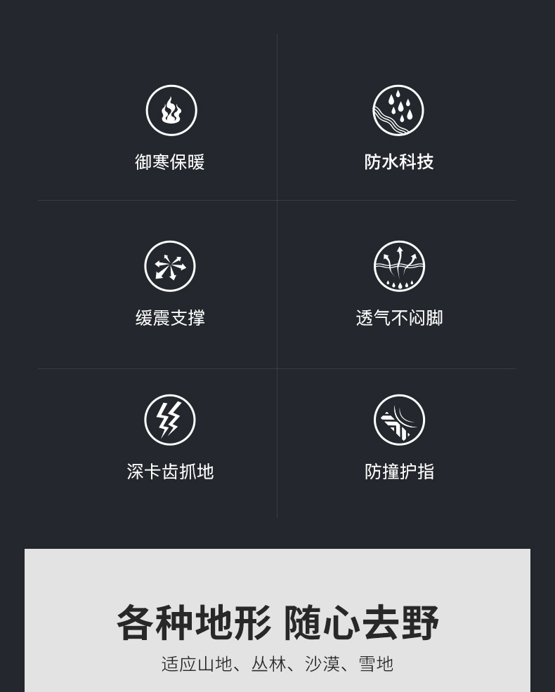 功能 減震 防滑 耐磨 防水 透氣 支撐 平衡 抗衝擊 保暖 包裹性 防刺穿 防扭轉