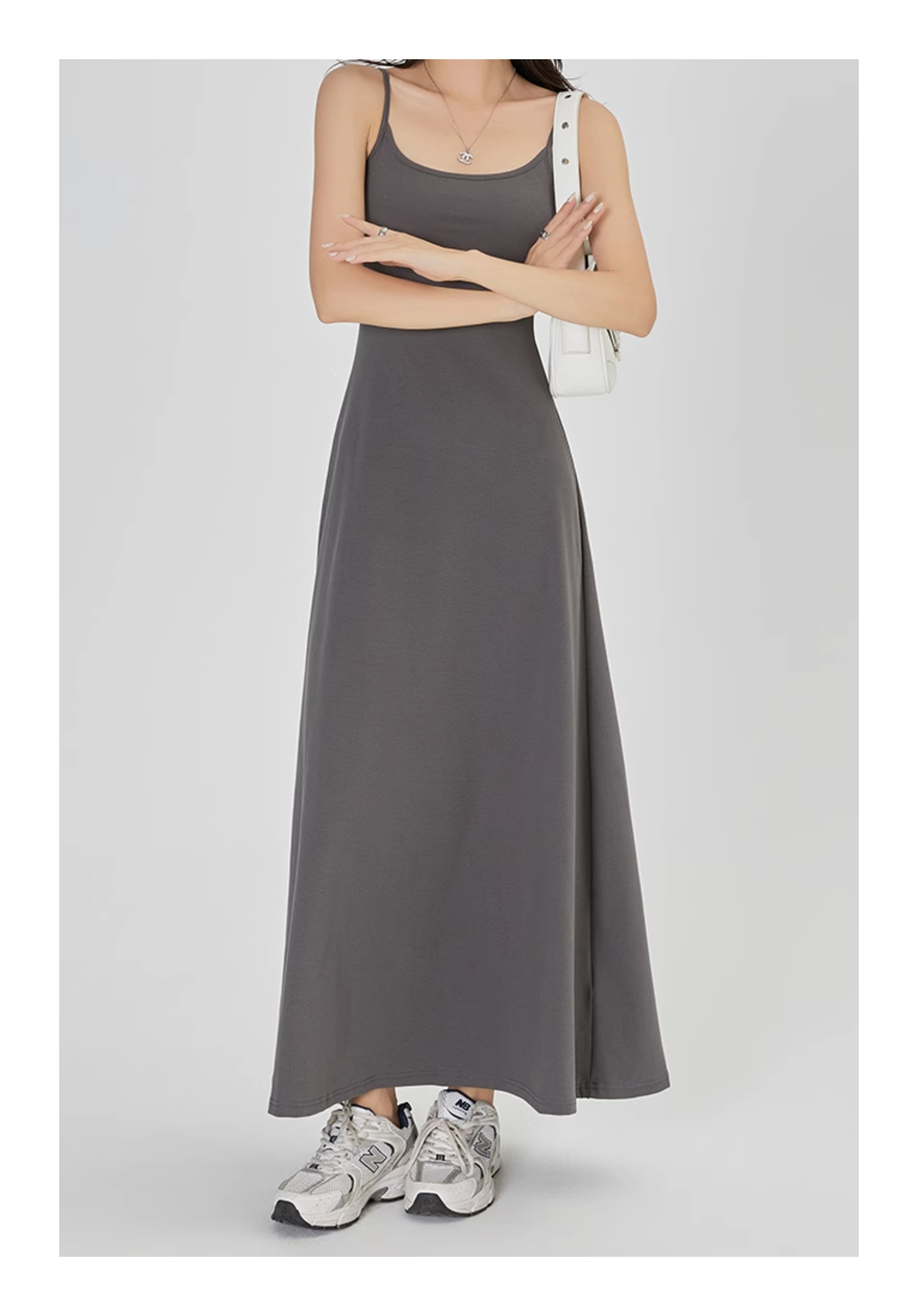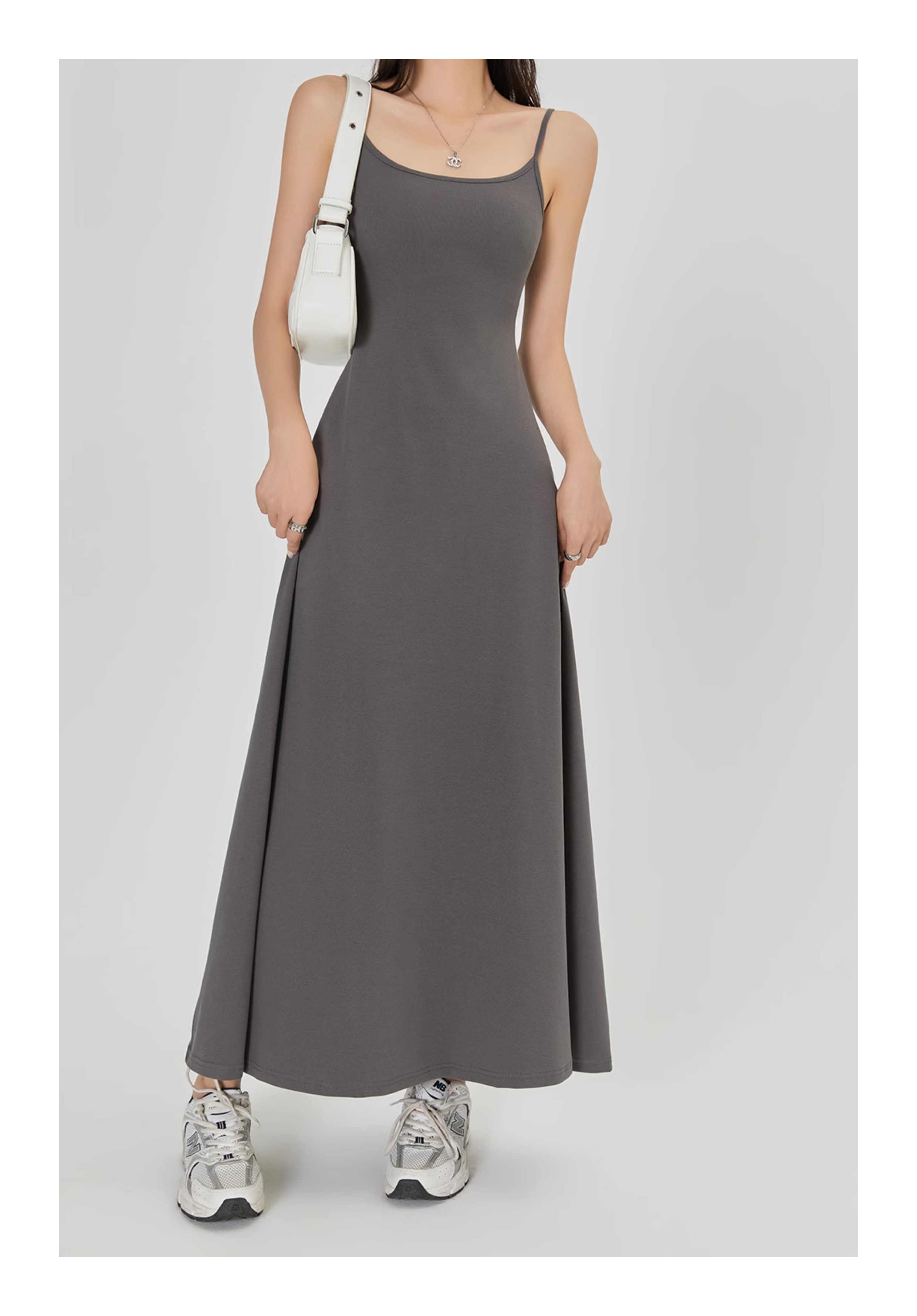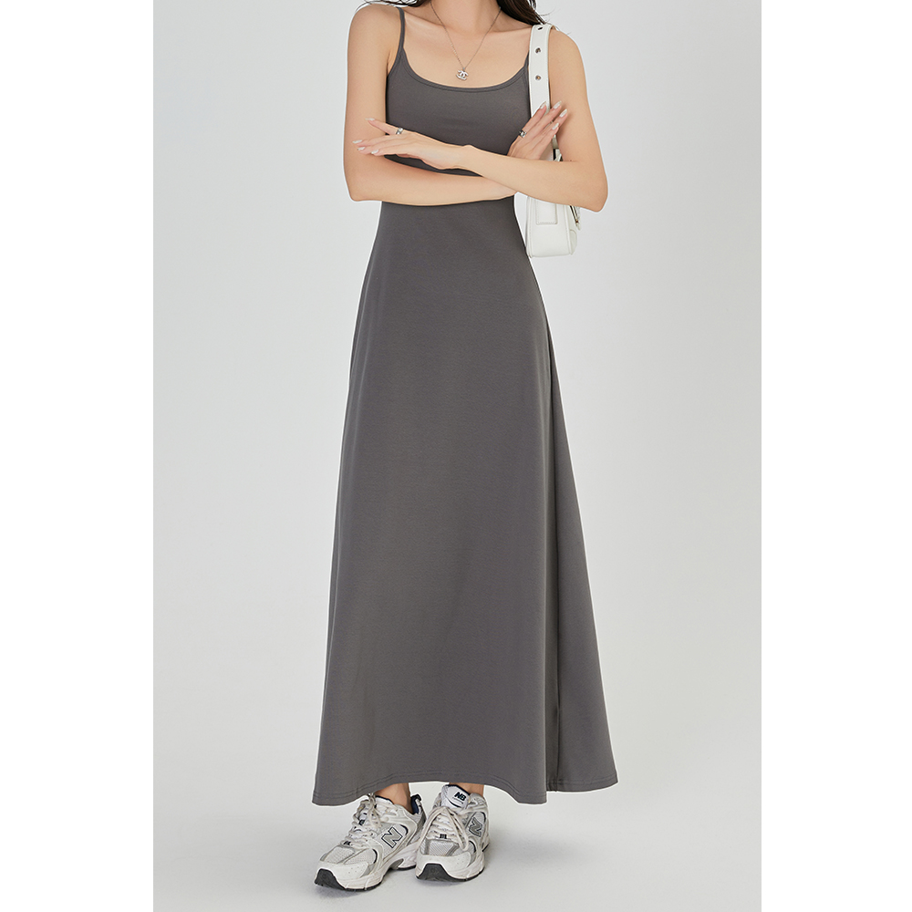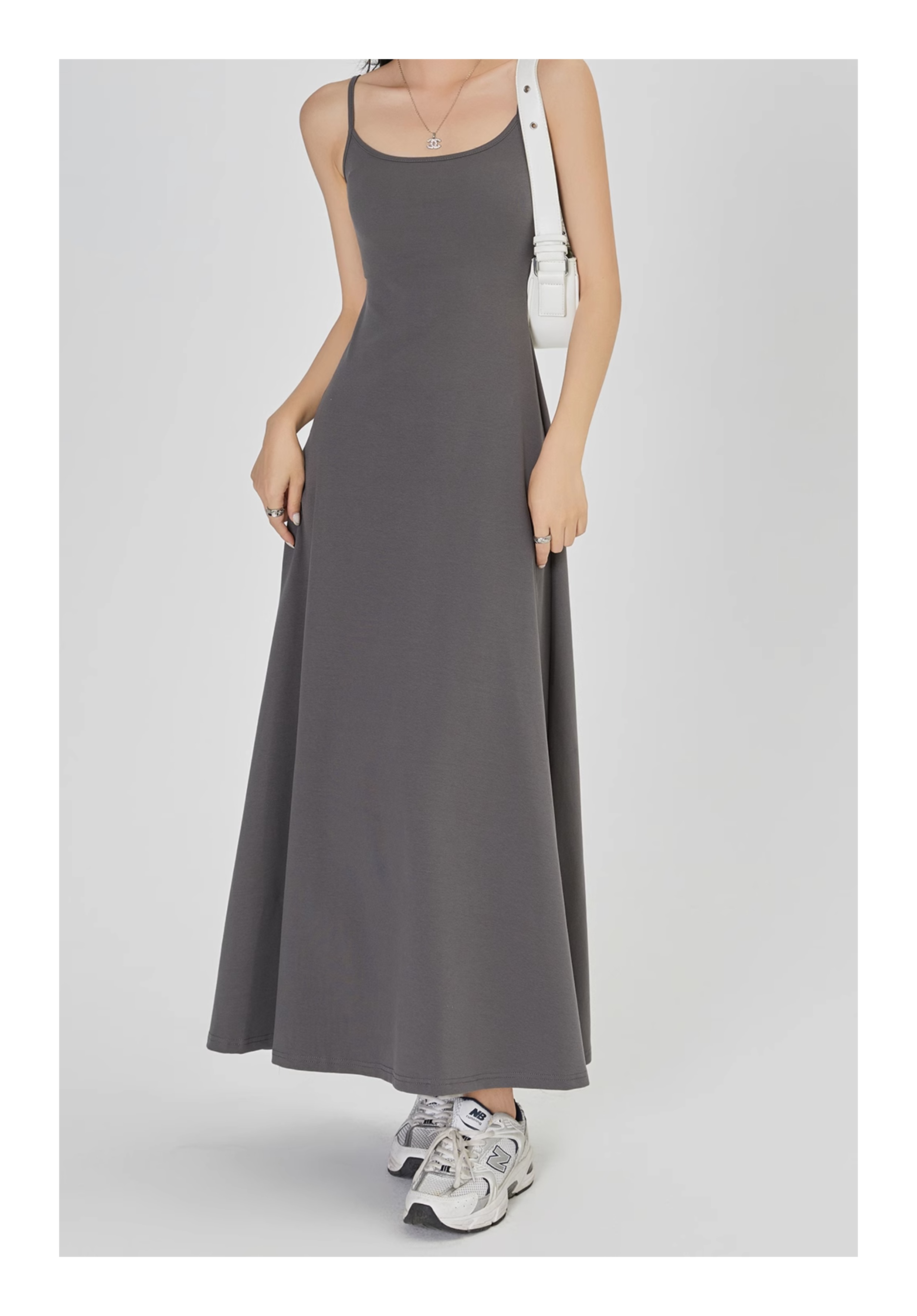LINFANGING 灰色微彈洋裝秋季百搭寬鬆a字長版吊帶裙女休閒長裙