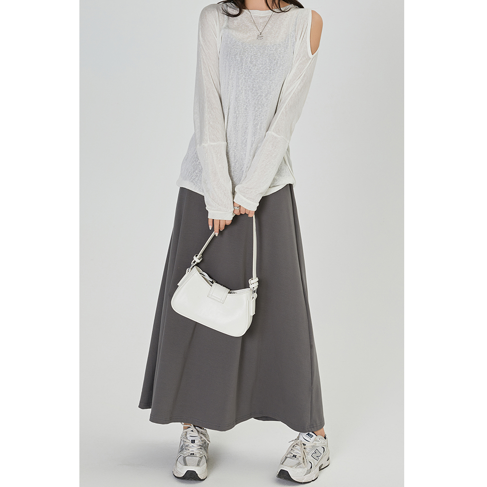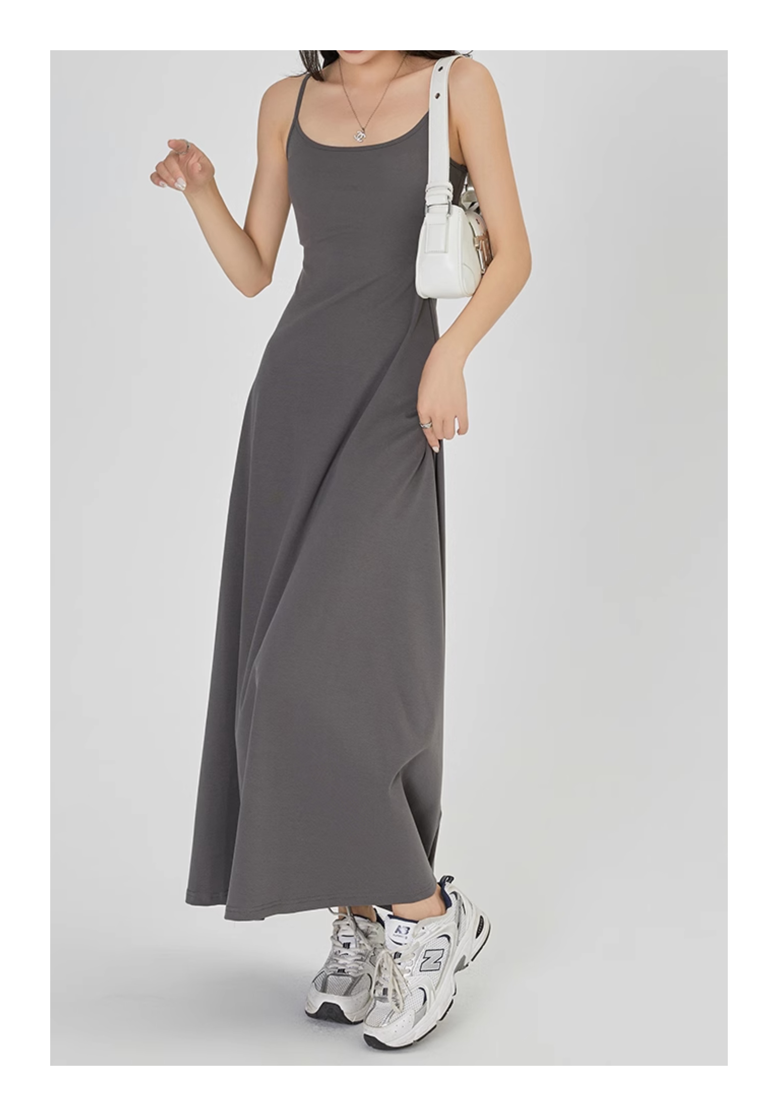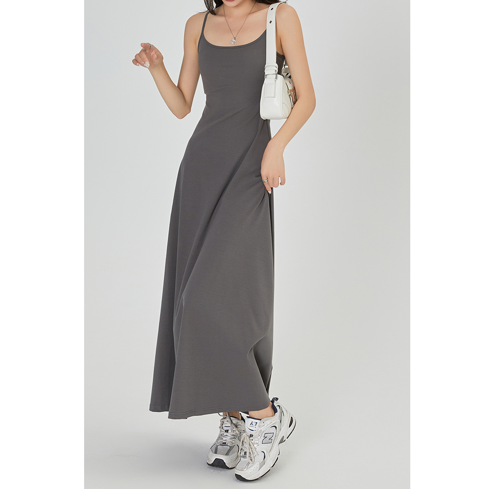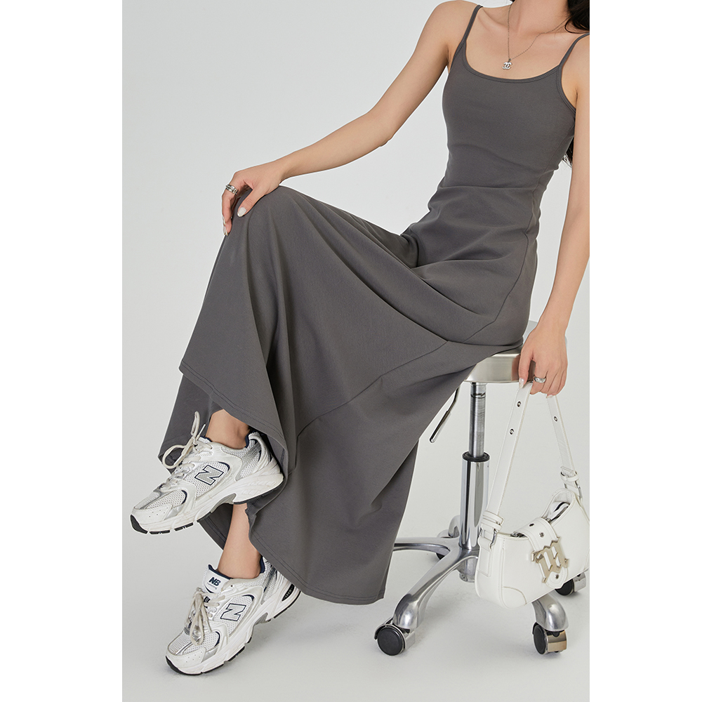 LINFANGING 灰色微彈洋裝秋季百搭寬鬆a字長版吊帶裙女休閒長裙