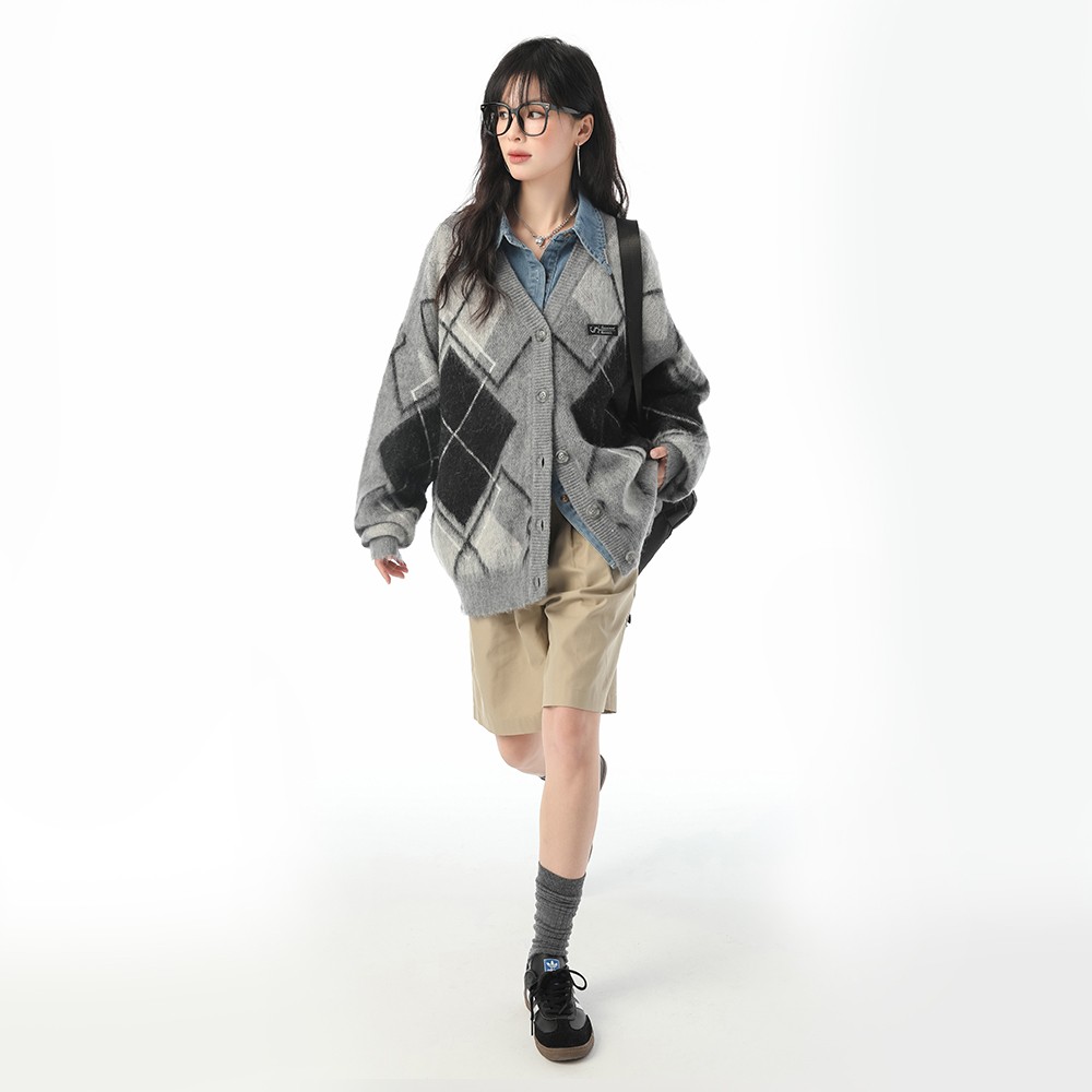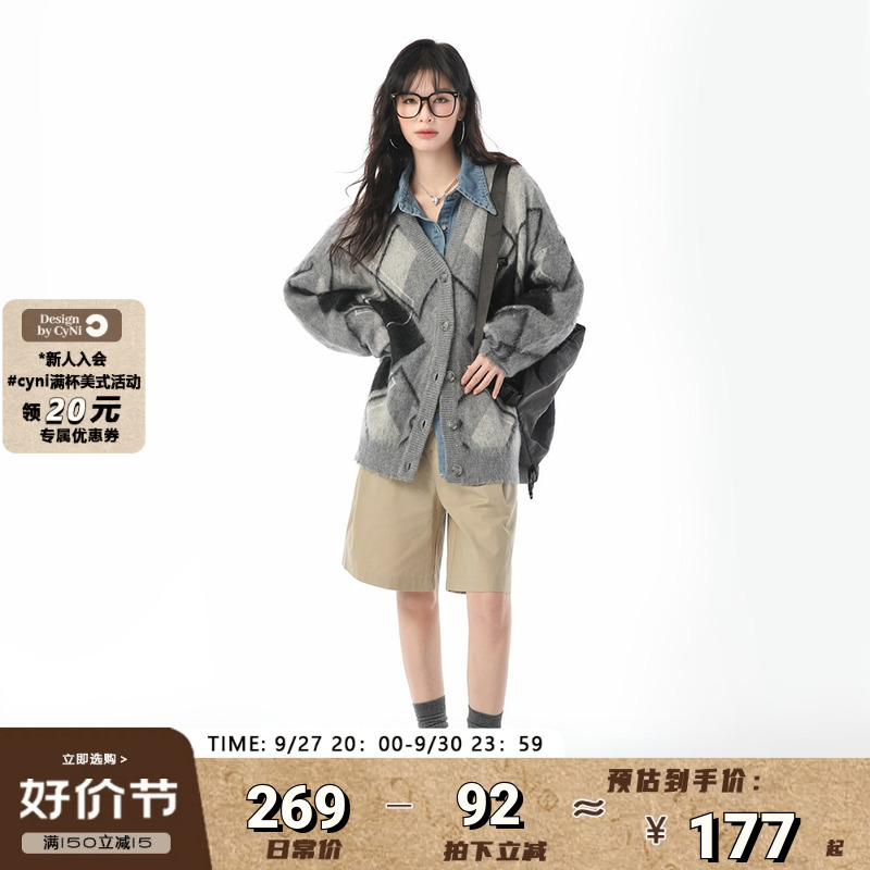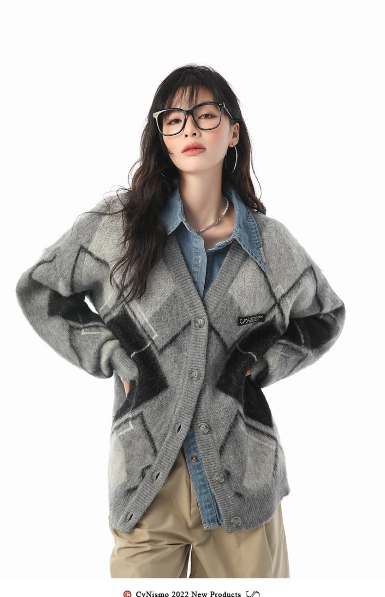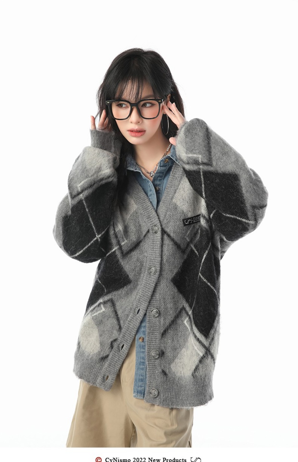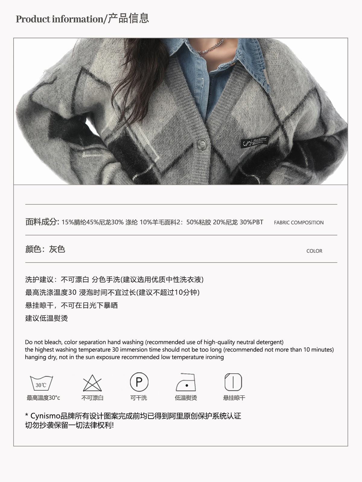 CyNi 「 Cynismo」潮牌復古V領菱格長袖針織開衫外套慵懶風高級感