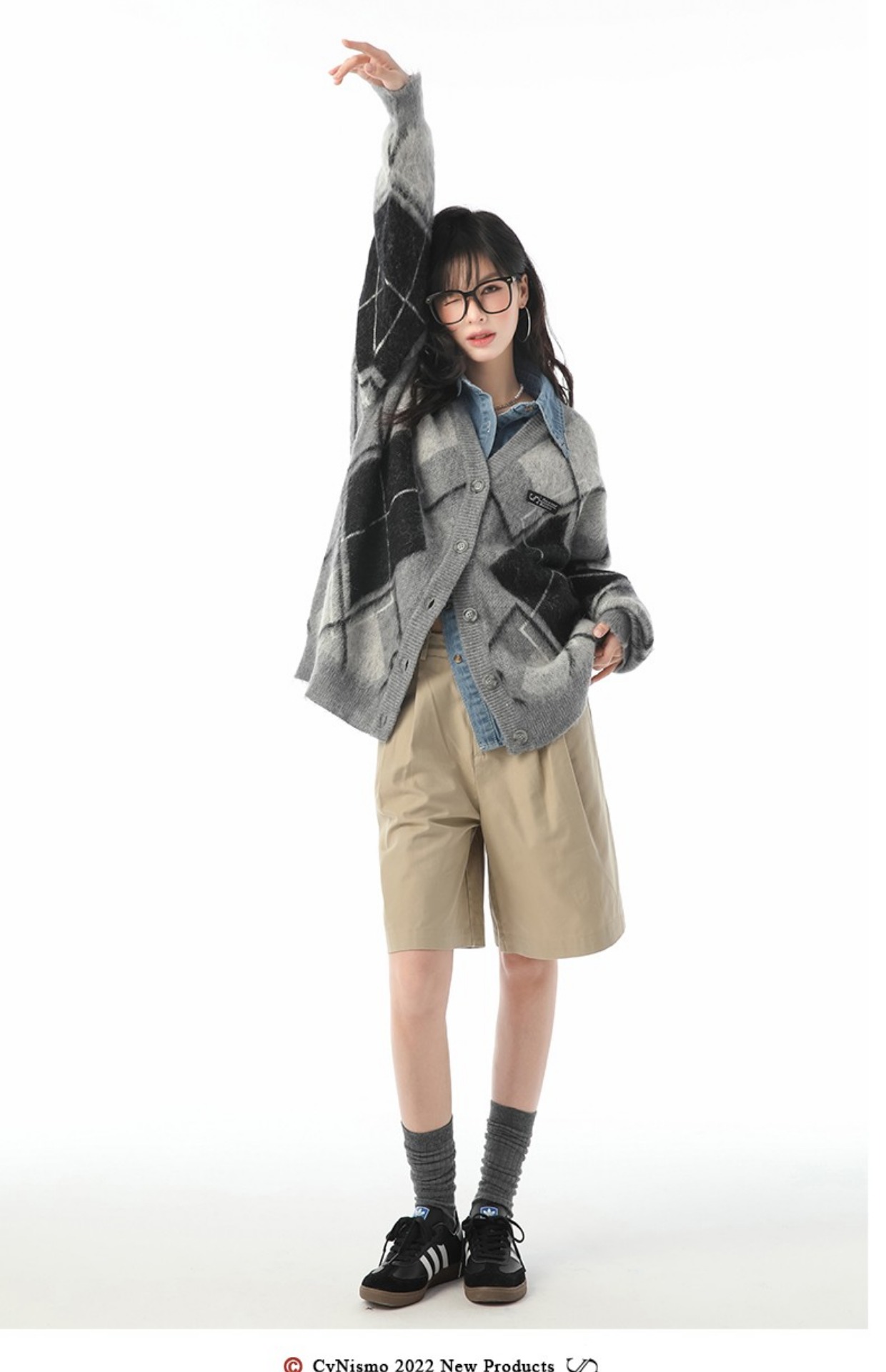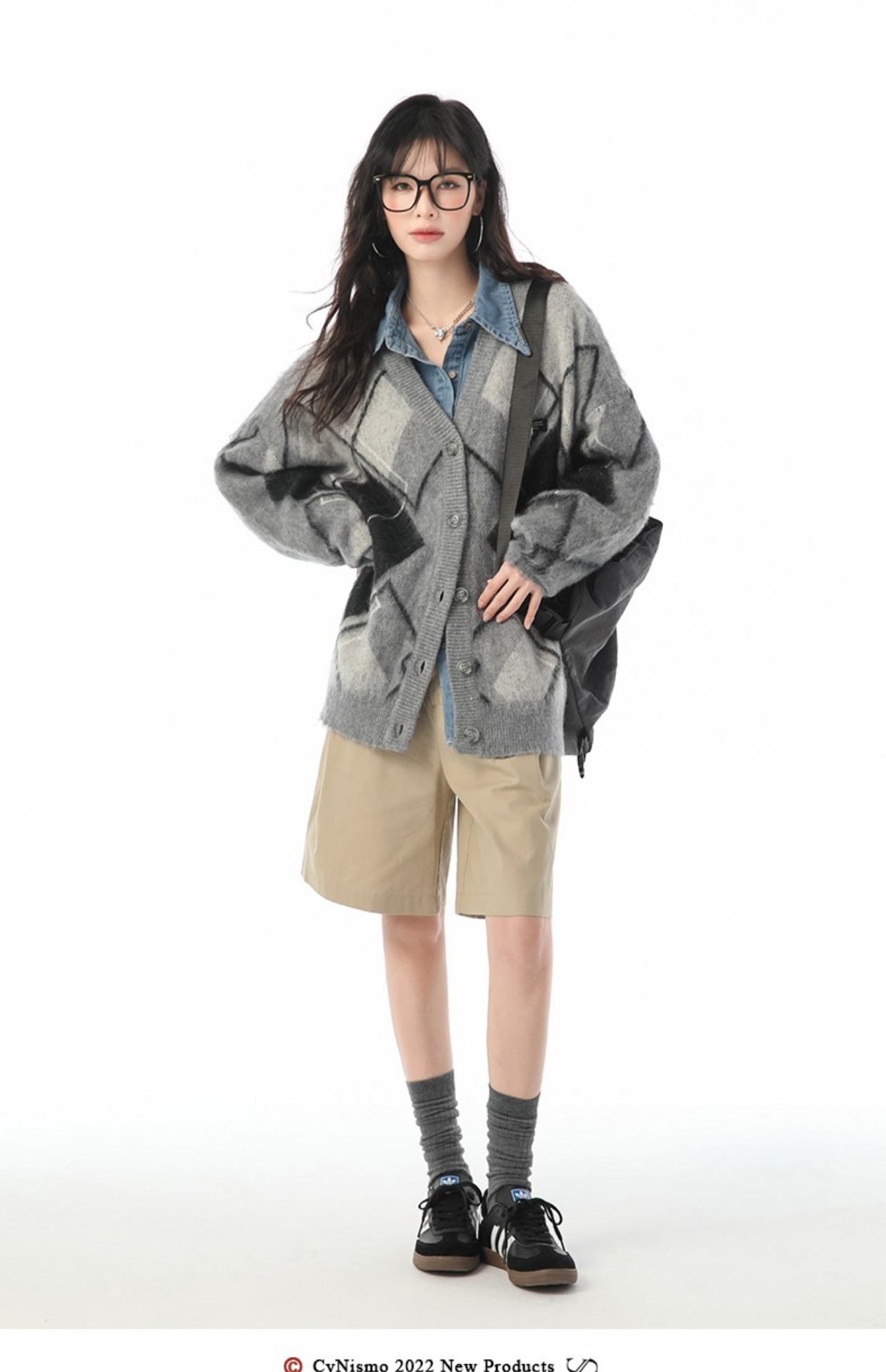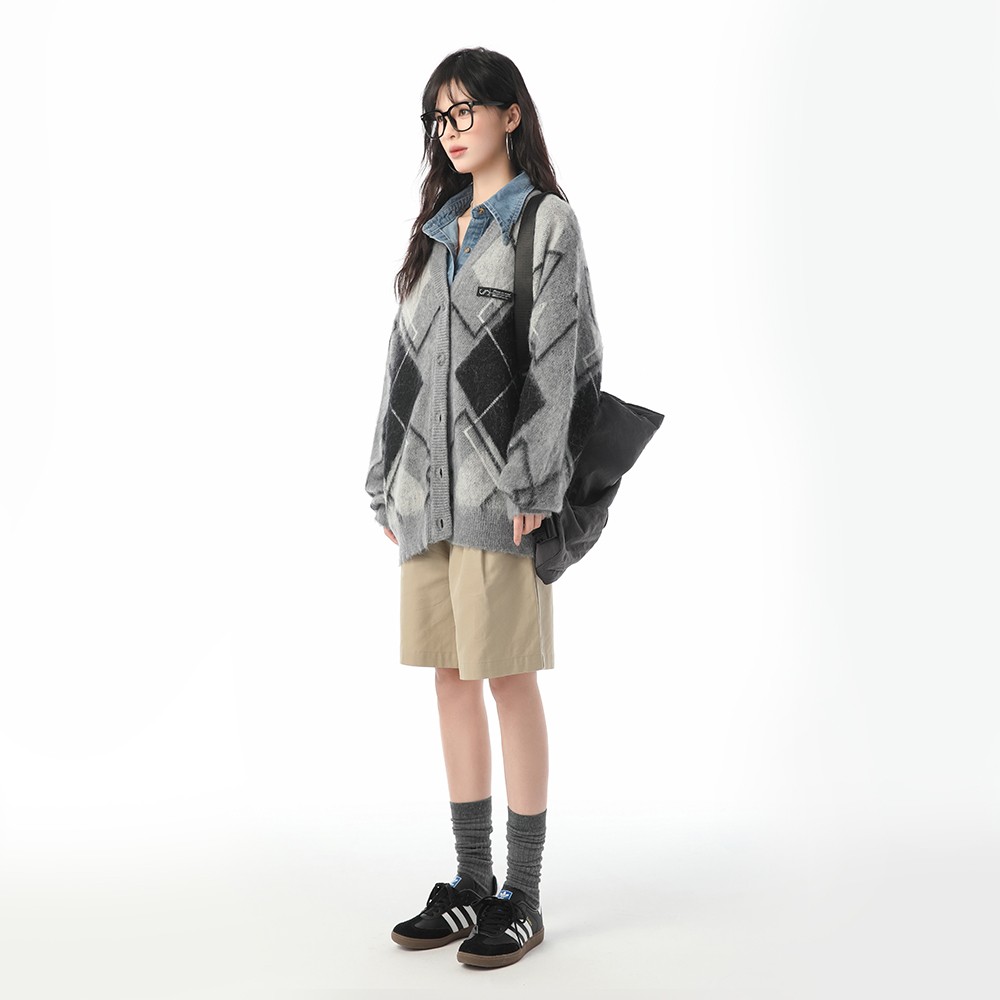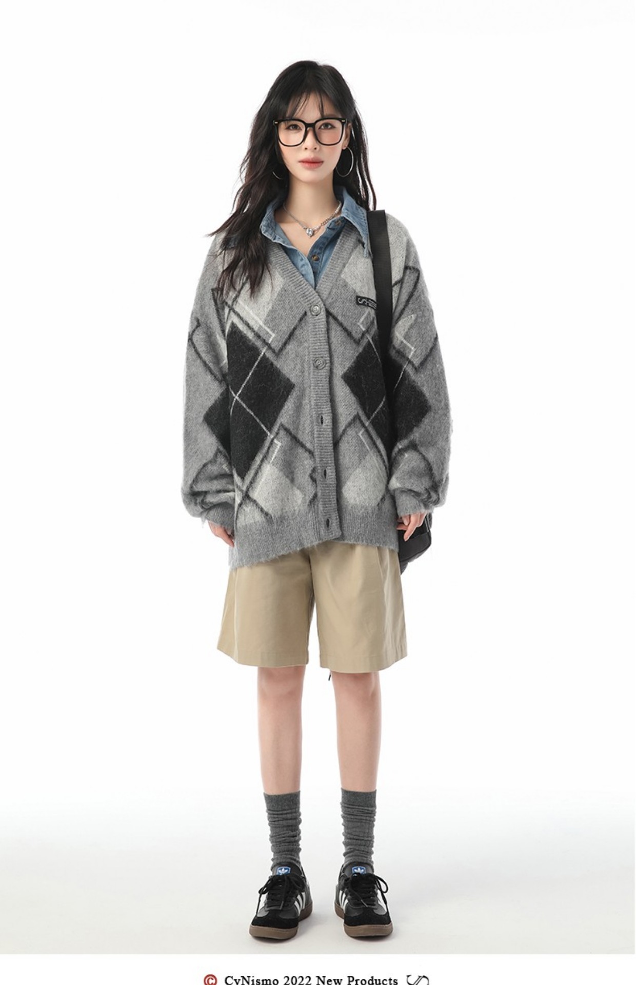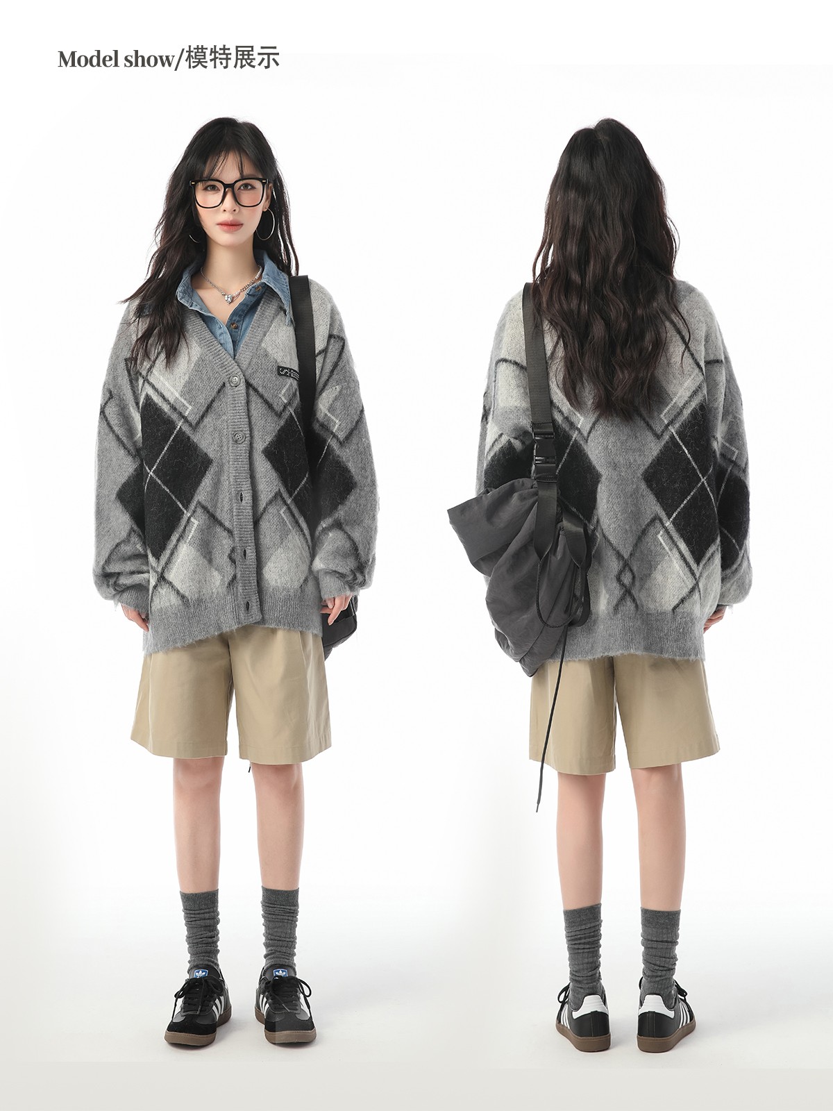CyNi 「 Cynismo」潮牌復古V領菱格長袖針織開衫外套慵懶風高級感