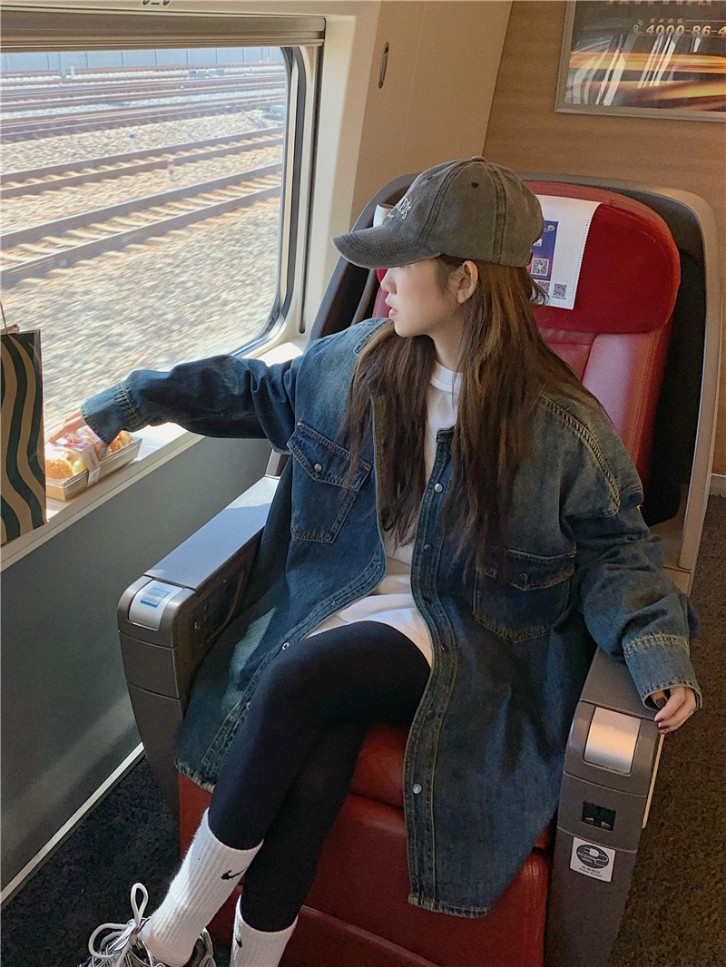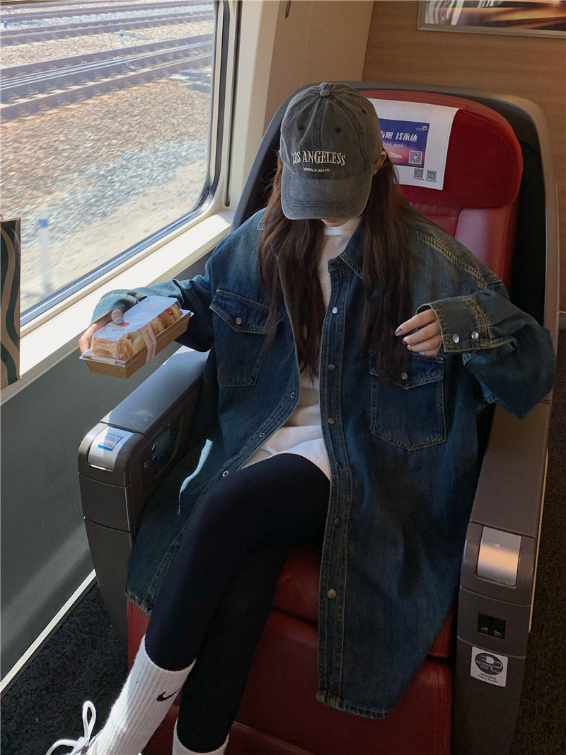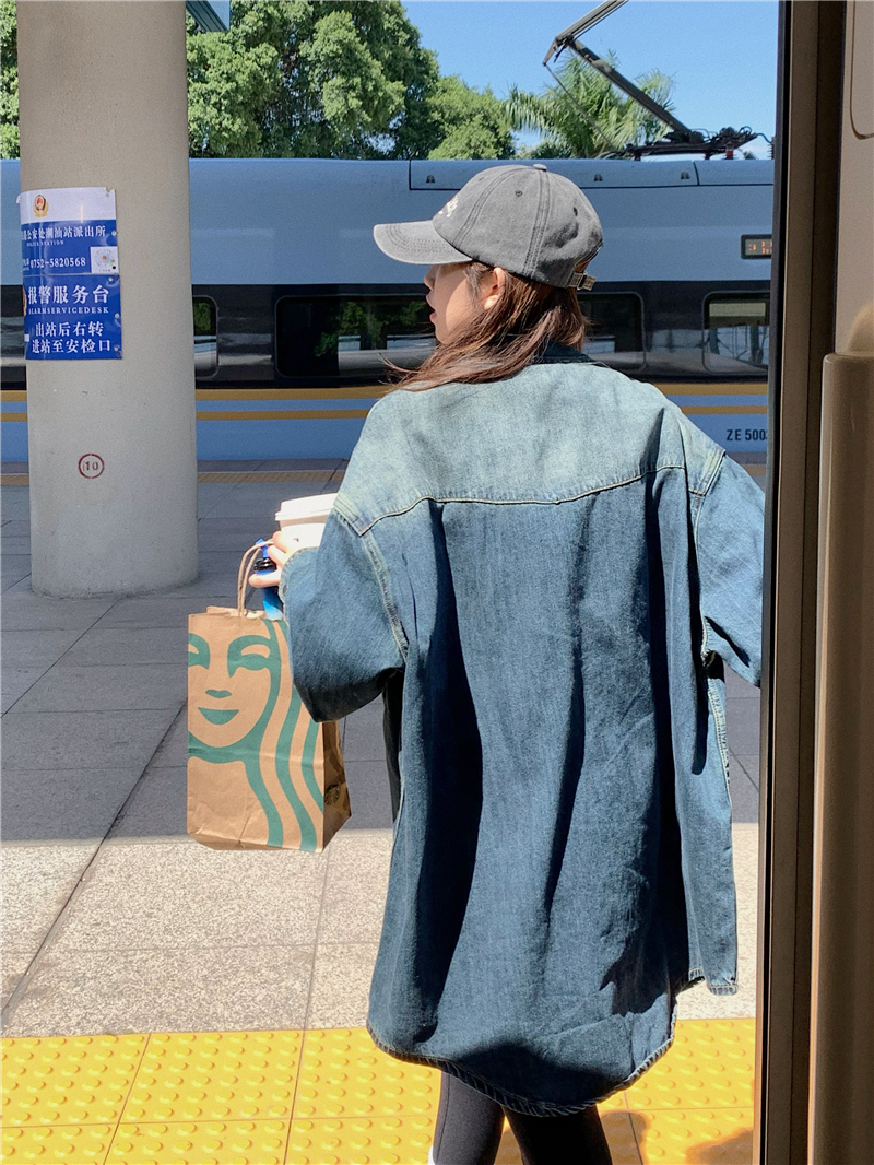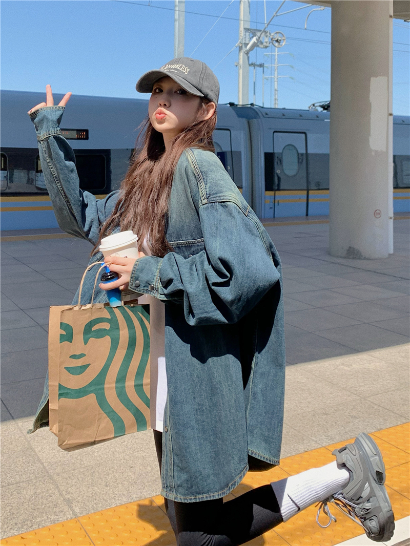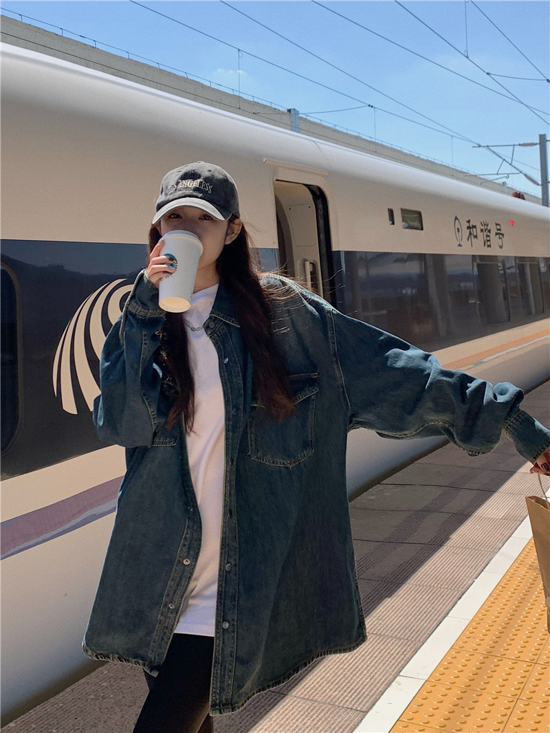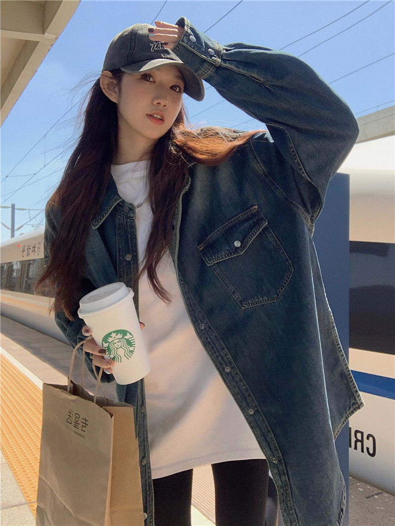 大尺碼港風復古中長版牛仔襯衫外套女胖妹妹春季新款寬鬆小眾上衣潮