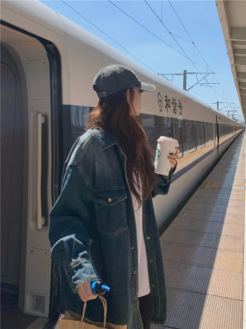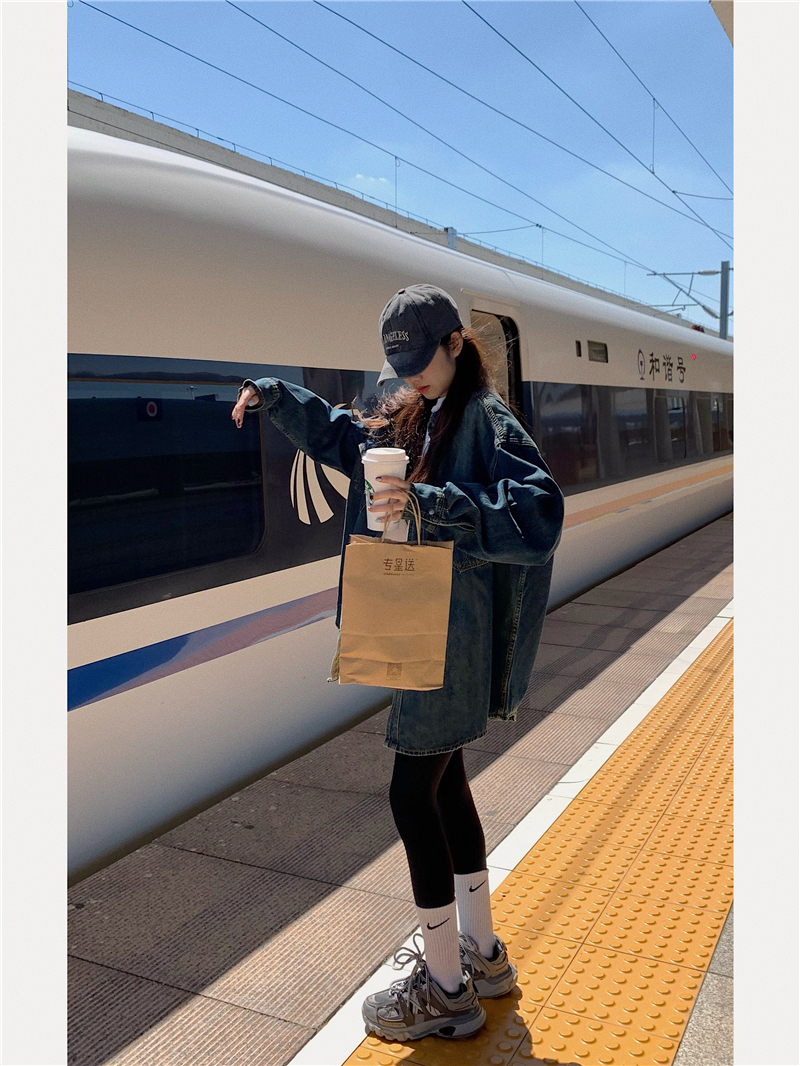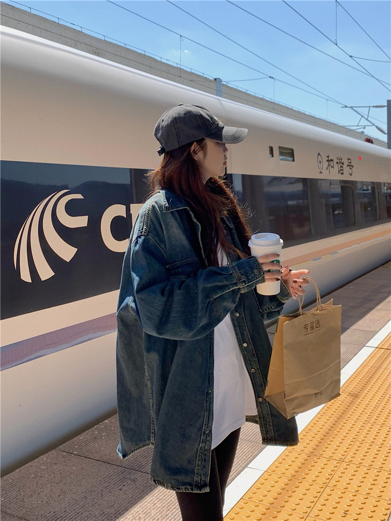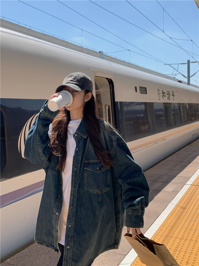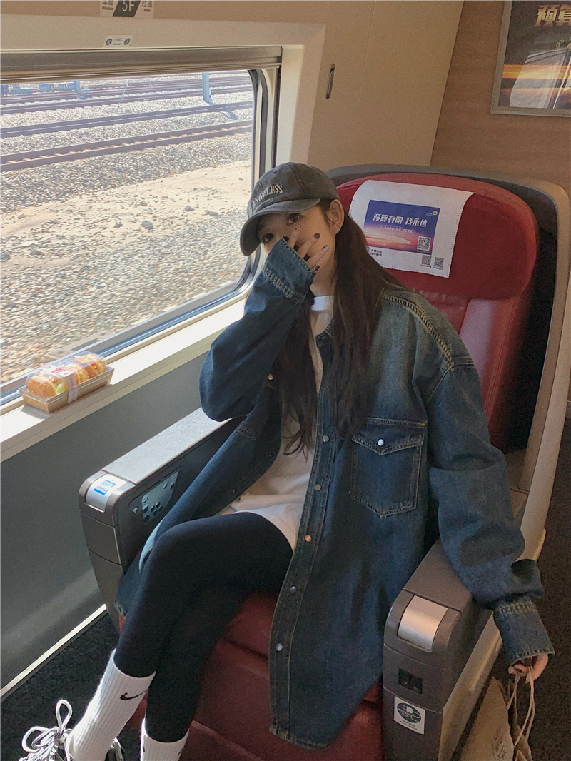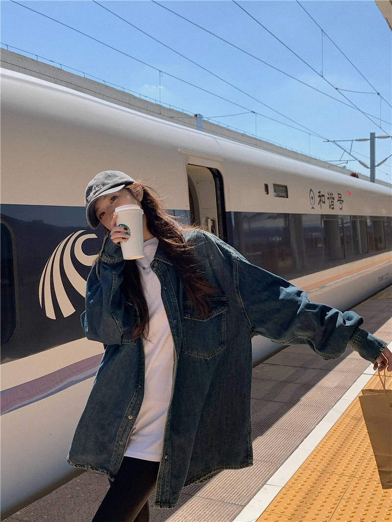 大尺碼港風復古中長版牛仔襯衫外套女胖妹妹春季新款寬鬆小眾上衣潮