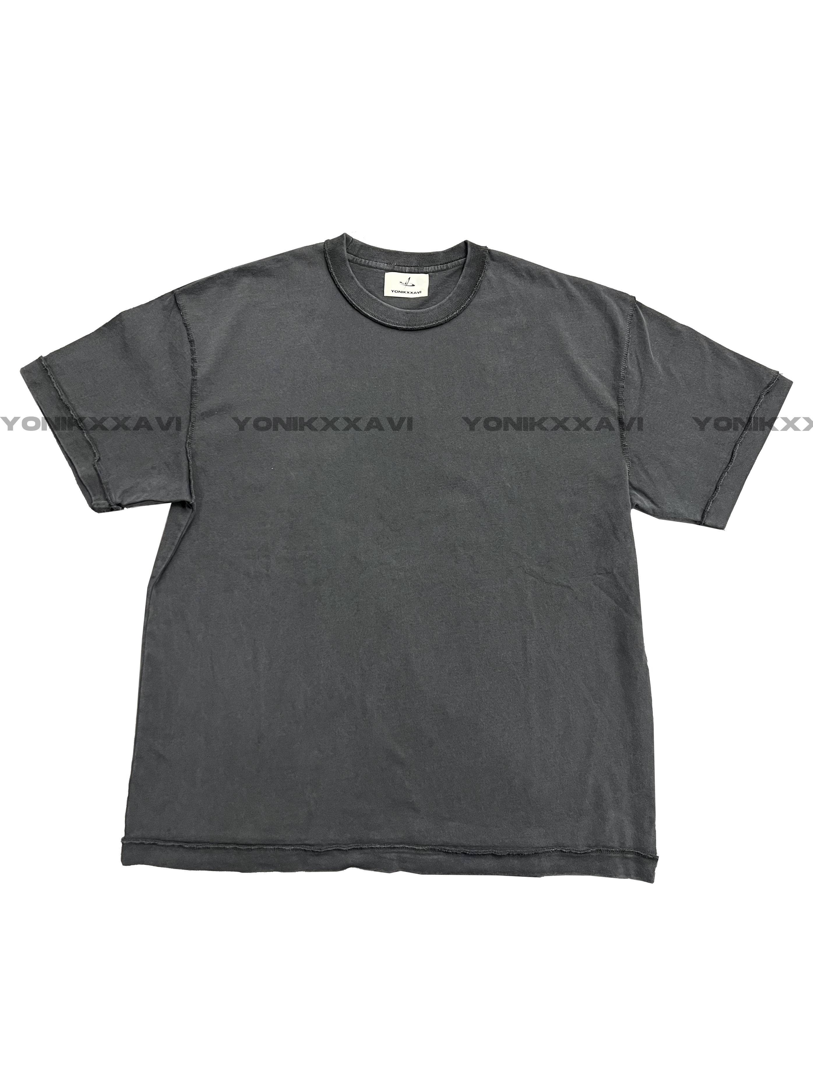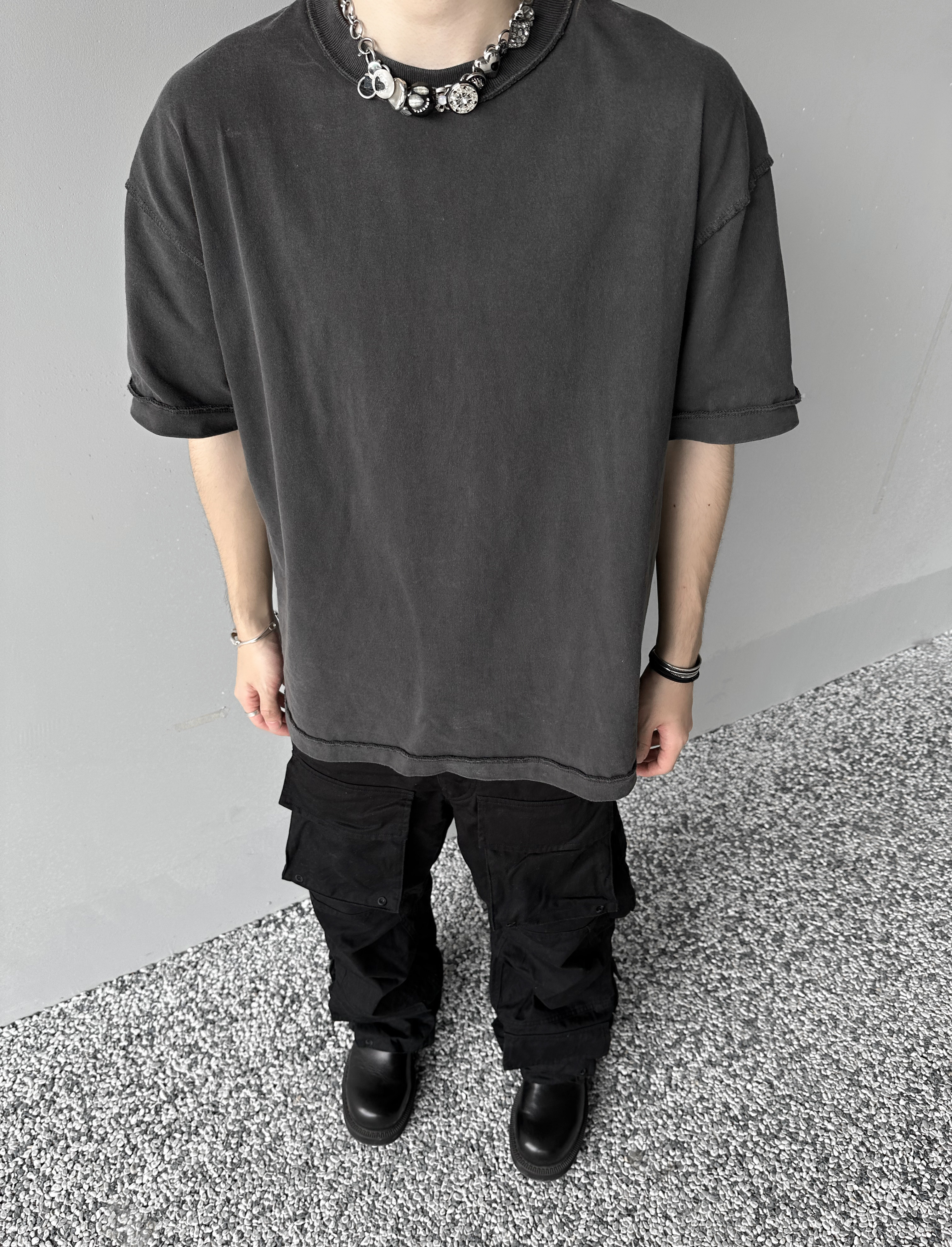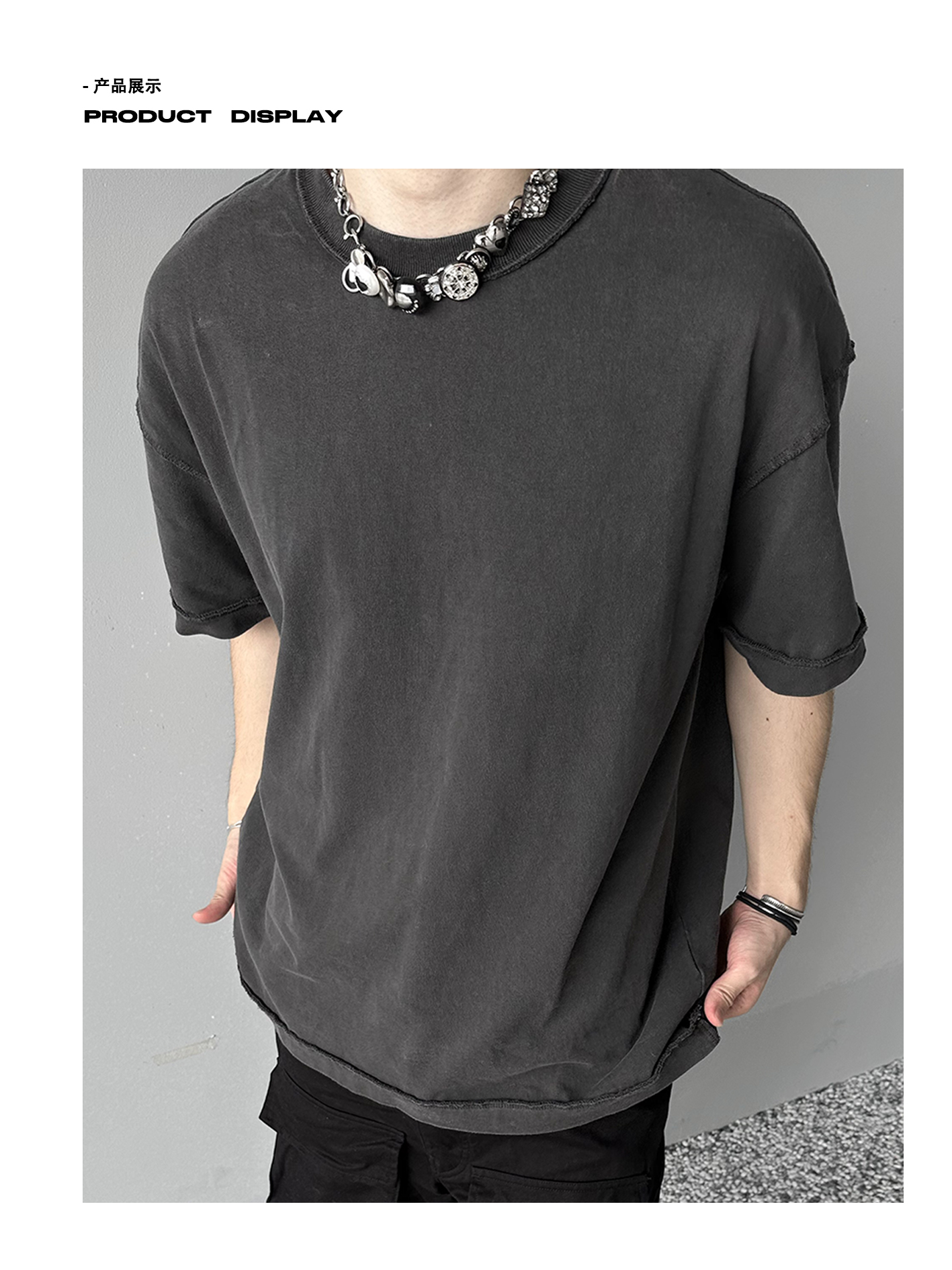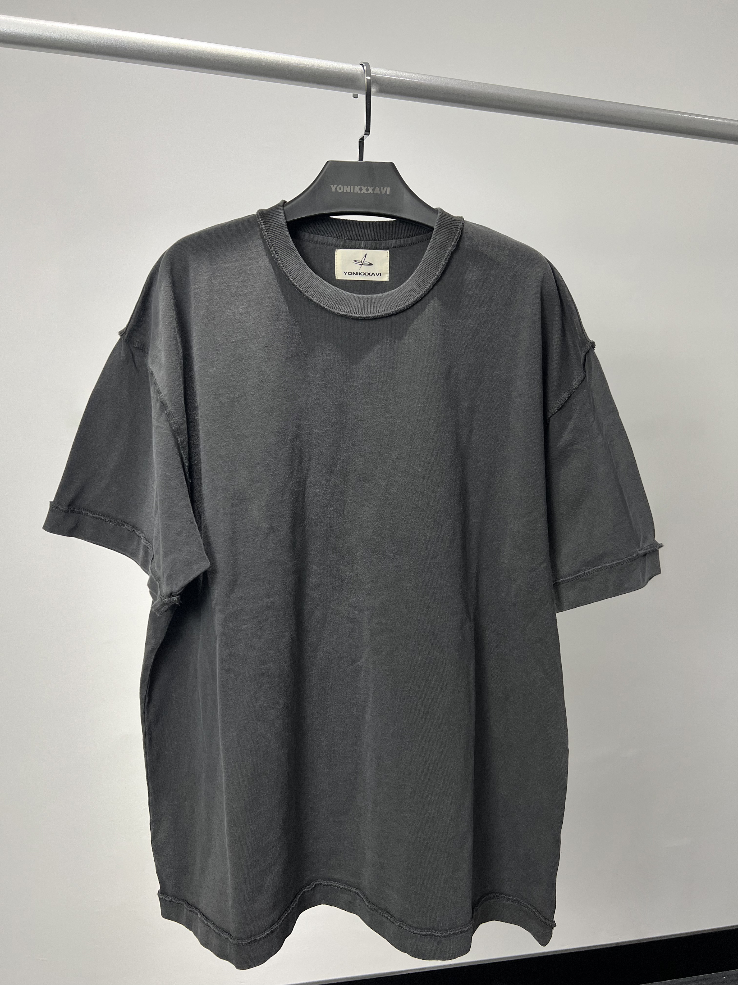 「Rabbit.b」反縫線加固螺紋領口廓形寬鬆短袖 水洗做舊中性T恤男