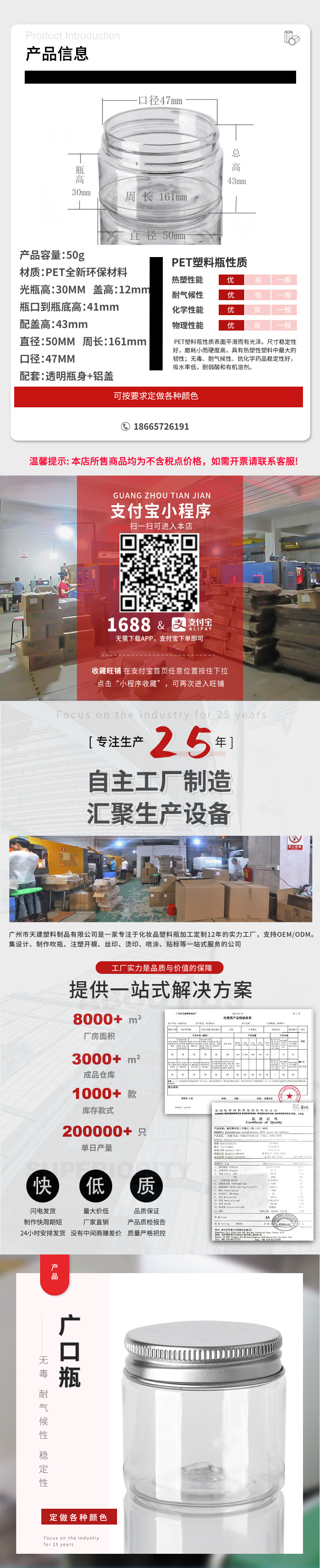 厂家现货50ml广口塑料瓶 PET透明塑料瓶 50g膏霜罐 铝盖广口瓶子