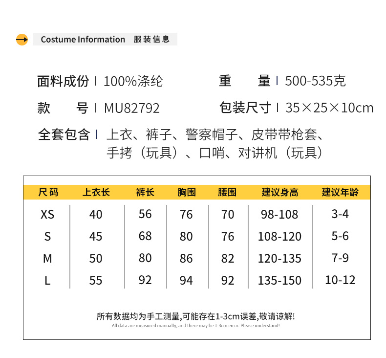 现货儿童警察角色扮演小孩游戏表演万圣节变装舞会派对服装