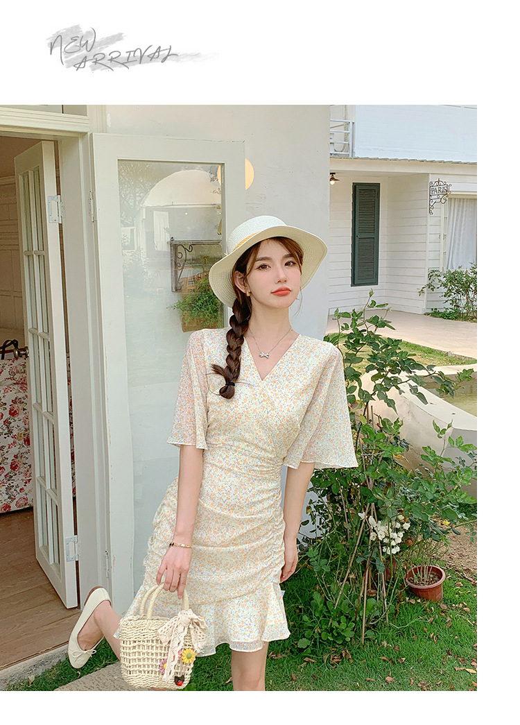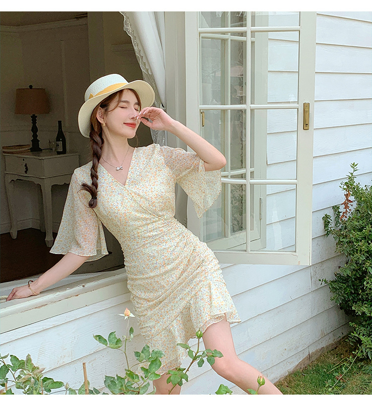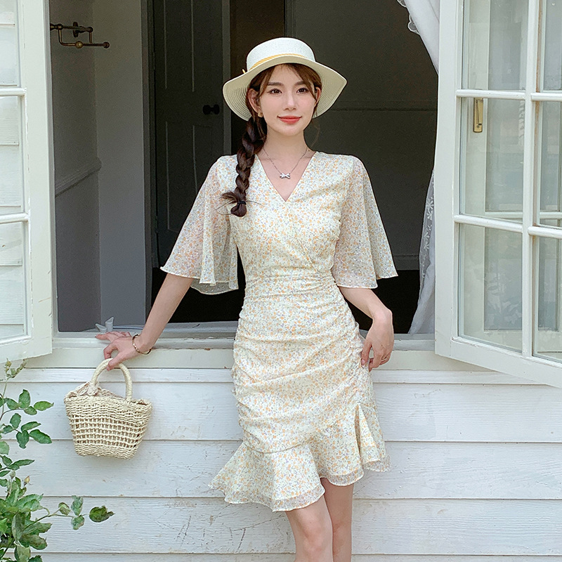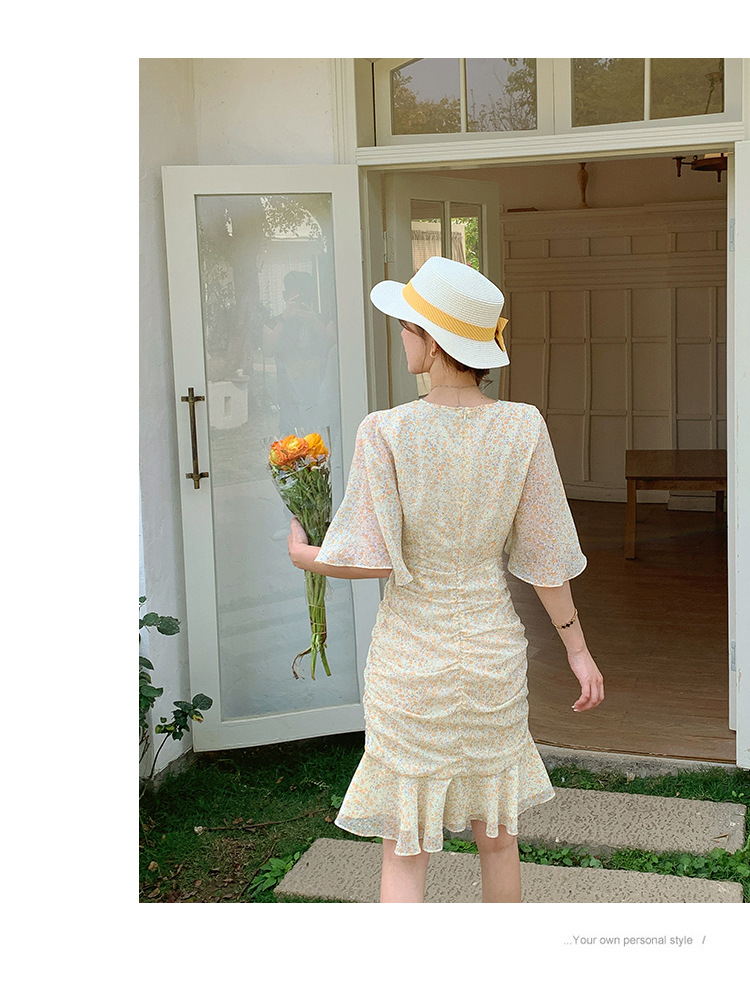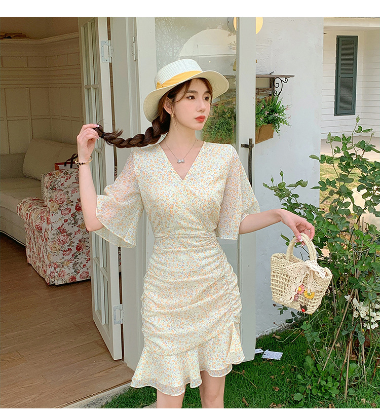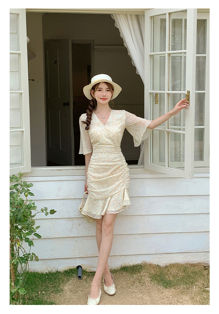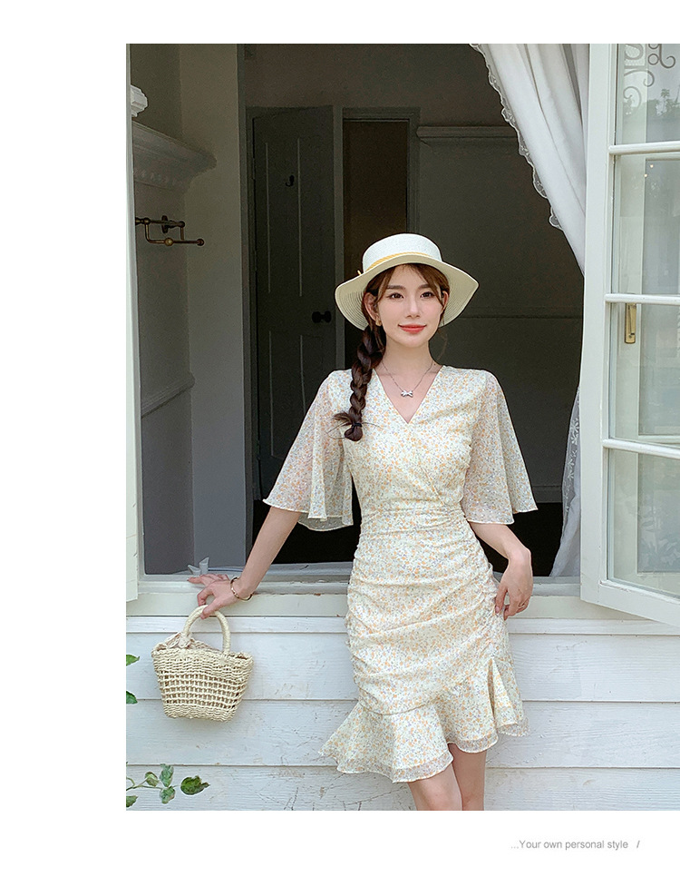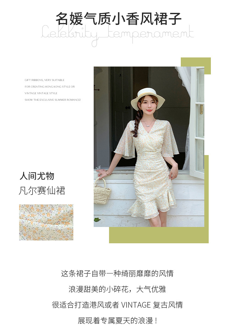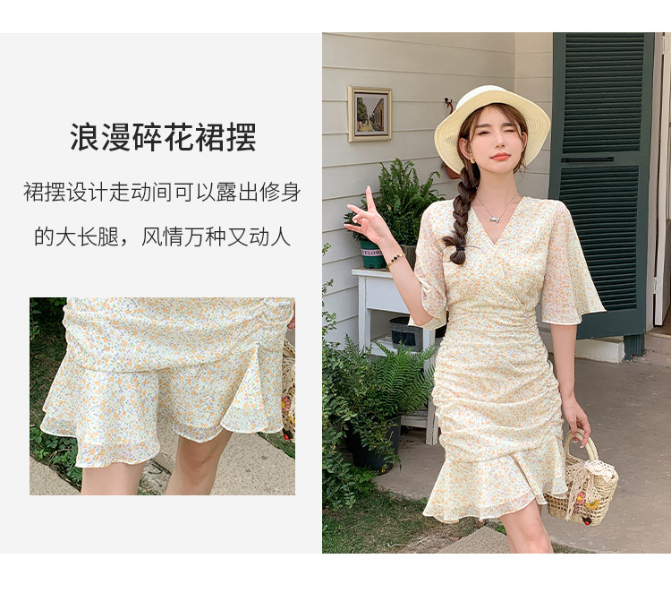 2023夏季新款修身显瘦温柔风V领碎花中长款鱼尾收腰短袖连衣裙
