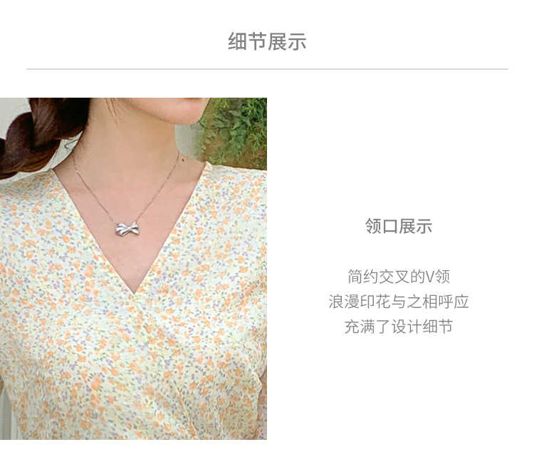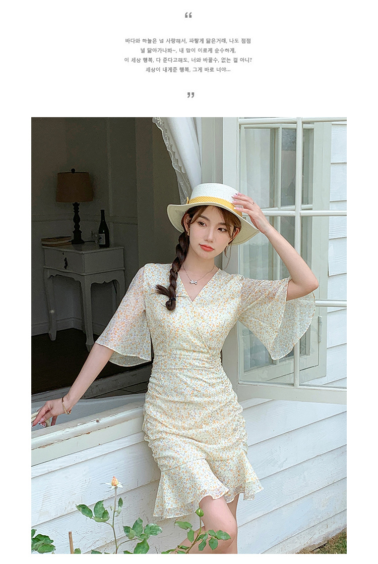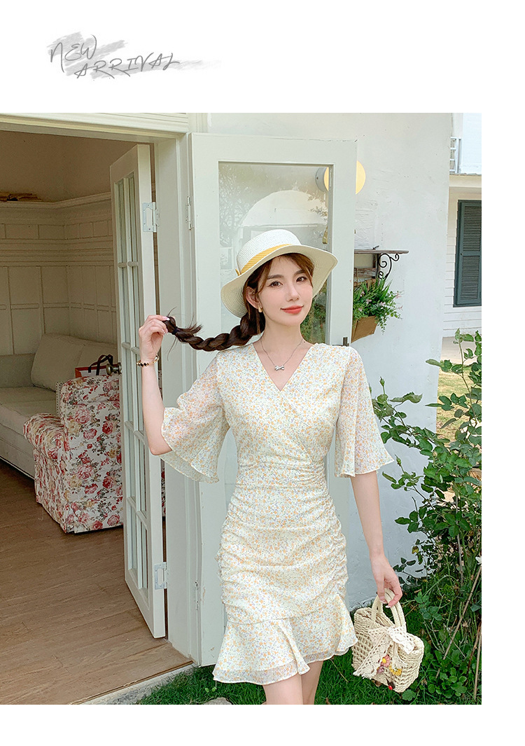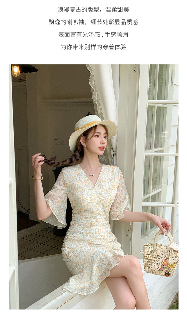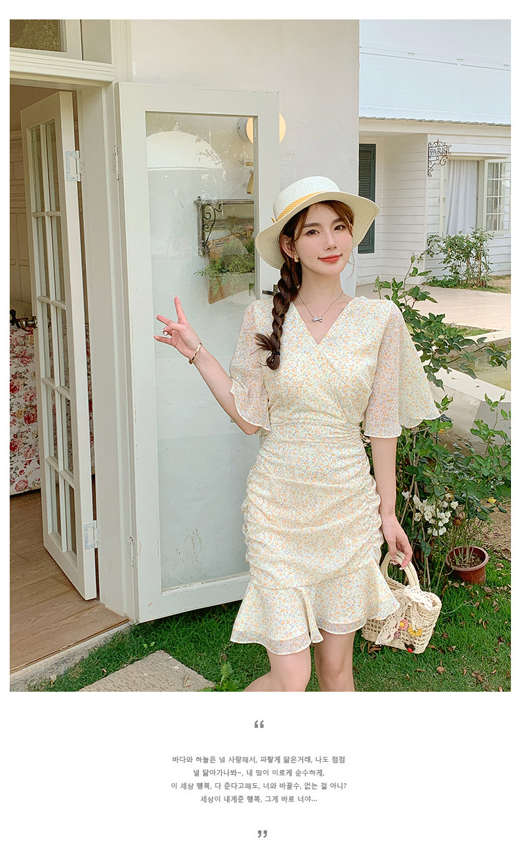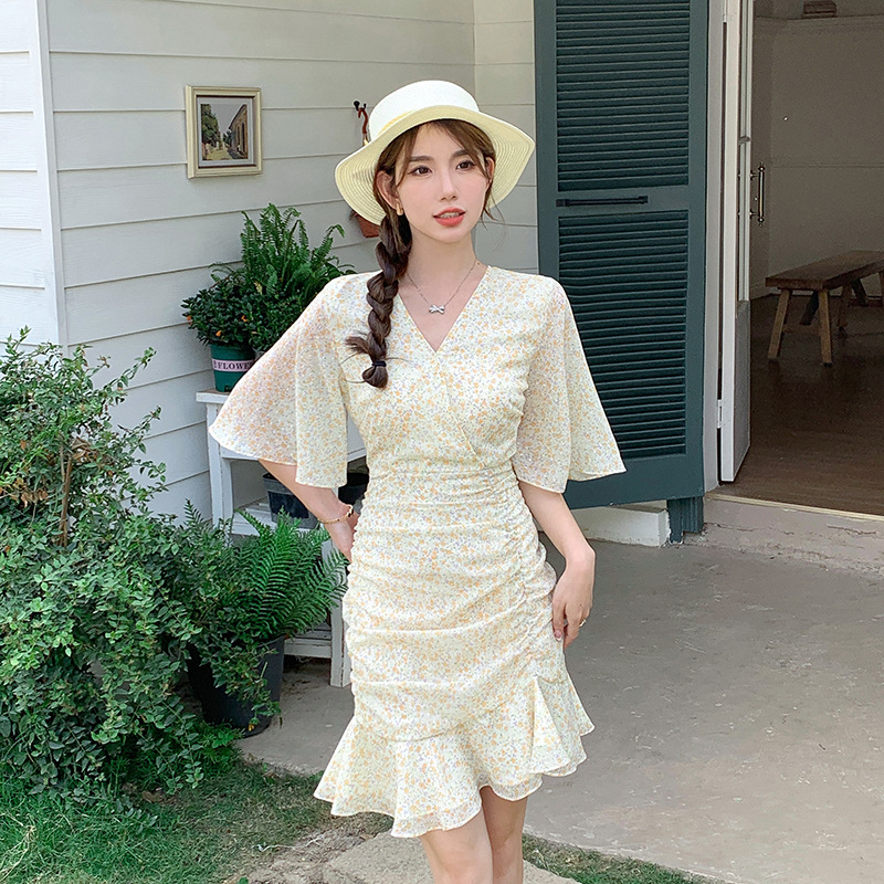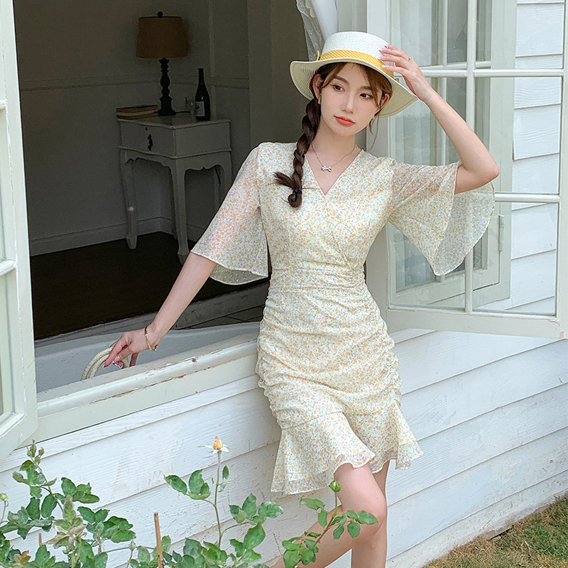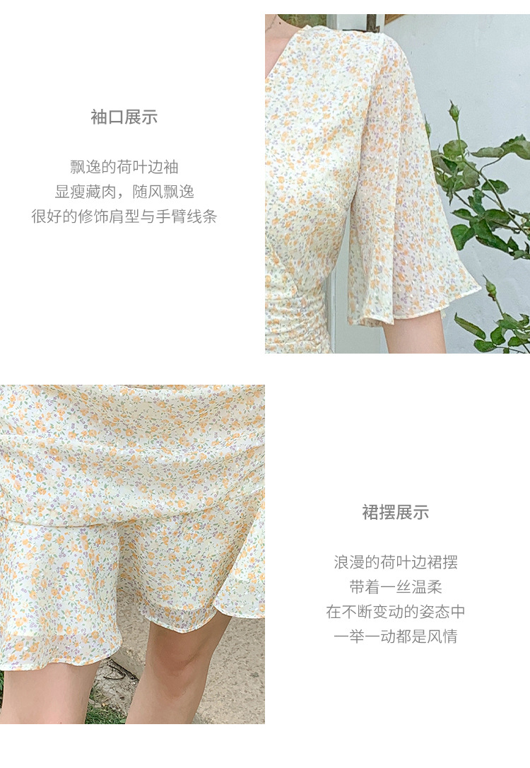 2023夏季新款修身显瘦温柔风V领碎花中长款鱼尾收腰短袖连衣裙