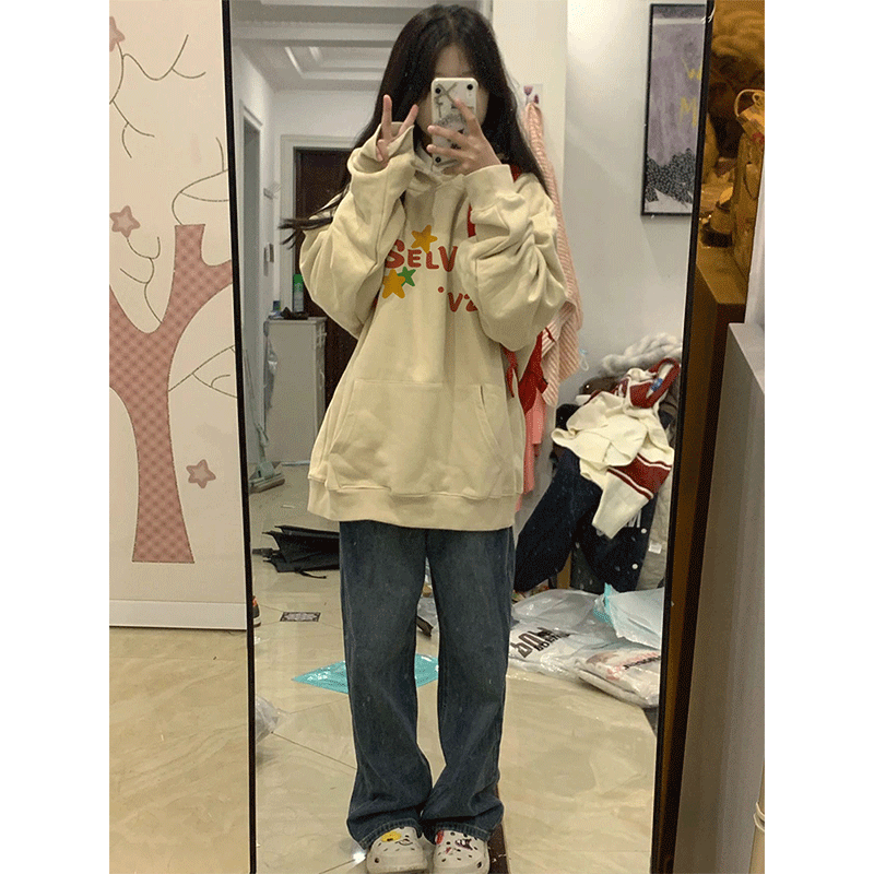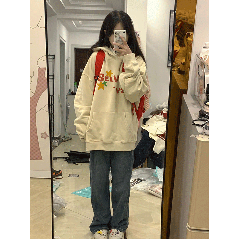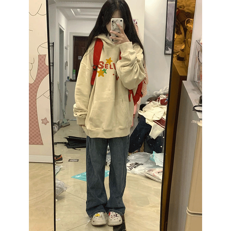 oversize寬鬆大尺碼奶黃衛衣女款春秋薄款2023新款美式重磅連帽上衣