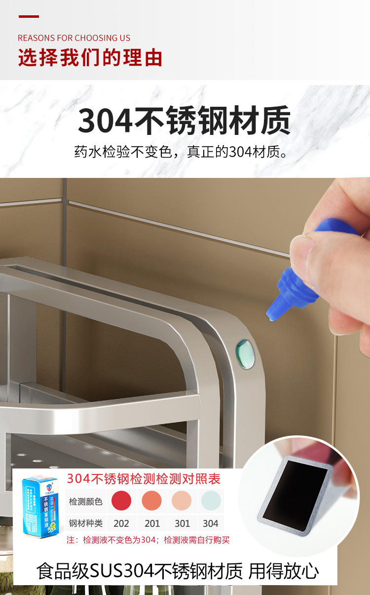 层数(规格) 两层单架子,两层单架+刀槽,两层单架+刀槽+筷子筒,两层单架+刀槽+砧板架,两层单架+刀槽+筷子筒+砧板架,三层单架子,三层单架+刀槽,三层单架+刀槽+筷子筒,三层单架+刀槽+砧板架,三层单架+刀槽+筷子筒+砧板架