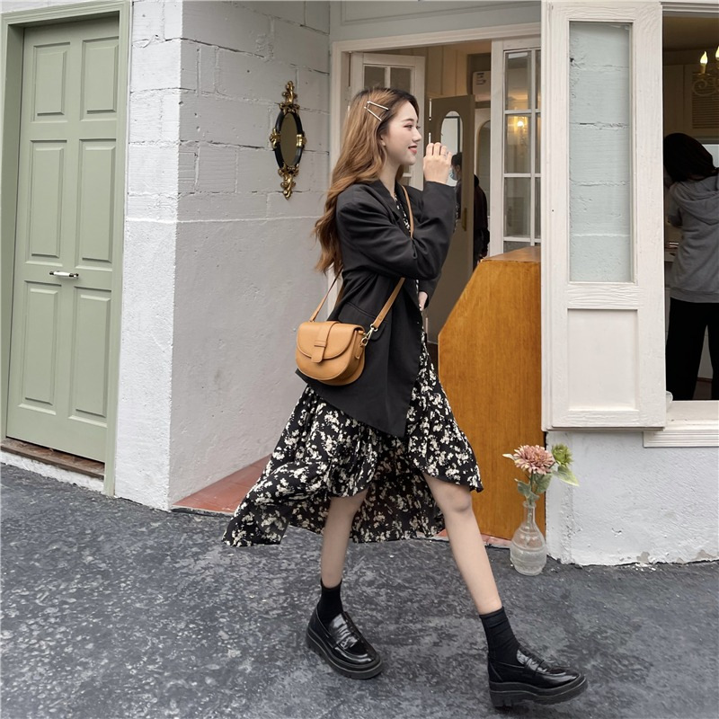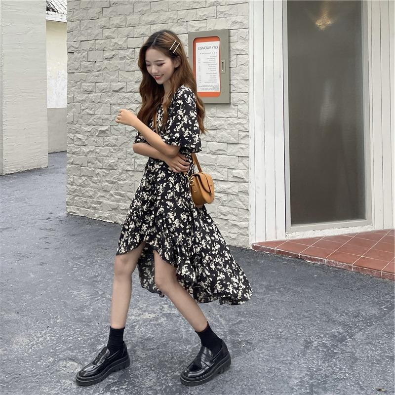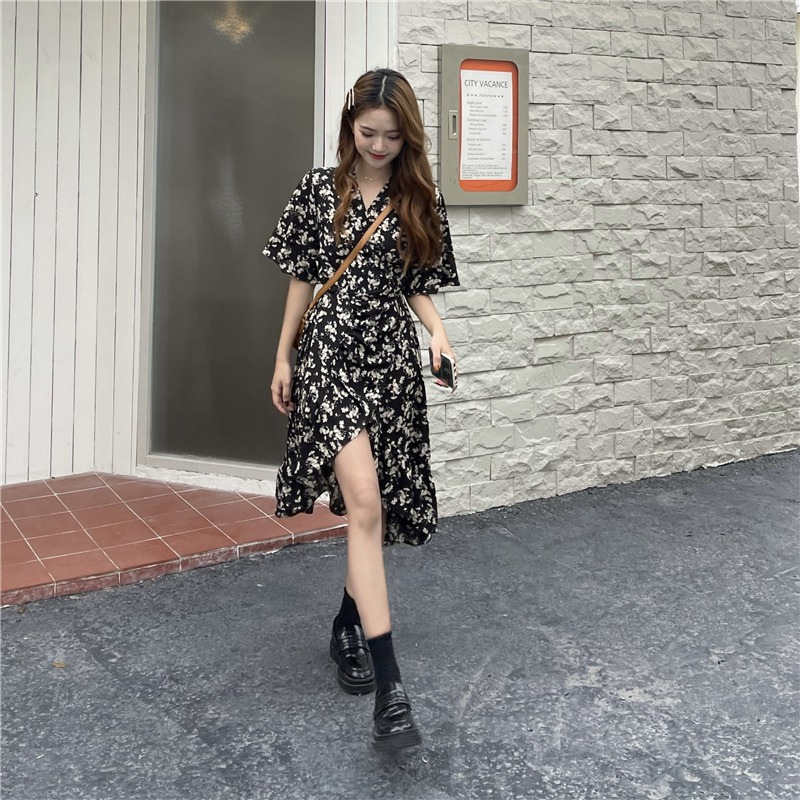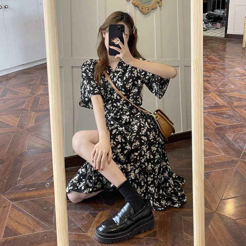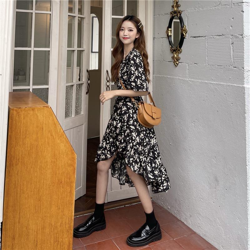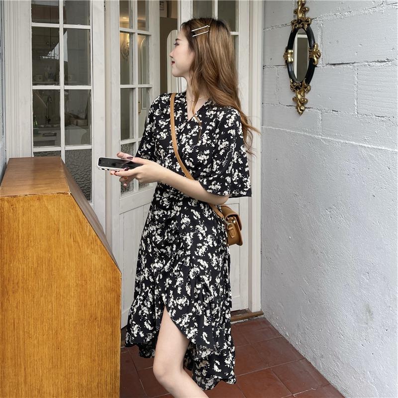 2023年夏季新款法式碎花连衣裙中长款女装收腰显瘦设计不规则裙子