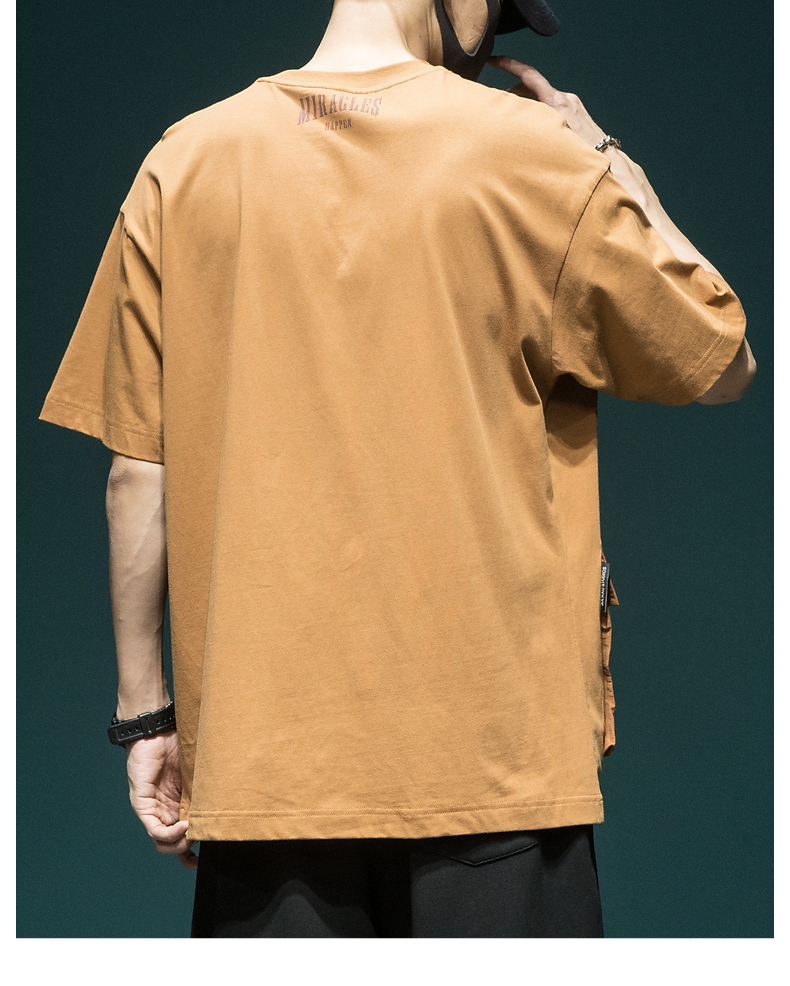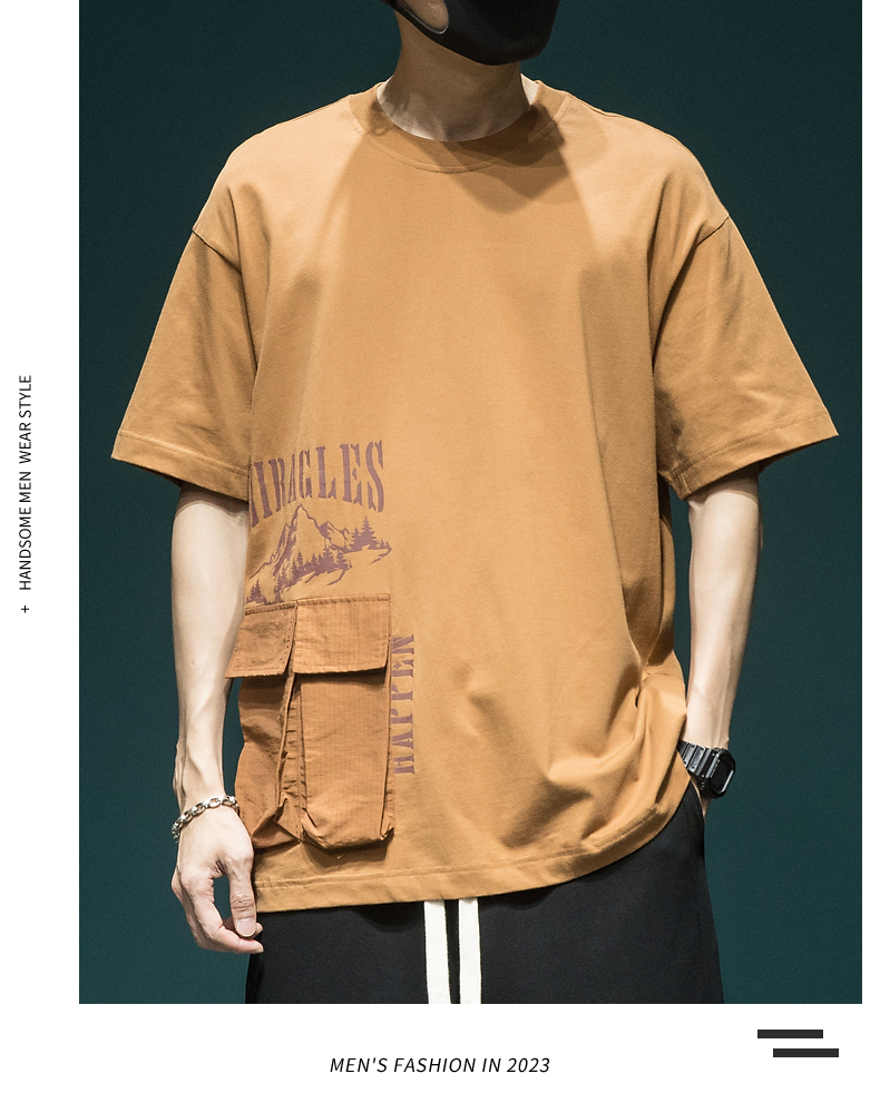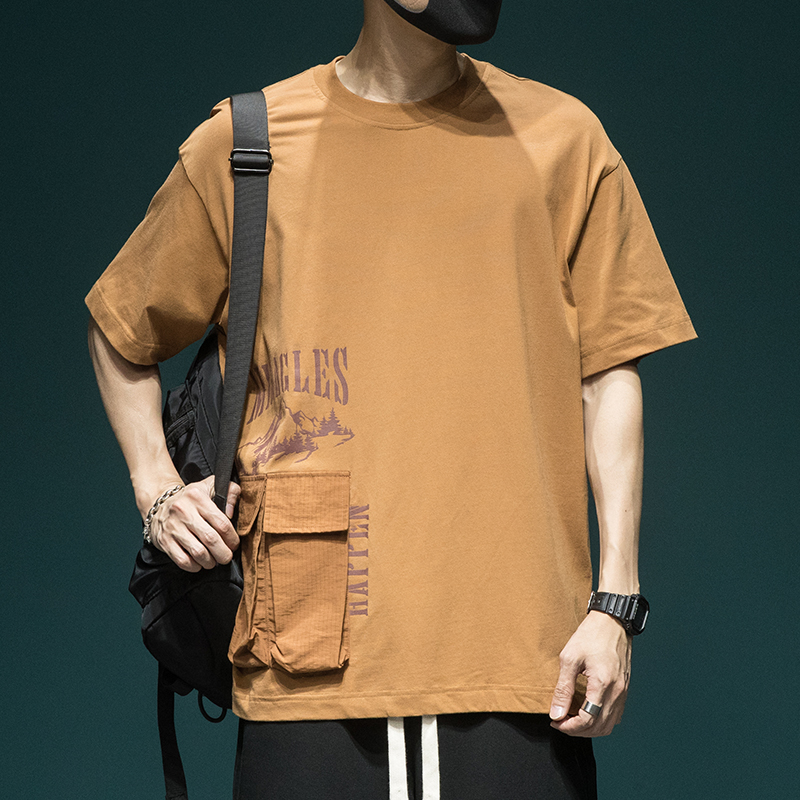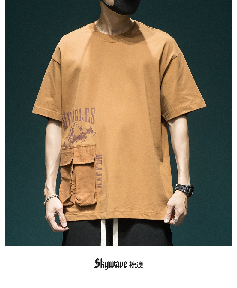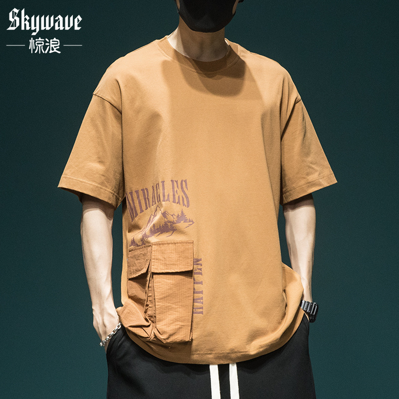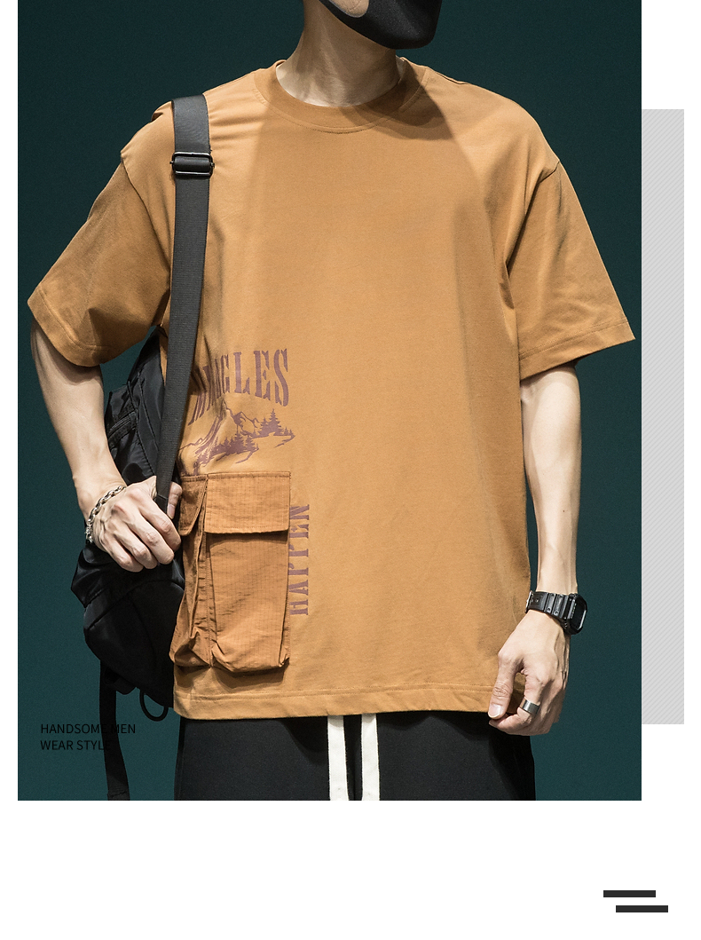 日系潮流短袖t恤男寬鬆大尺碼上衣純棉圓領貼袋設計感小眾半袖T恤