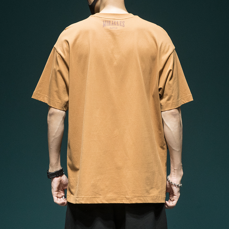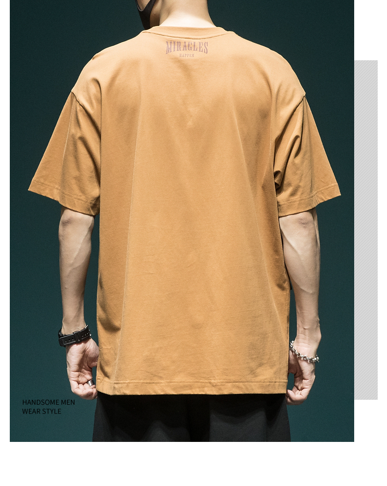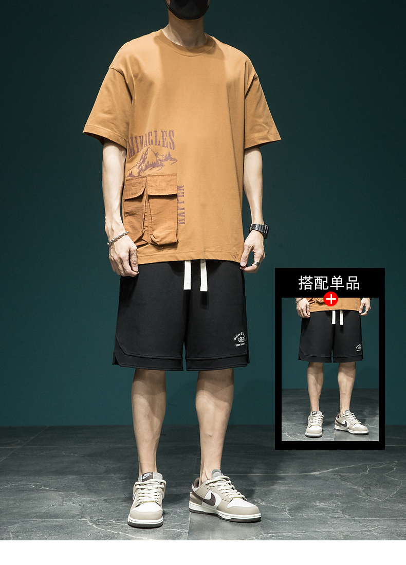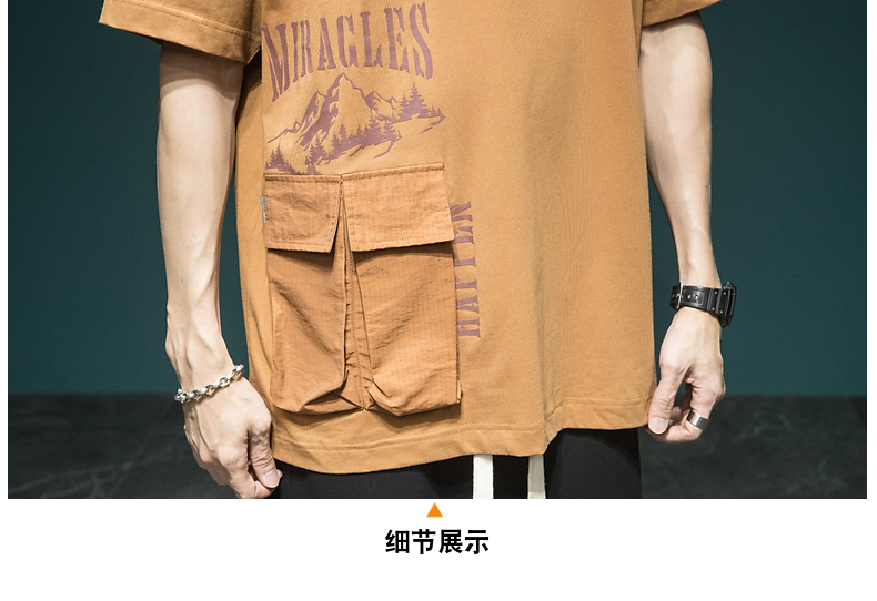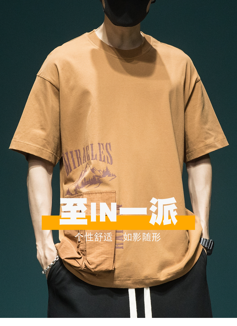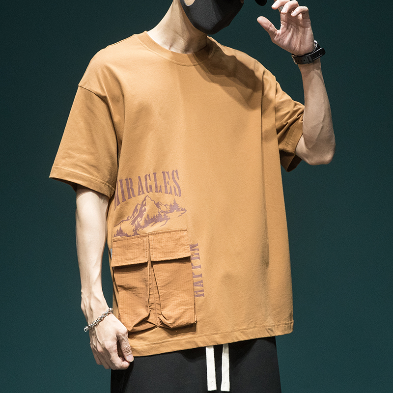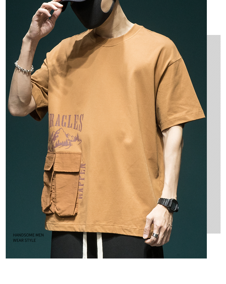 日系潮流短袖t恤男寬鬆大尺碼上衣純棉圓領貼袋設計感小眾半袖T恤