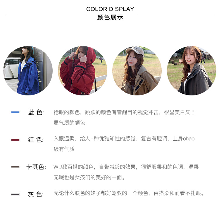 顏色分類 紅色(春秋款),藍色(春秋款),灰綠色(春秋款),深卡其布色(春秋款),紅色(加絨款),藍色(加絨款),灰綠色(加絨款),深卡其(加絨款),白色(春秋款),黃色(春秋款),白色(加絨款)