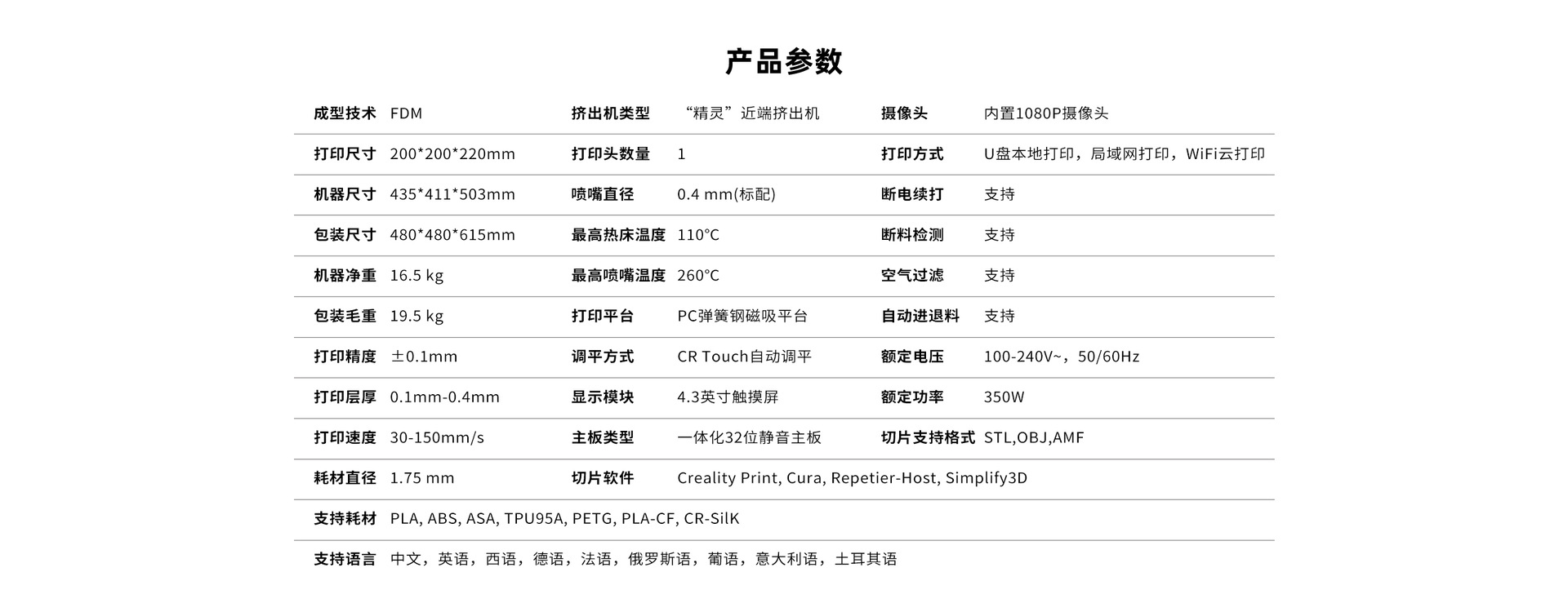 适用原材料 PLA/ABS/TPU/PETG/ASA/CR-Silk
