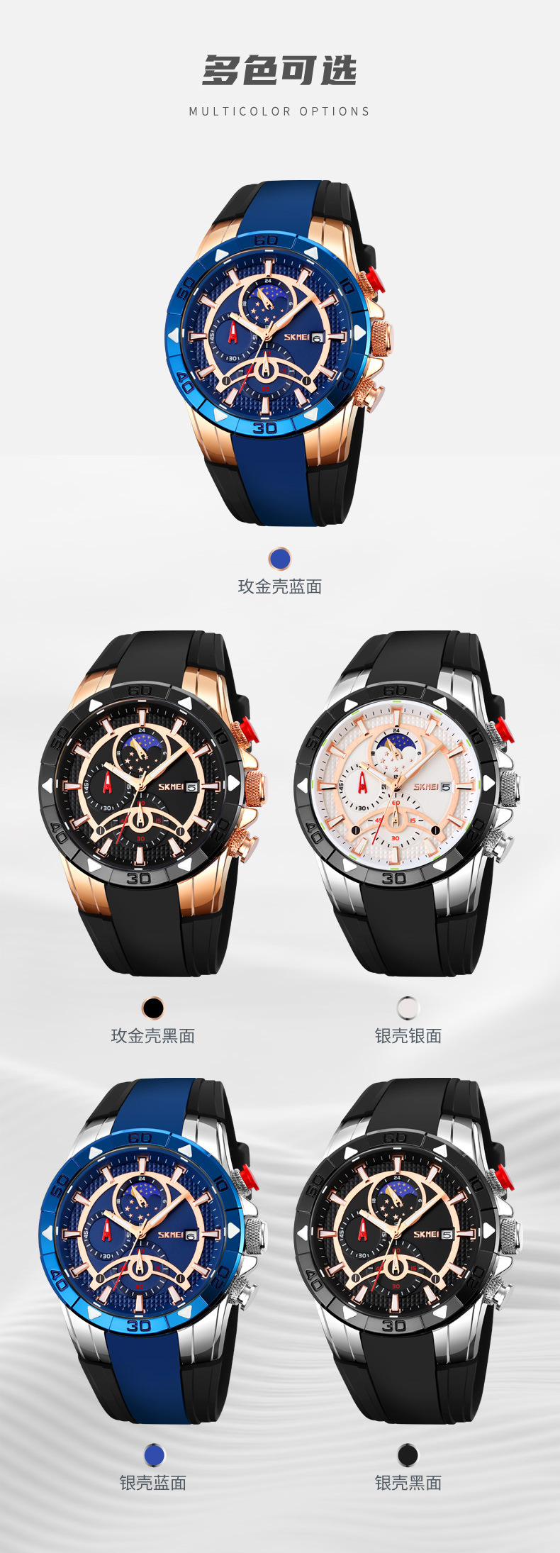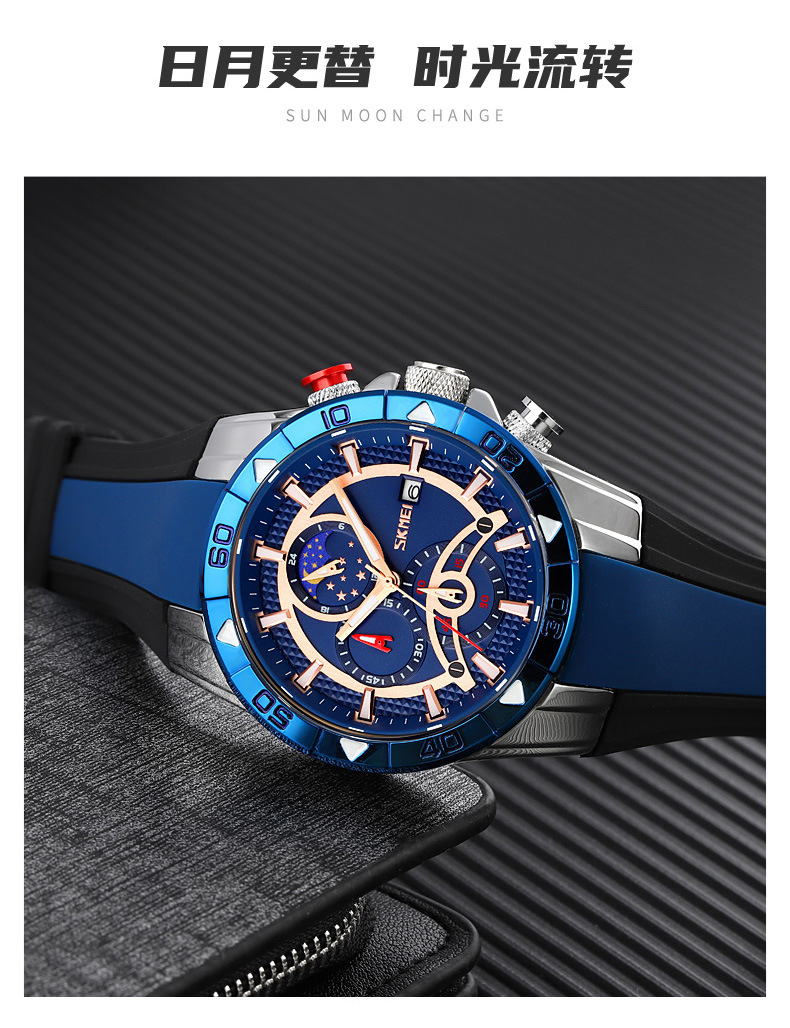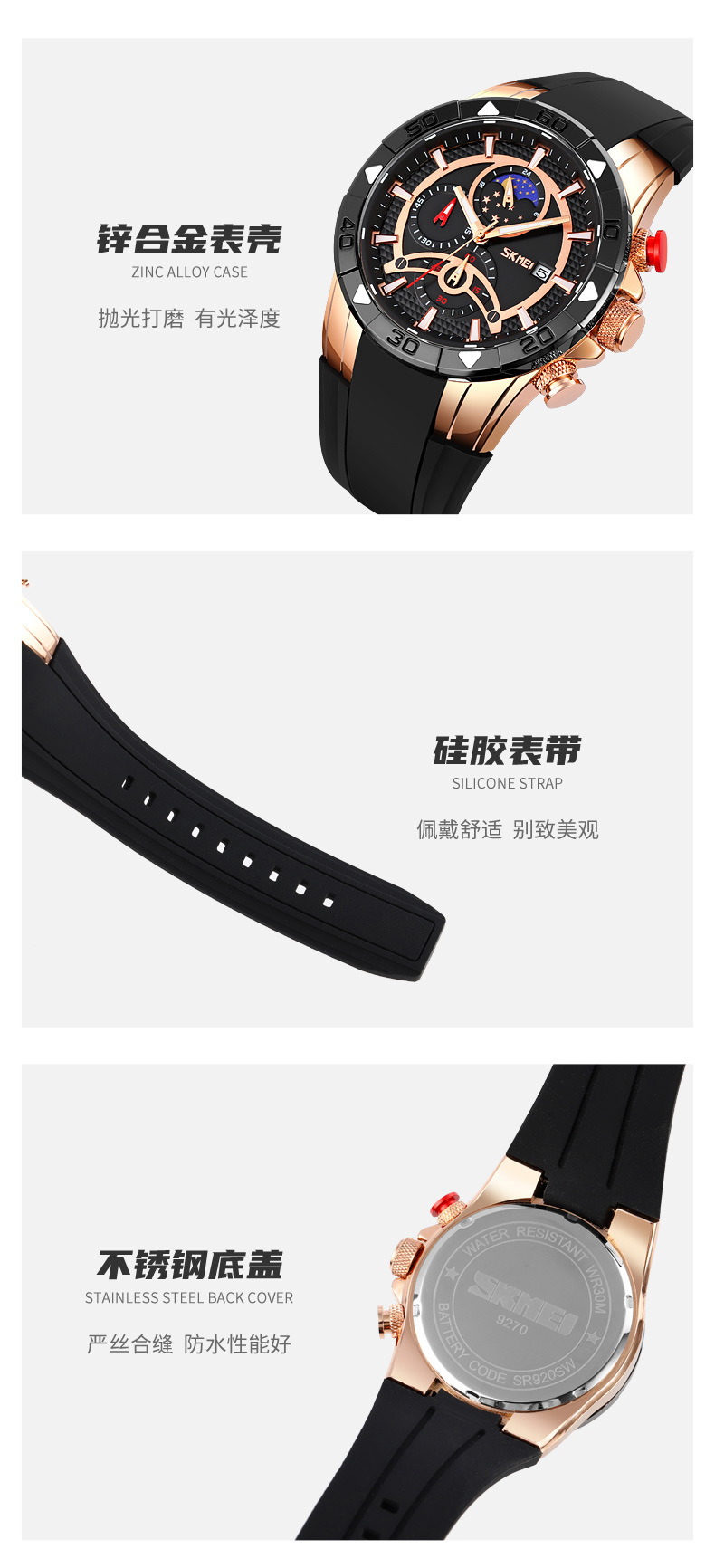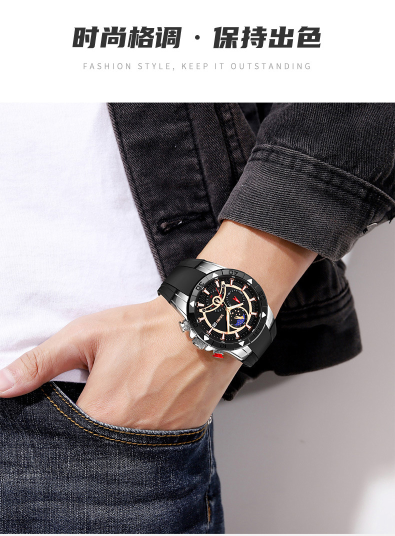 时刻美硅胶带石英表日常防水男士计时手表三眼六针月相日期男腕表