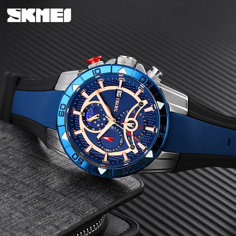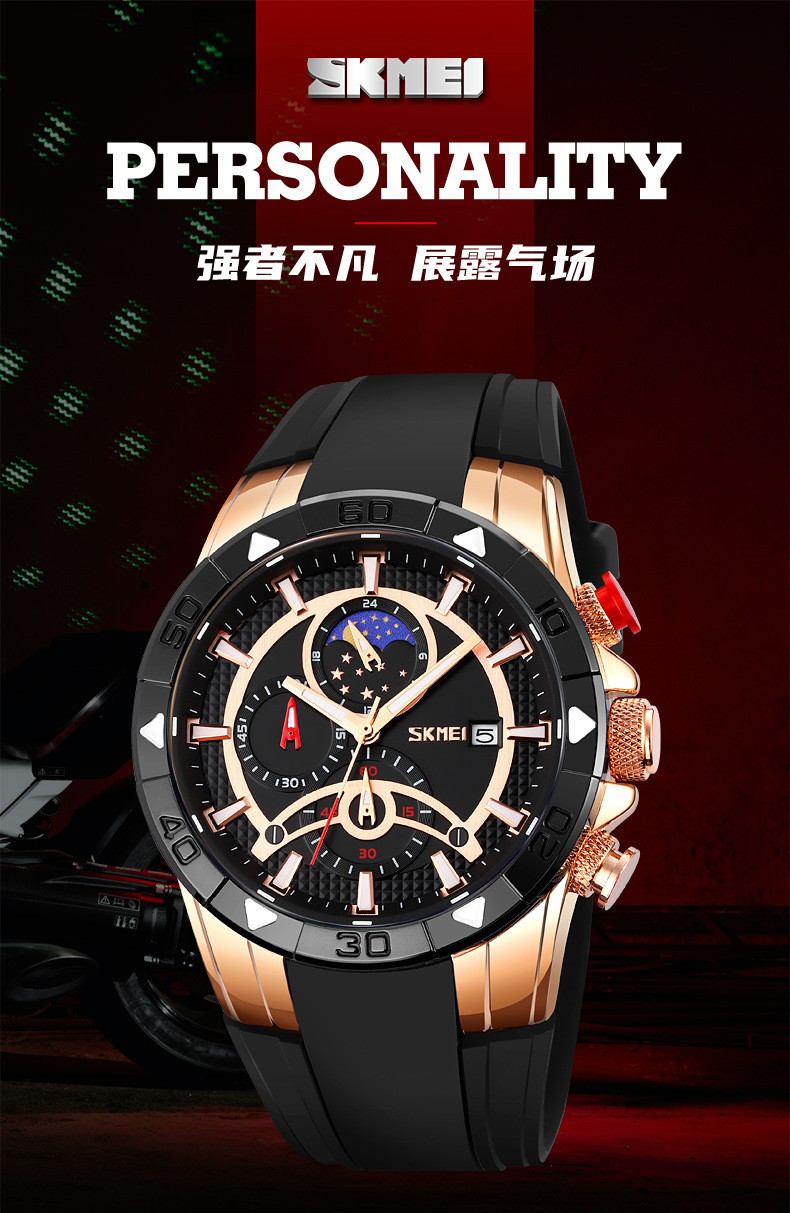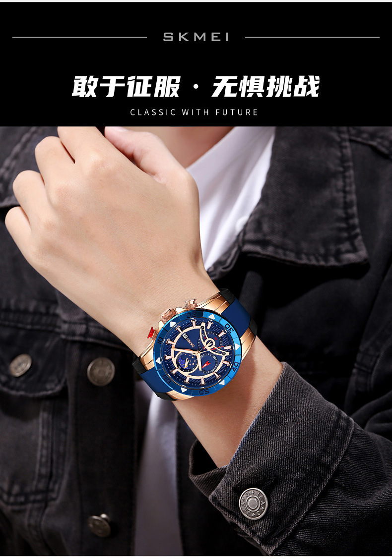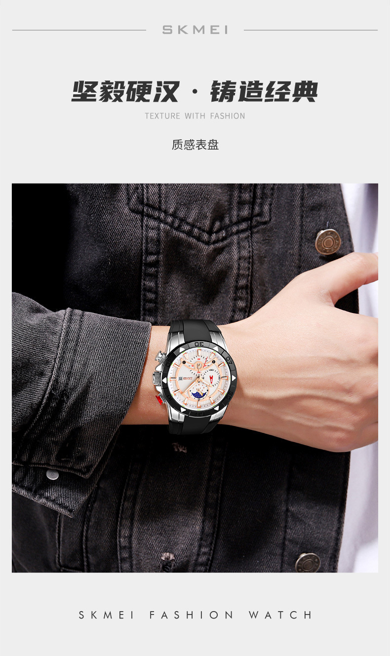 时刻美硅胶带石英表日常防水男士计时手表三眼六针月相日期男腕表