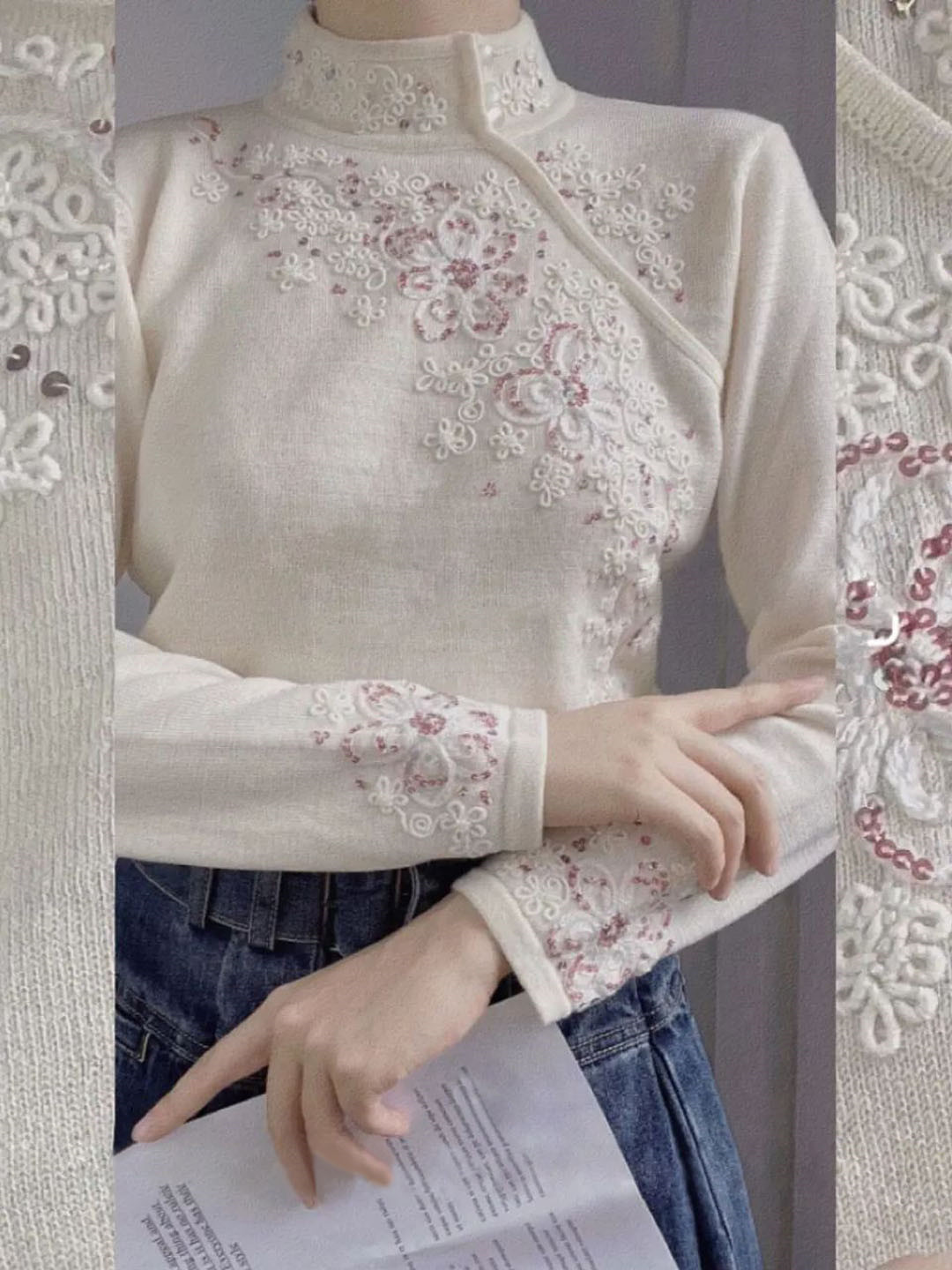 外貿出口大牌撿漏刺繡中國風針織毛衣女春秋百搭復古別致上衣潮