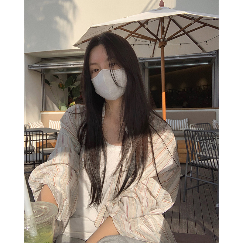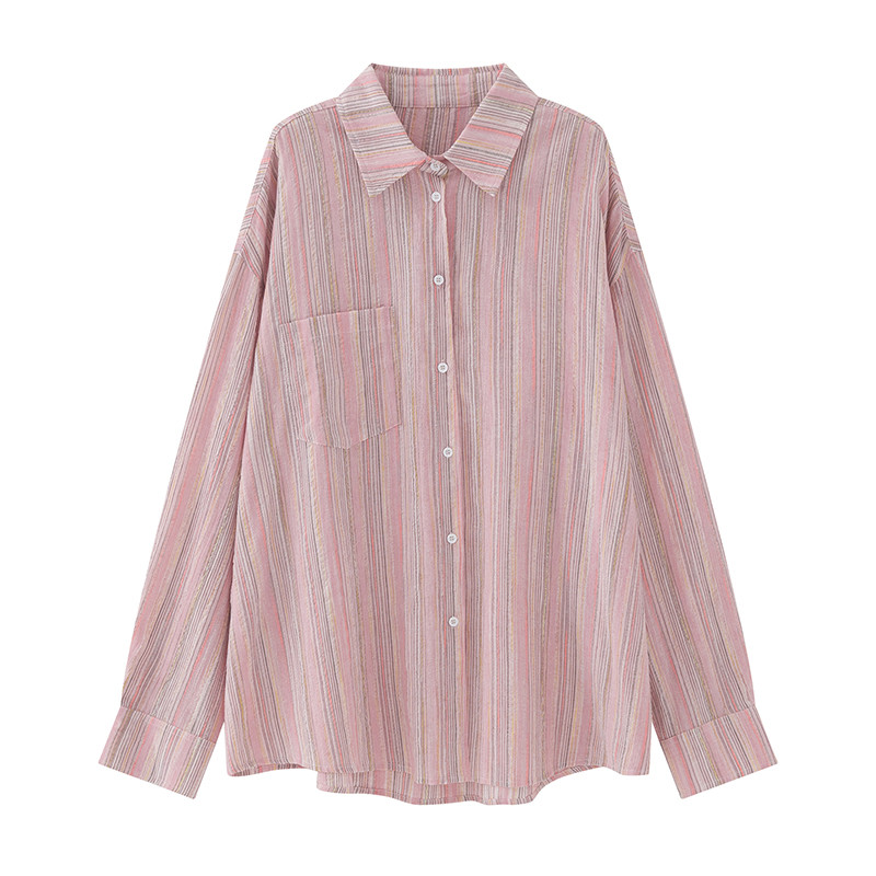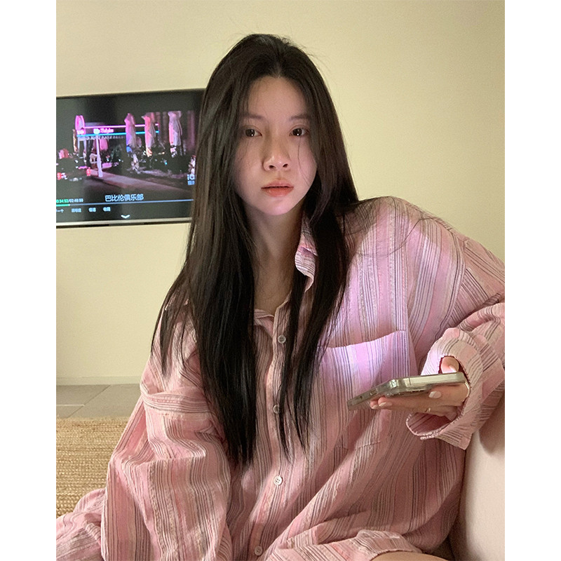 粉色條紋襯衫女2023夏季韓版慵懶風襯衫寬鬆長袖防曬上衣外套薄款