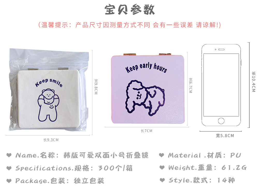 颜色 11#零食小熊折叠镜,12#沐浴小熊折叠镜,1#草莓茶茶熊,2#曲奇茶茶熊,3#雪糕芮芮兔,4#草莓芮芮兔,5#挎包芮芮兔,6#软萌小熊小兔,1#圆形粉白格兔,2#圆形紫白格兔头,3#圆形黄白格熊,4#方形绿白格兔,5#方形橘格熊头,6#方形蓝白格兔,4#软萌女孩圆镜,8#花朵女孩方镜