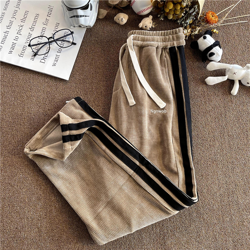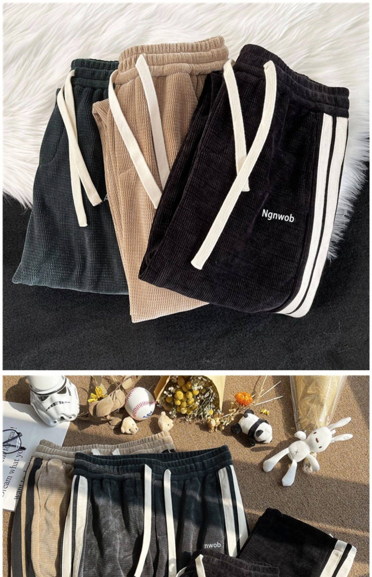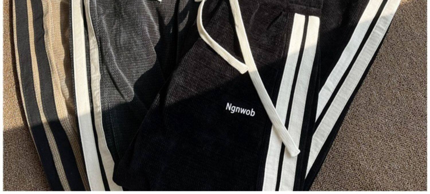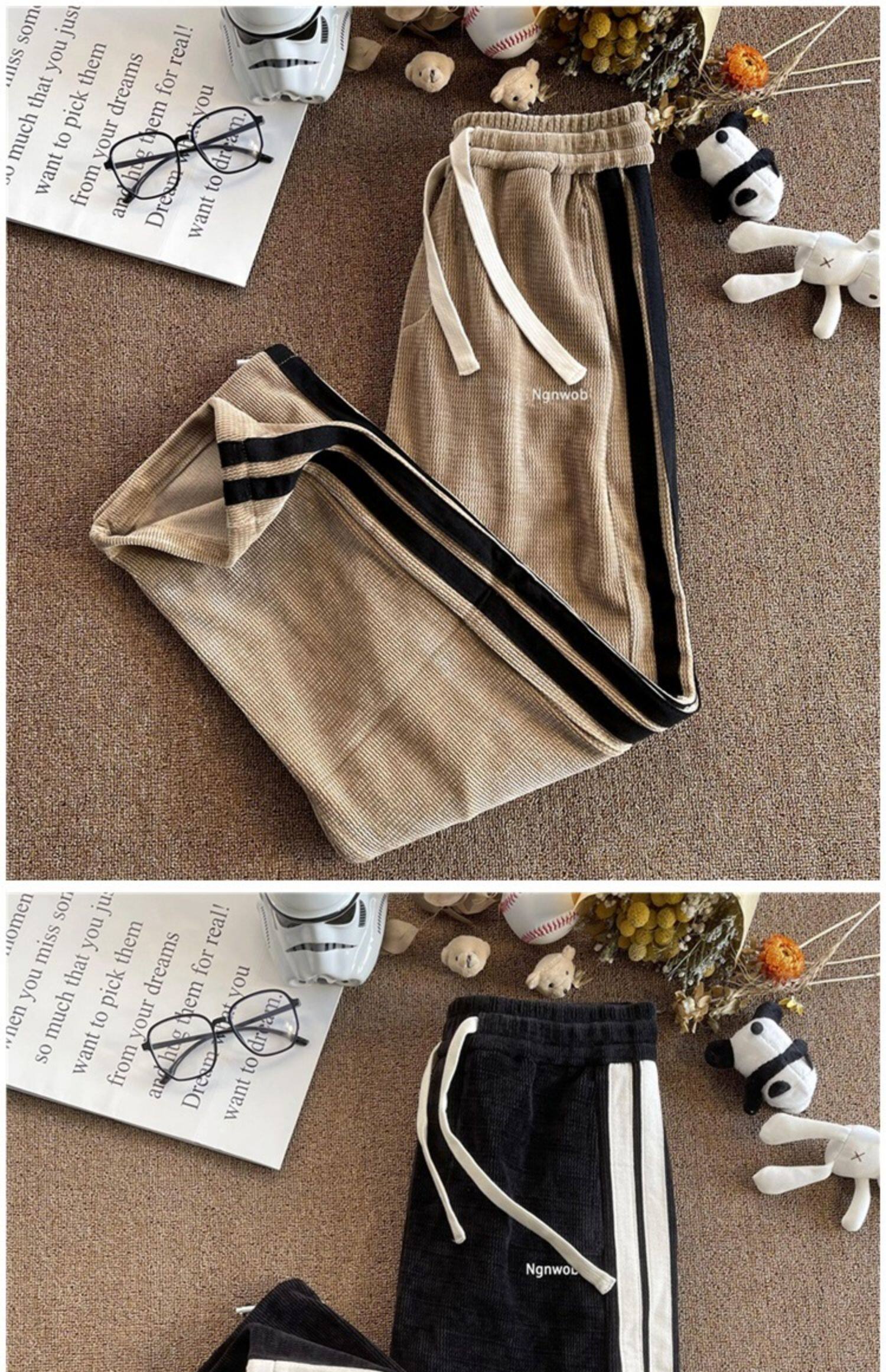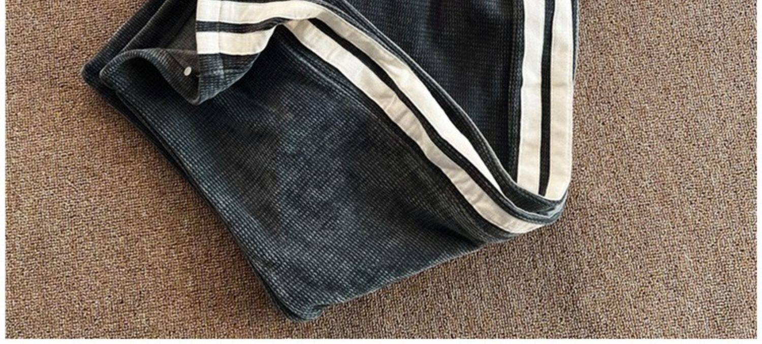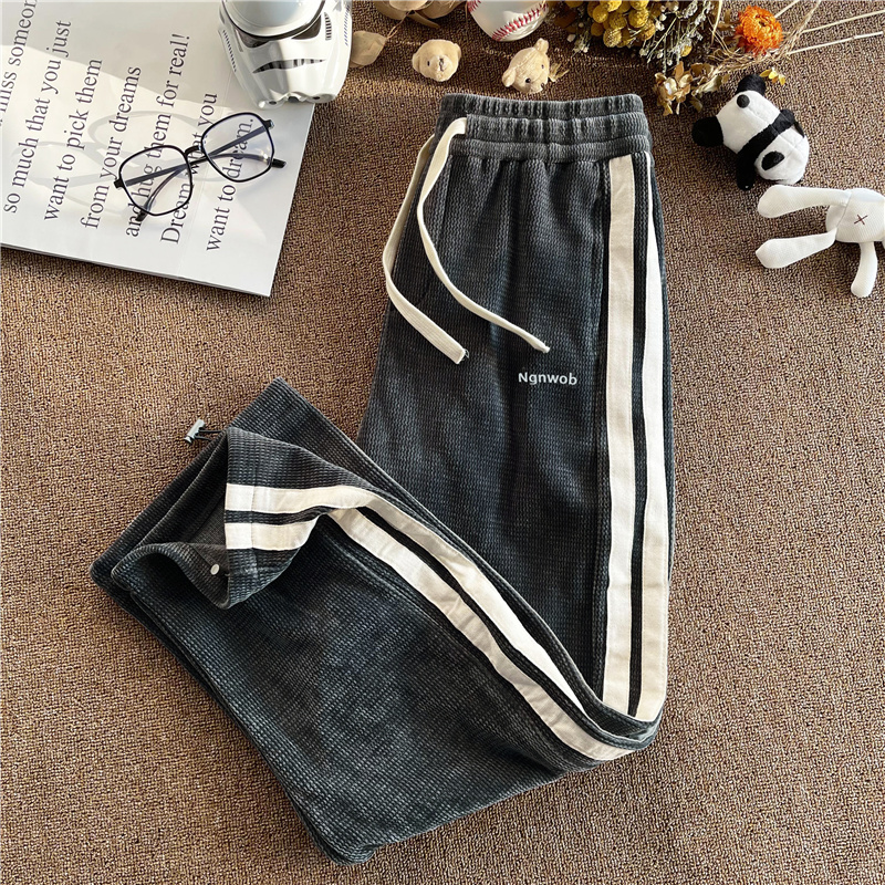 華夫格衛褲ins高街拼色條紋休閒褲男夏季百搭潮牌寬鬆直筒運動褲