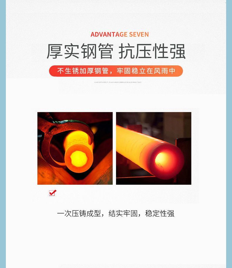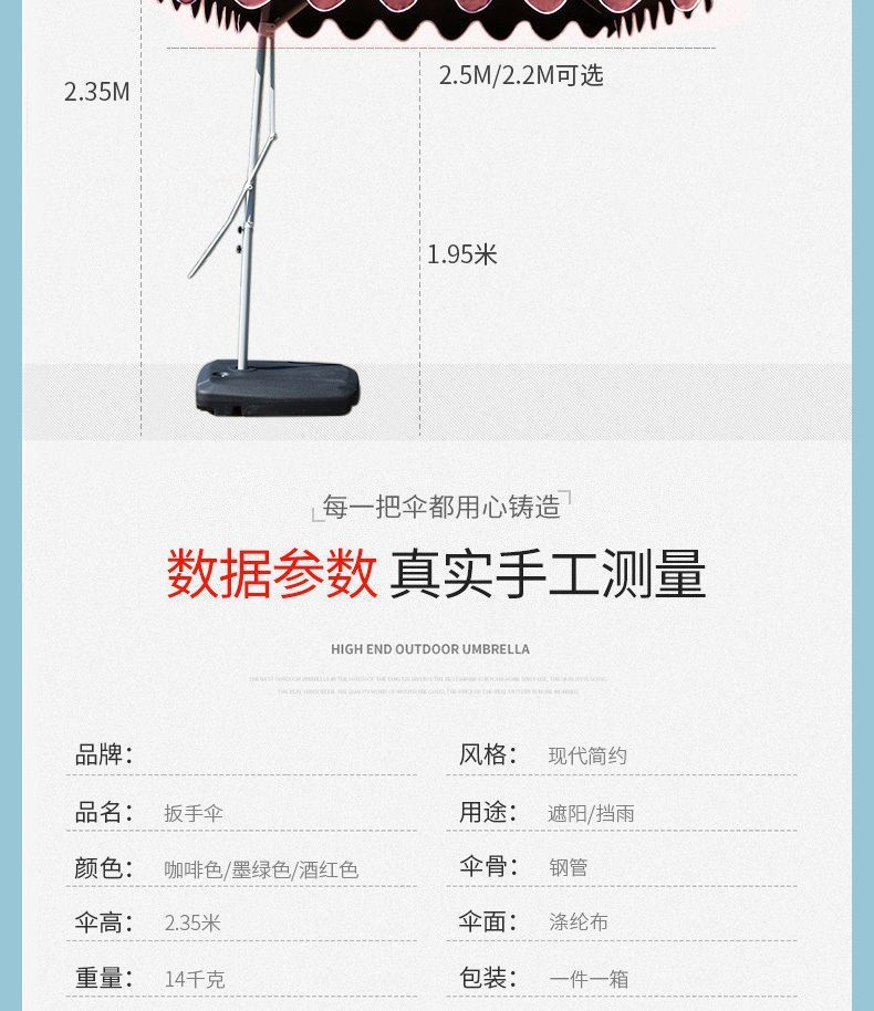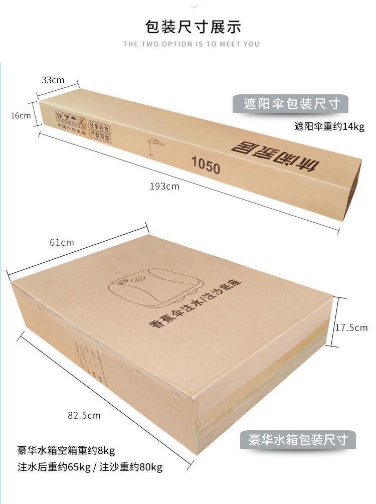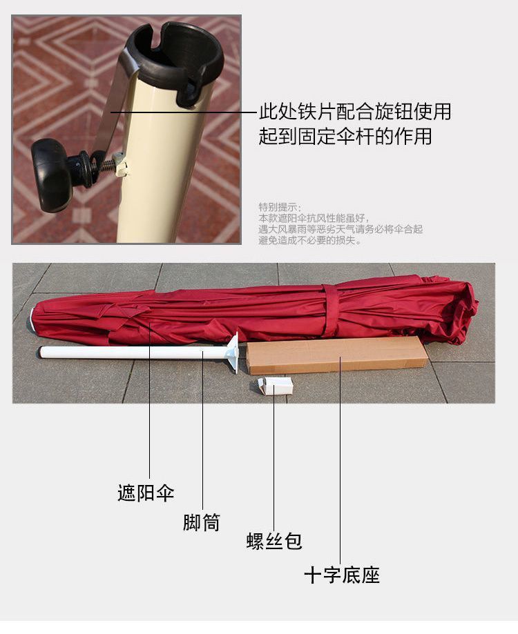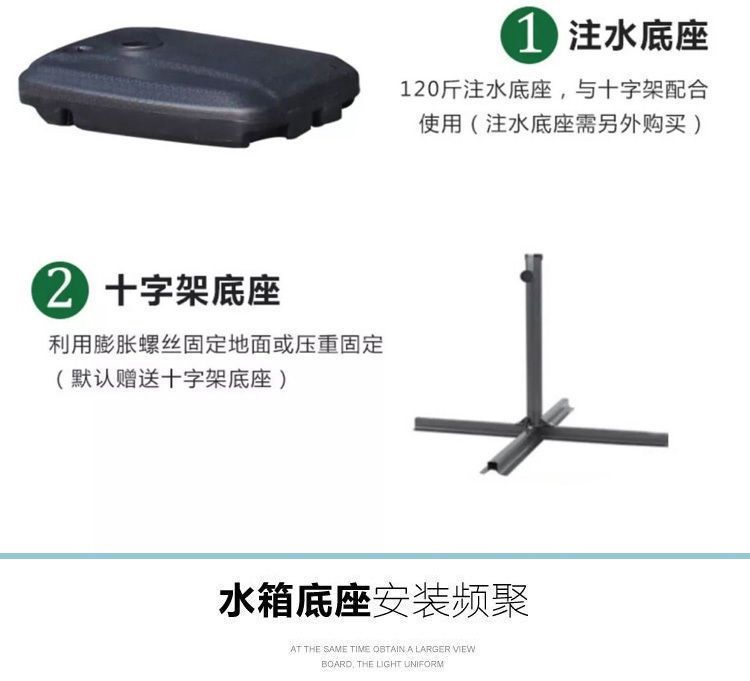 尺寸 2.2米4股送十字架,2.5米4股送十字架,2.2米4股送120斤水箱,2.5米4股送120斤水箱,2.5米8股送十字架,2.5米8股送120斤水箱,2.7米中柱伞送44斤水箱