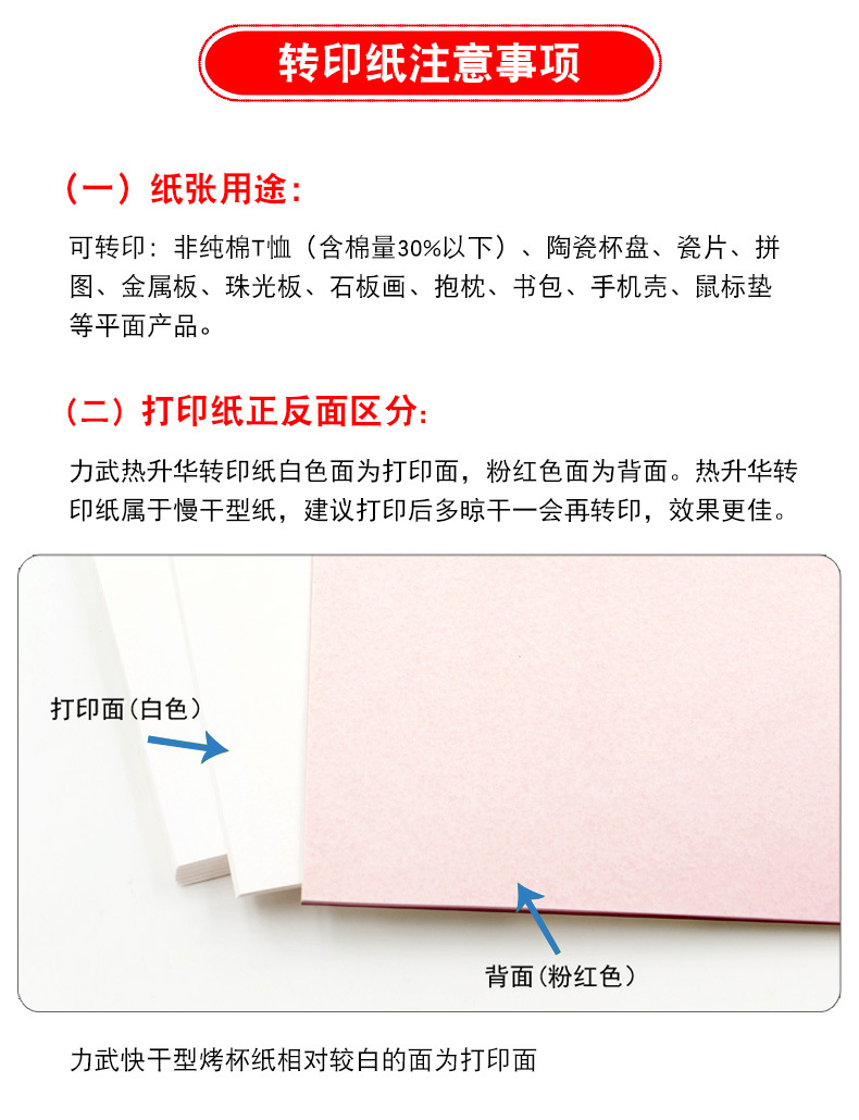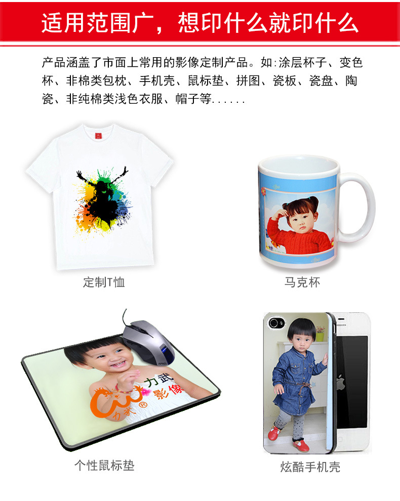 规格 A4 100g热升华转印纸 100张,A3 100g热升华转印纸 100张,A4 加厚125g热升华转印纸 100张,A3 加厚125g热升华转印纸 100张,【快干型】A4 100g热升华转印纸 100张,【快干型】A3 100g热升华转印纸 100张,A4 108g快干烤杯纸 100张,A3 128g快干烤杯纸 100张,热升华转印墨水 6色/6瓶