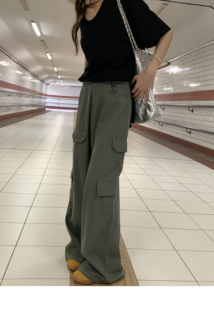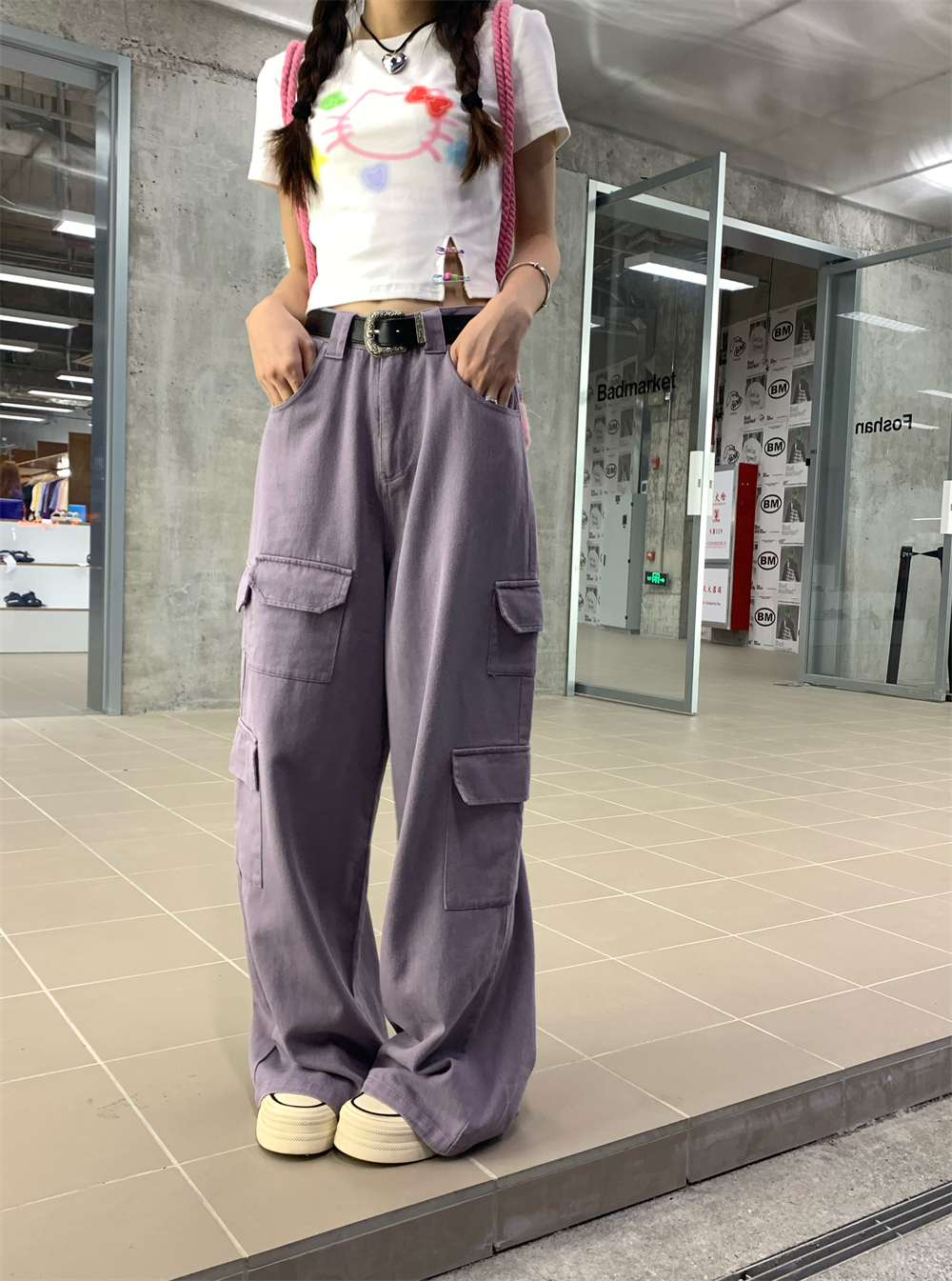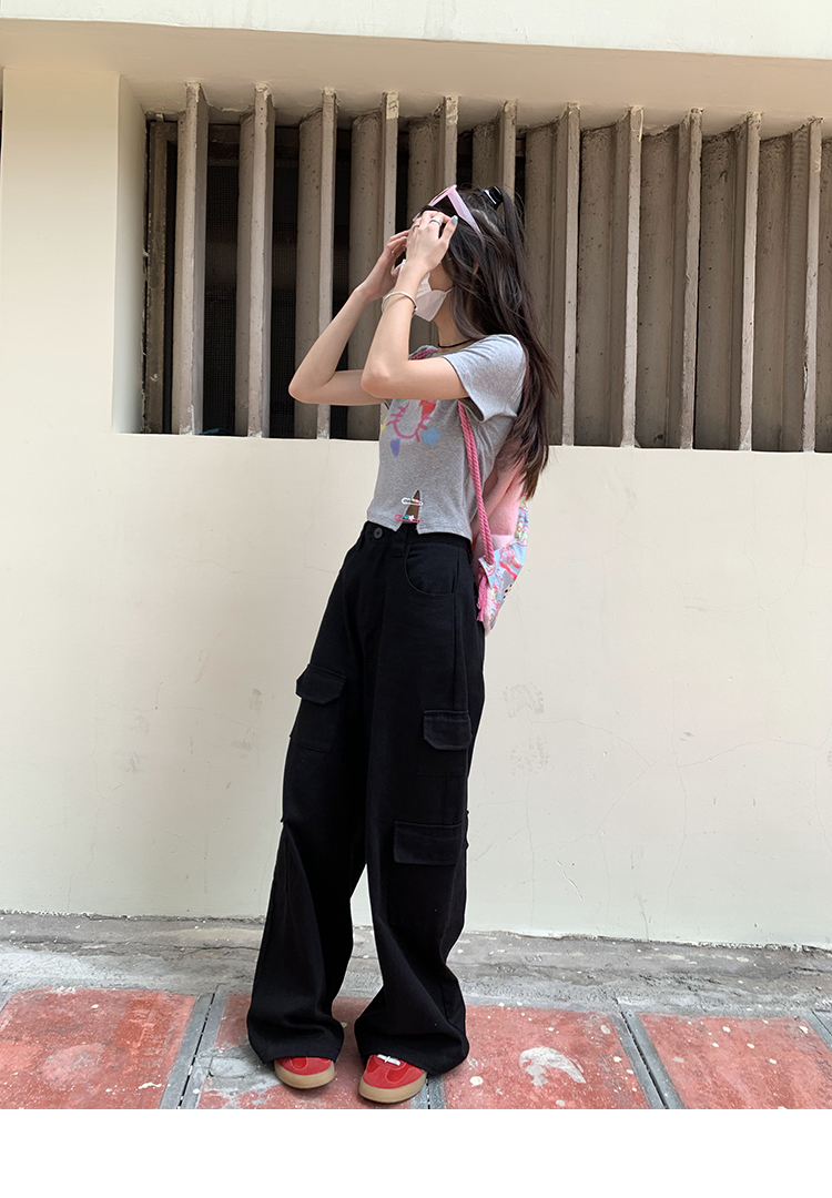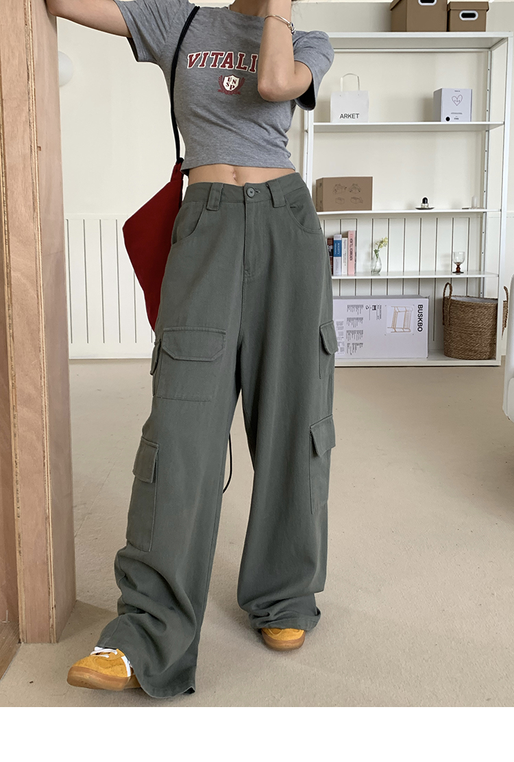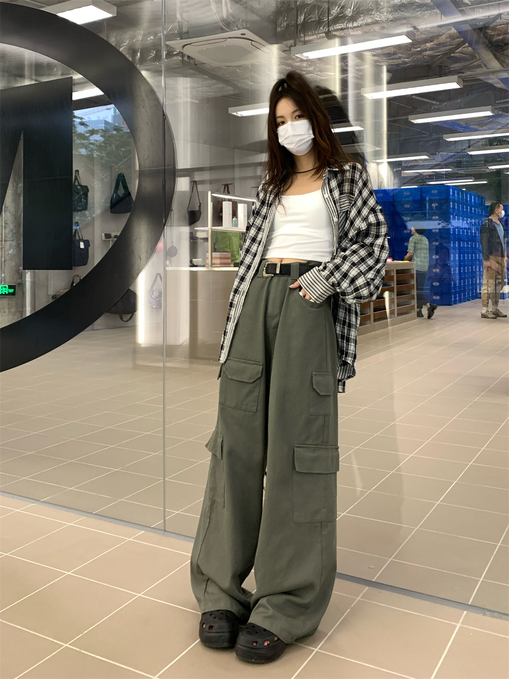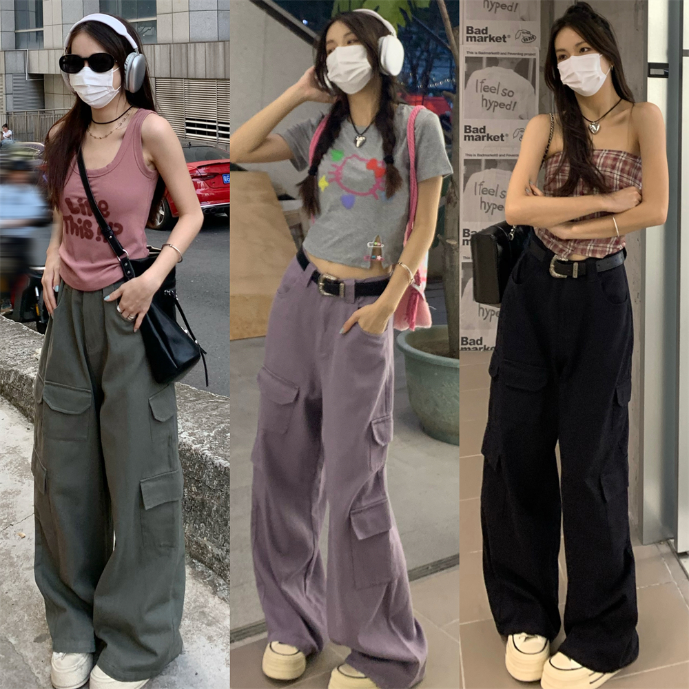 荒荒家 口袋工裝褲2023夏季新款港風寬鬆高腰機能闊腿休閒褲女ins