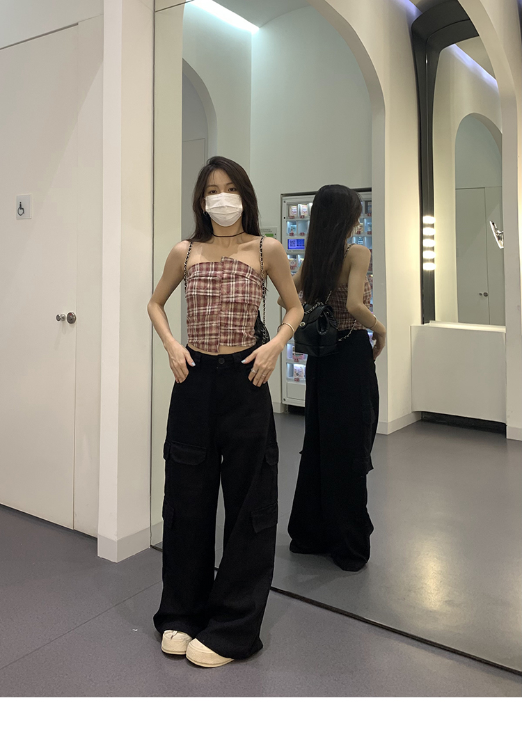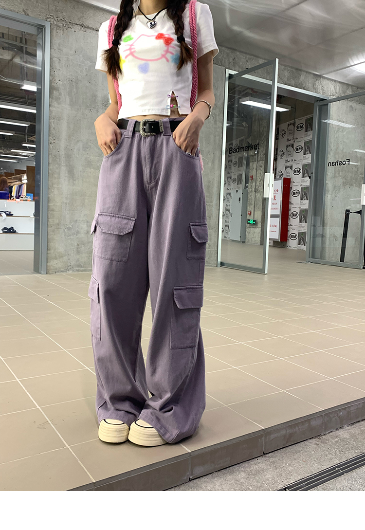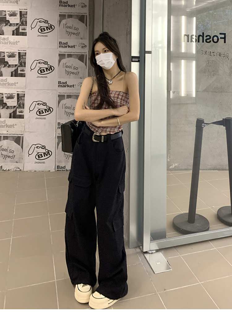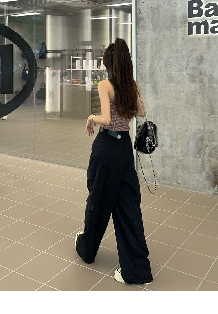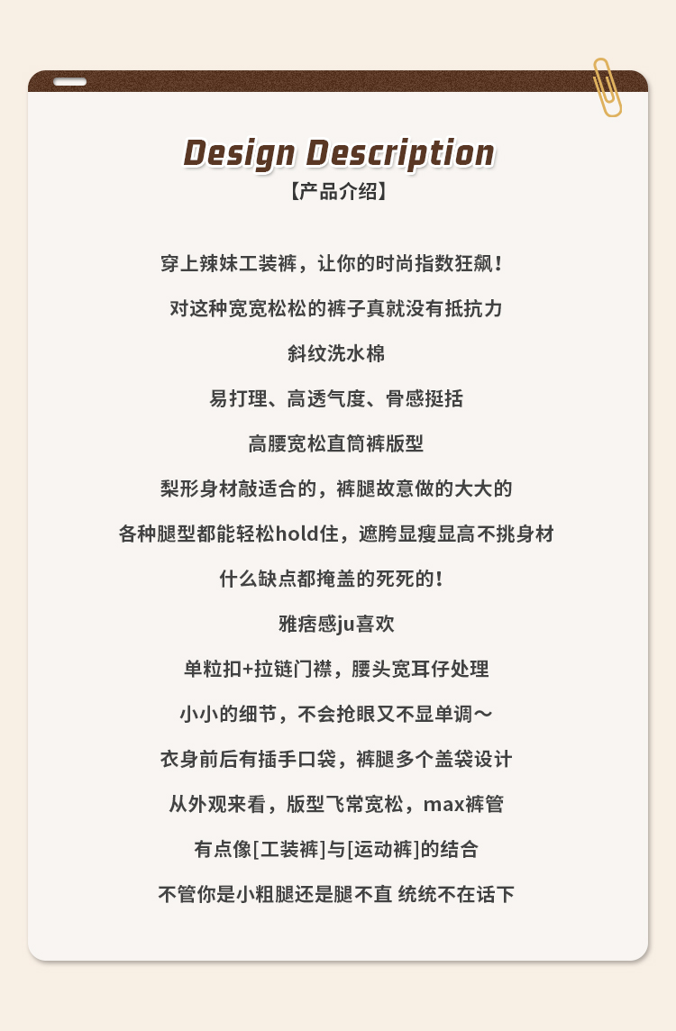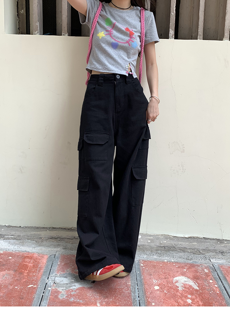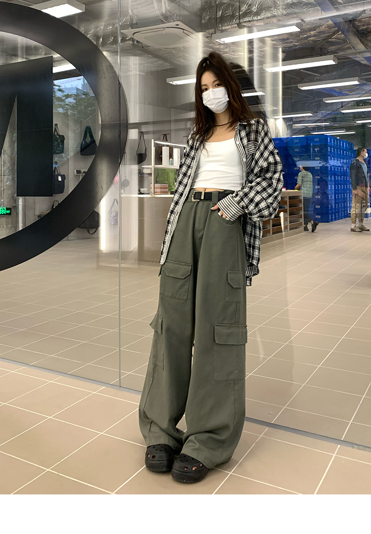 荒荒家 口袋工裝褲2023夏季新款港風寬鬆高腰機能闊腿休閒褲女ins