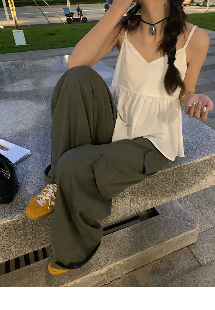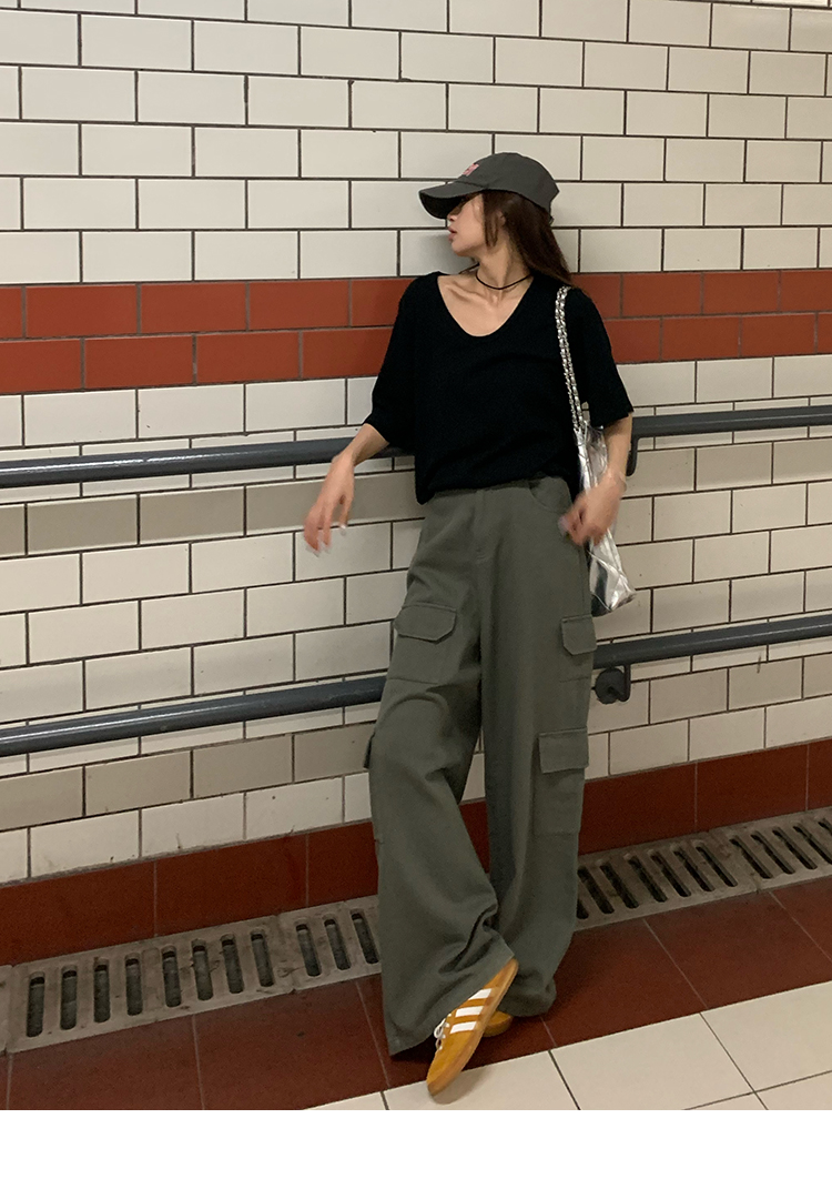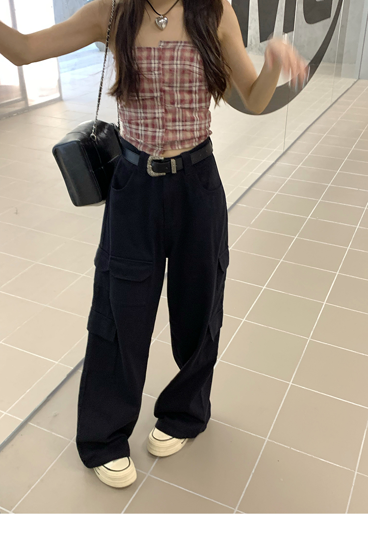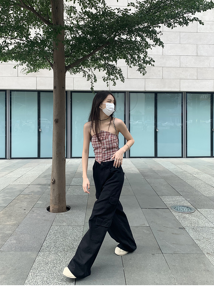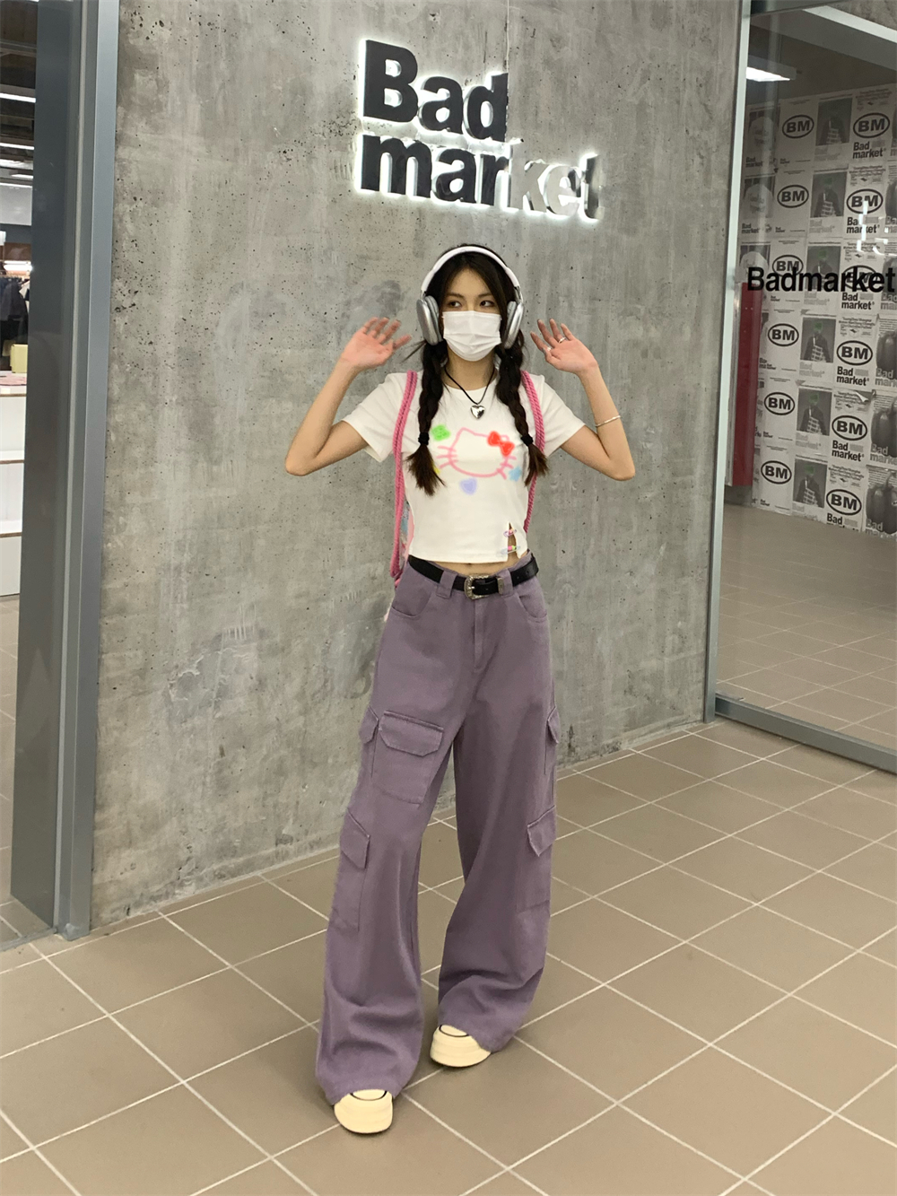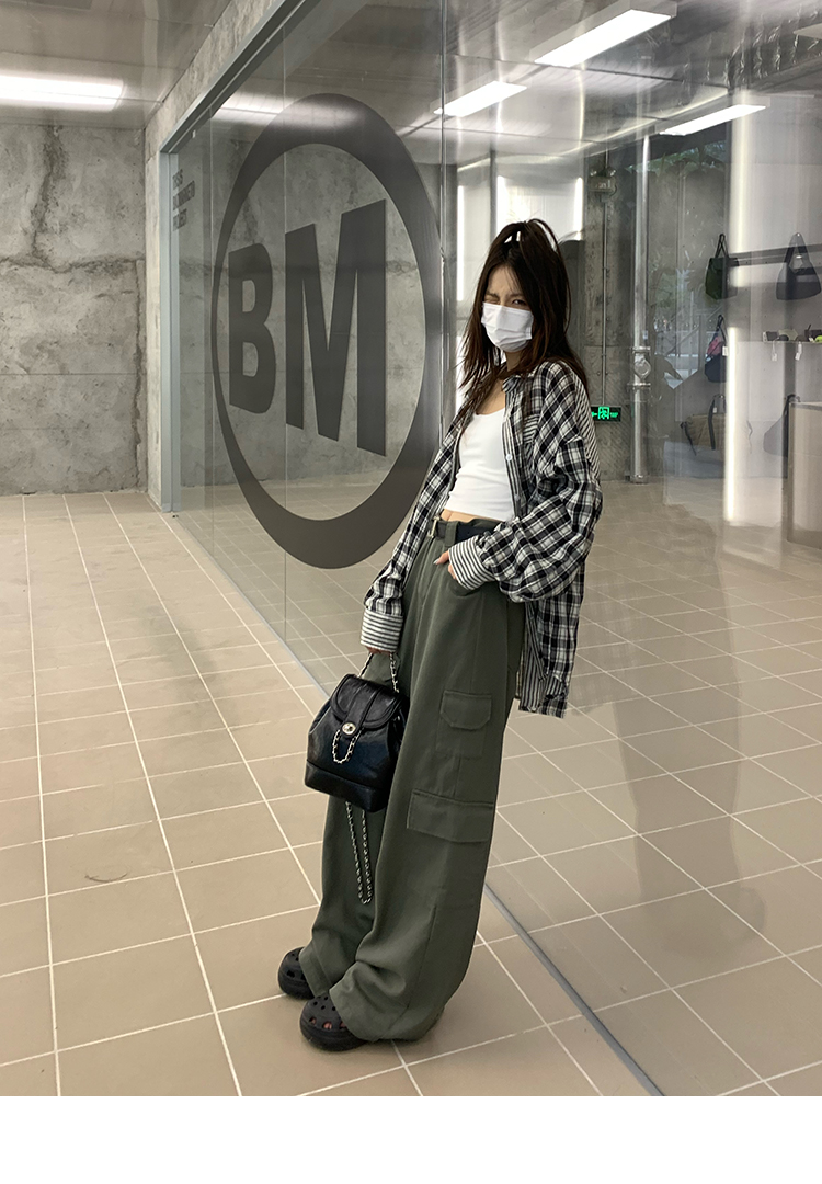 荒荒家 口袋工裝褲2023夏季新款港風寬鬆高腰機能闊腿休閒褲女ins