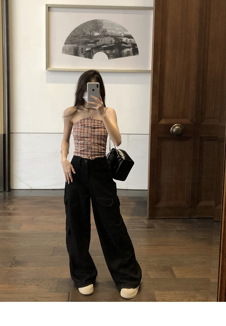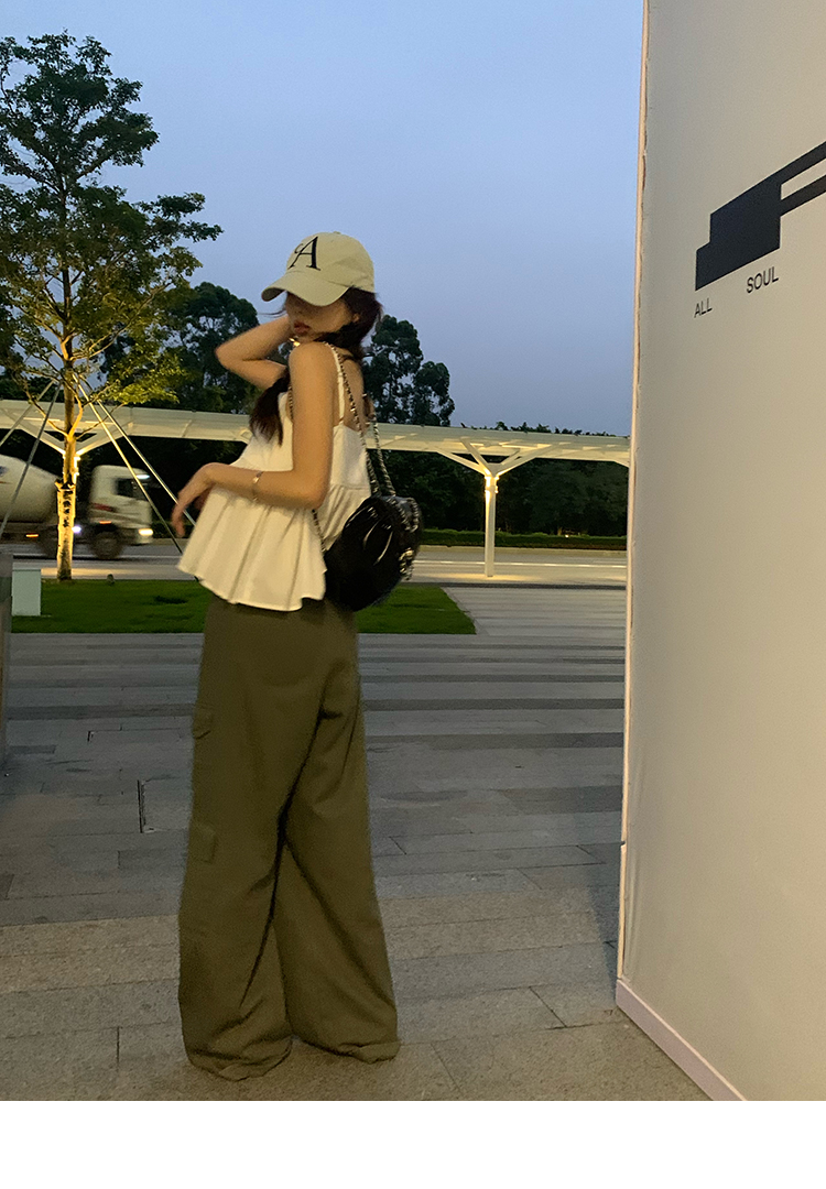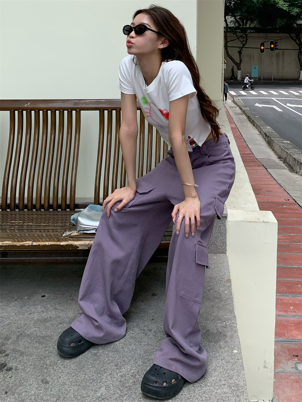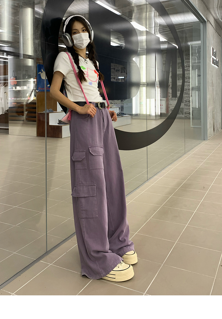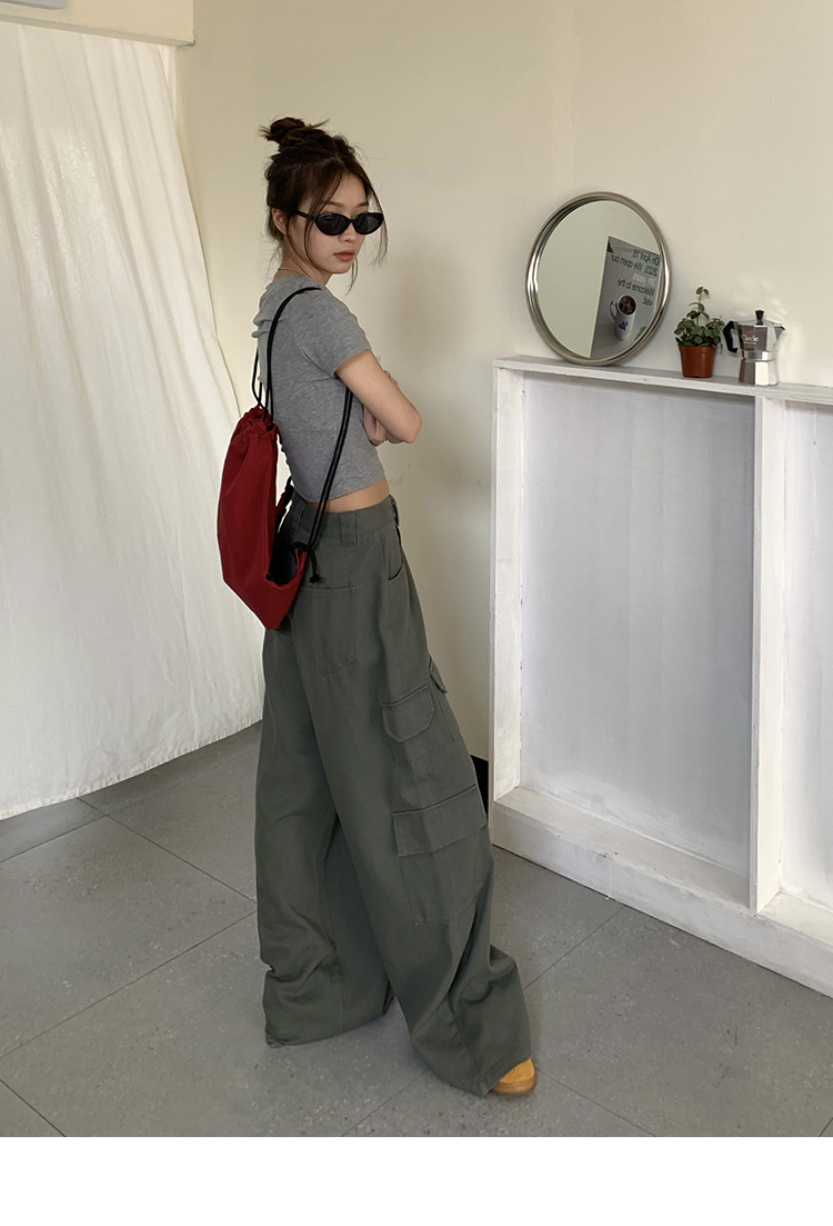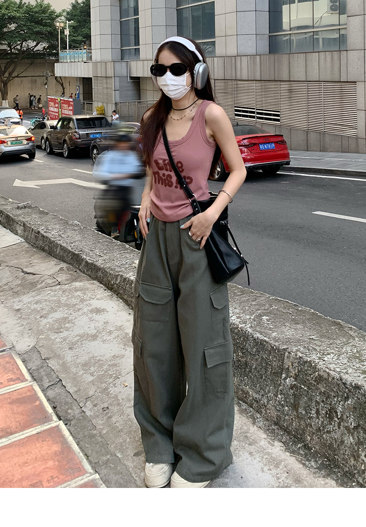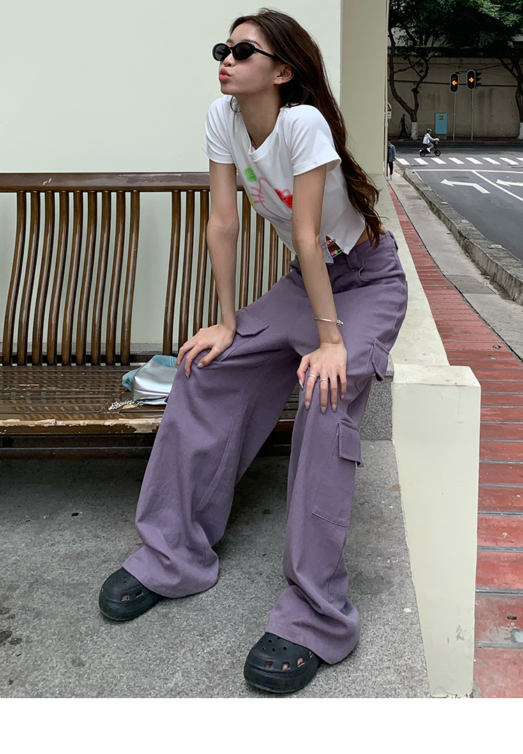 荒荒家 口袋工裝褲2023夏季新款港風寬鬆高腰機能闊腿休閒褲女ins