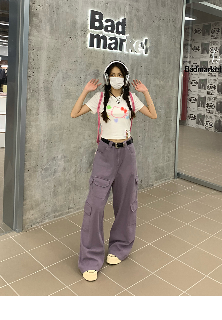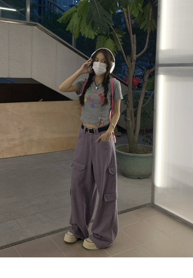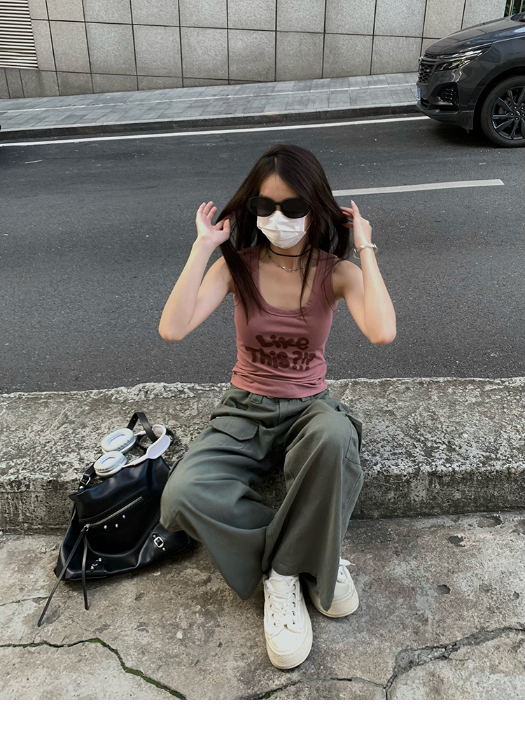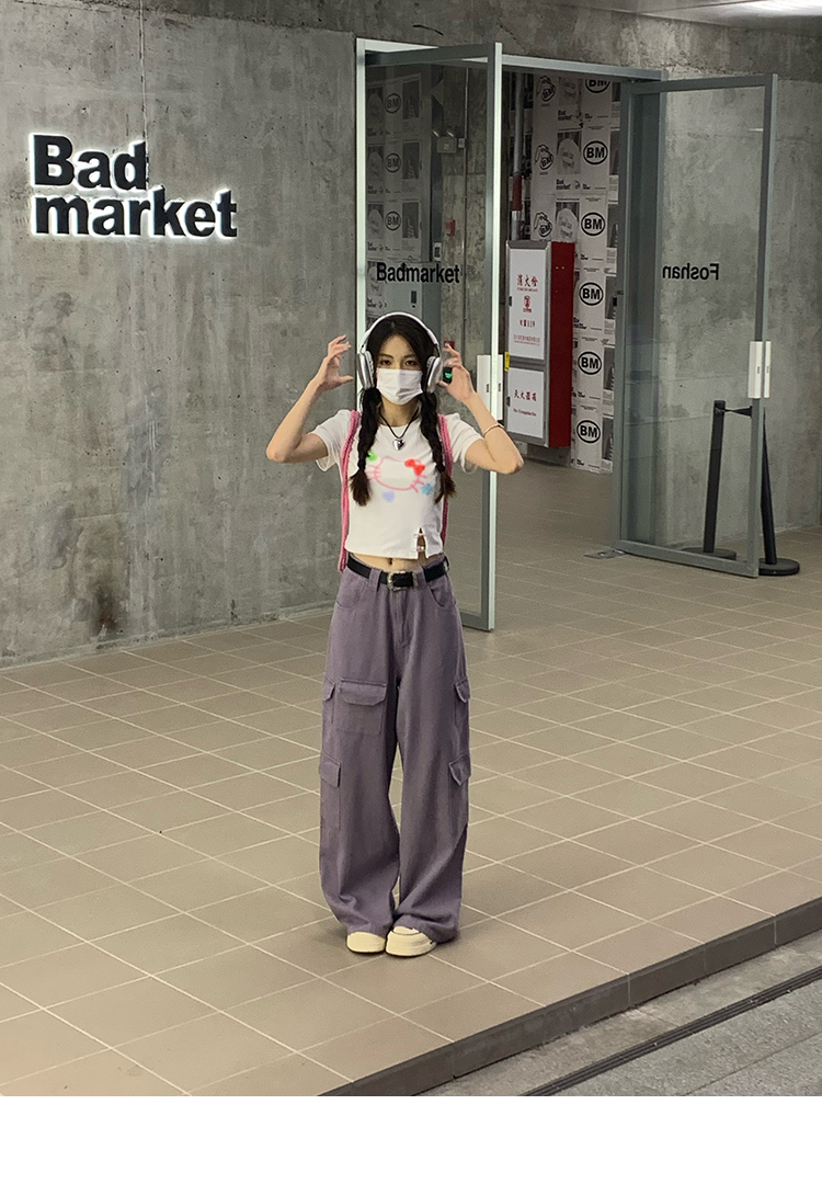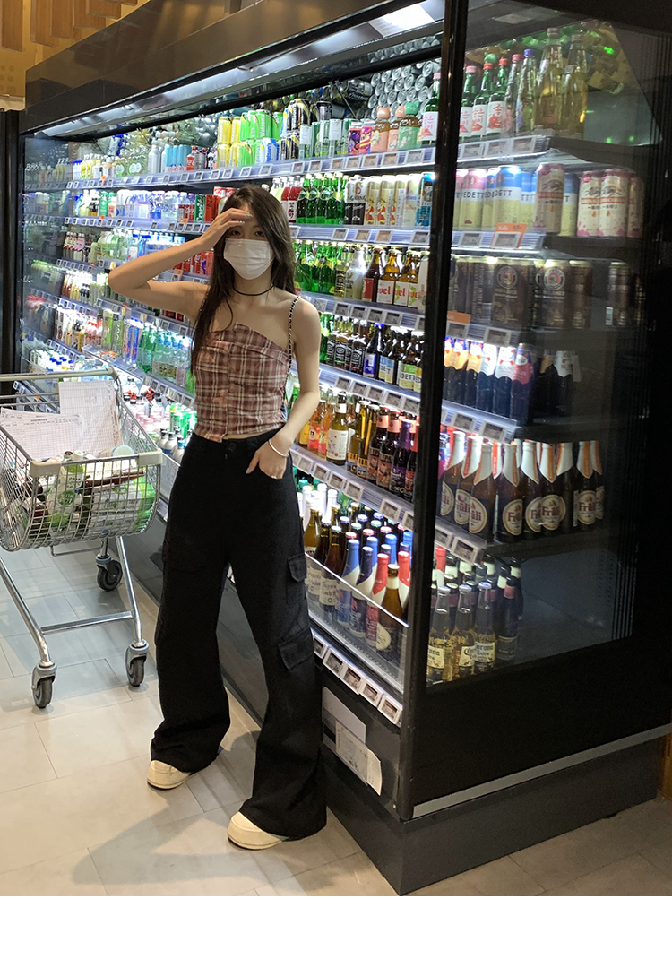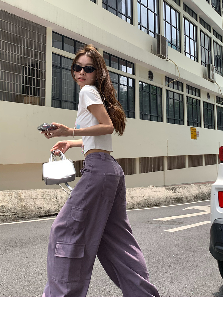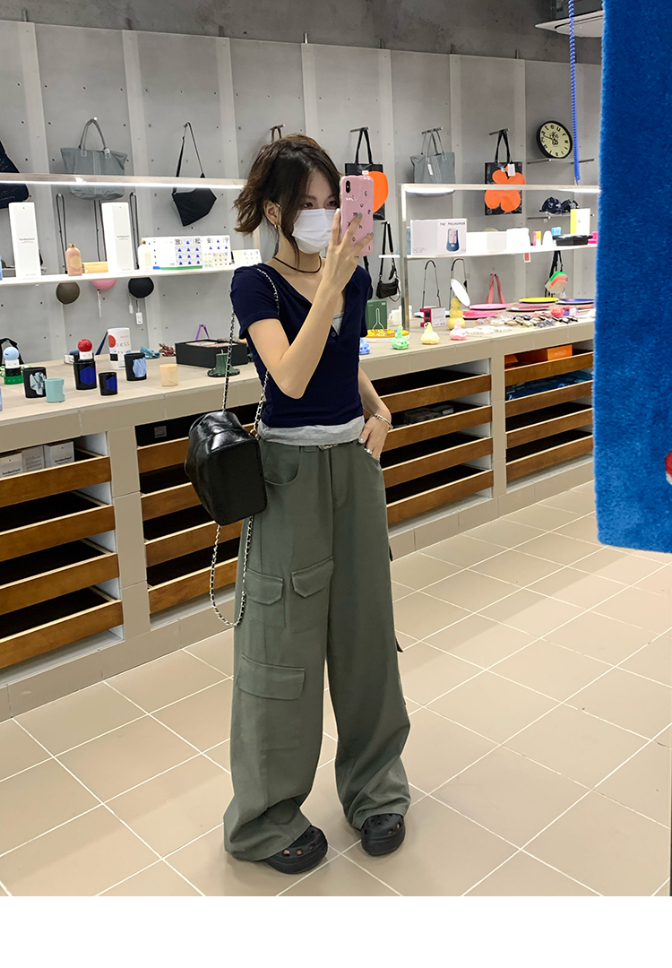荒荒家 口袋工裝褲2023夏季新款港風寬鬆高腰機能闊腿休閒褲女ins