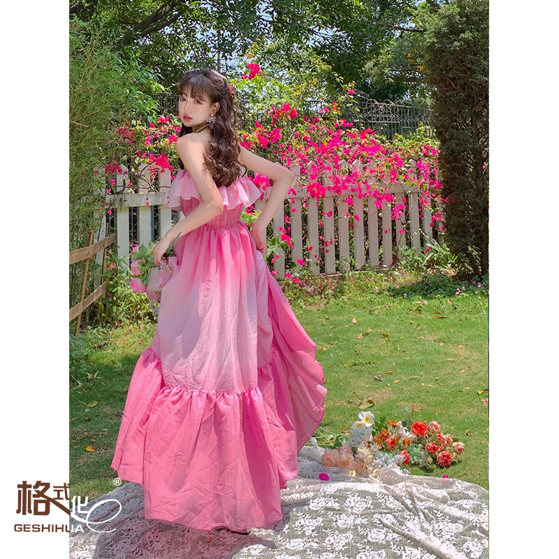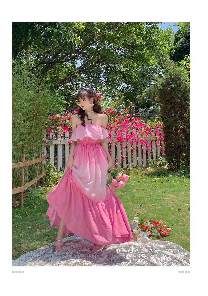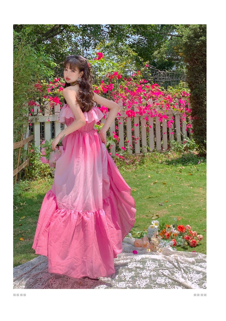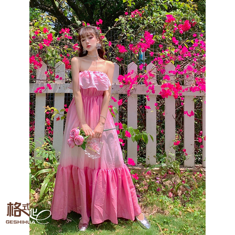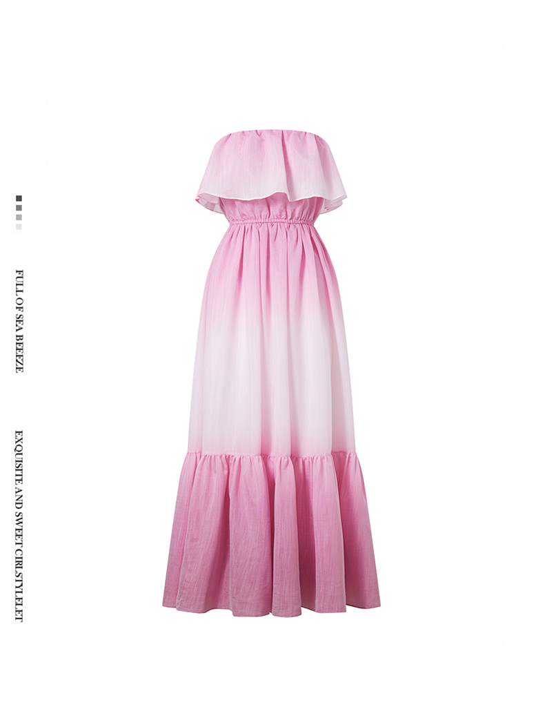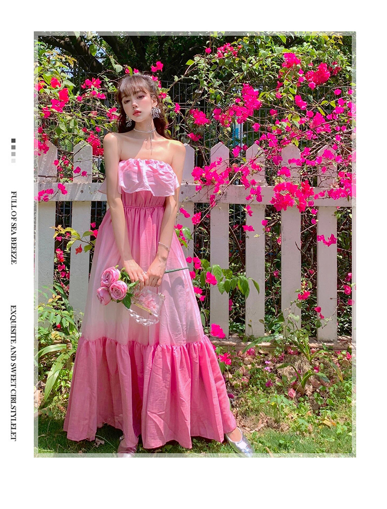 粉紅少女感漸層暈染一字肩荷葉邊洋裝別致絕美海邊沙灘抹胸長裙