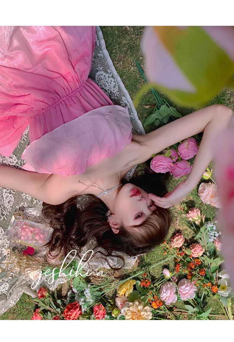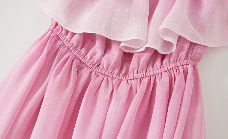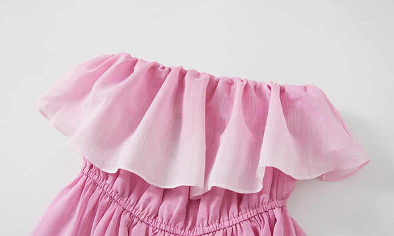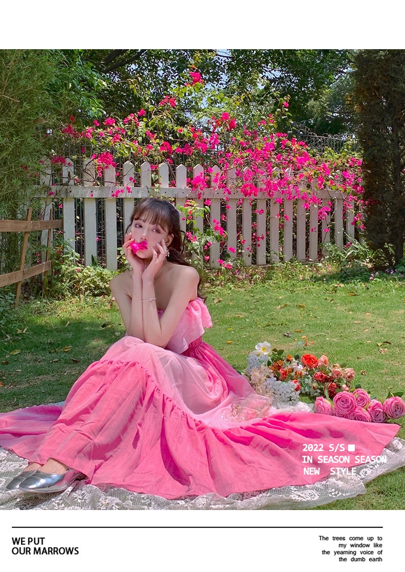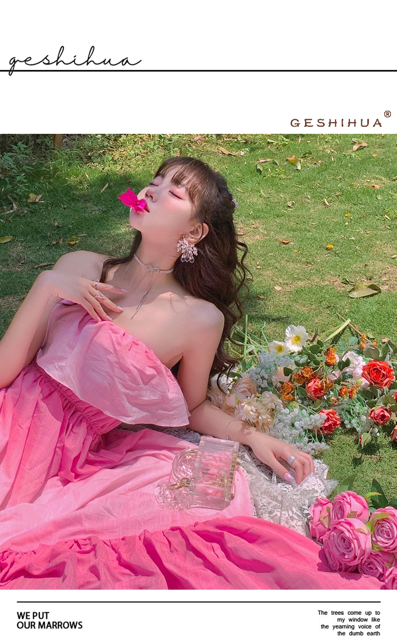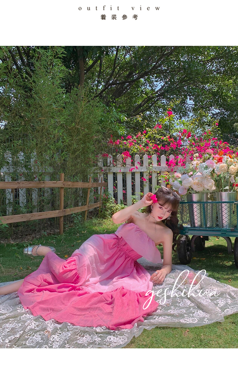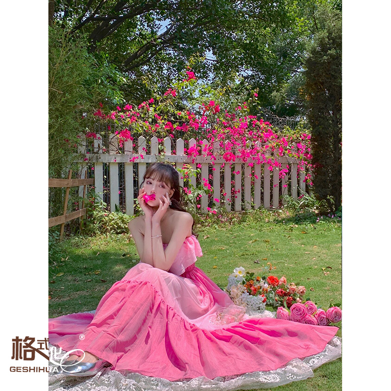 粉紅少女感漸層暈染一字肩荷葉邊洋裝別致絕美海邊沙灘抹胸長裙